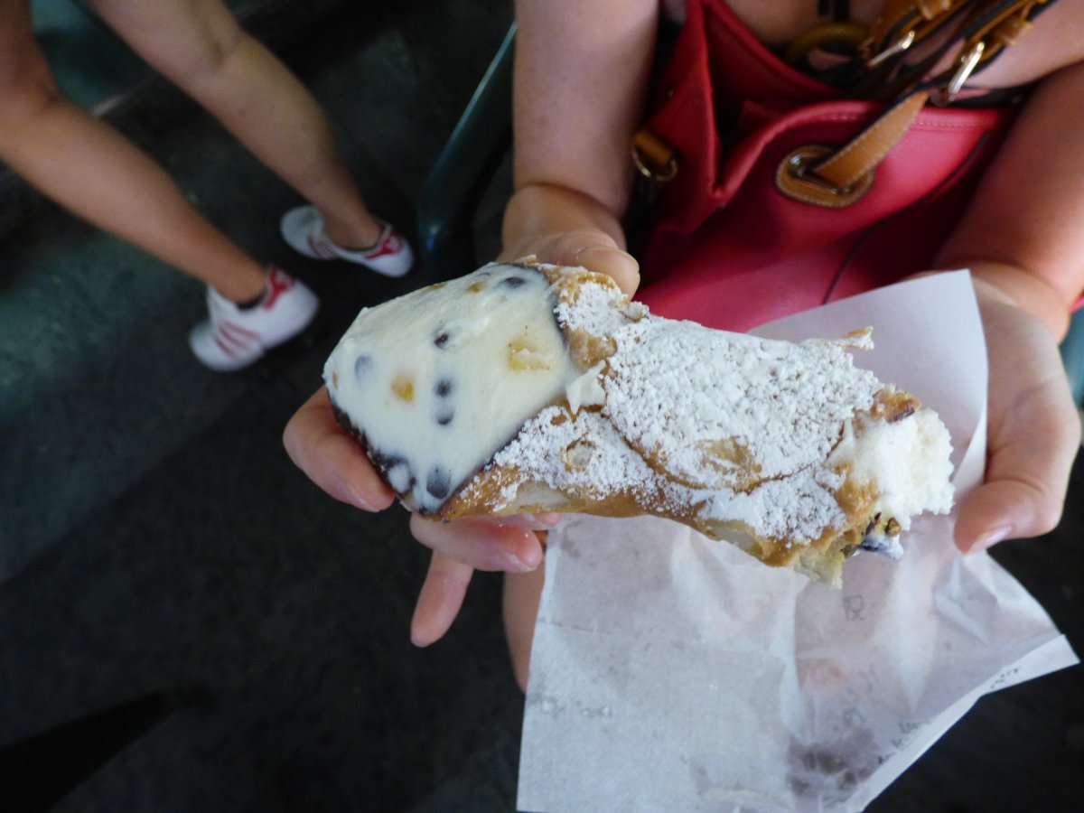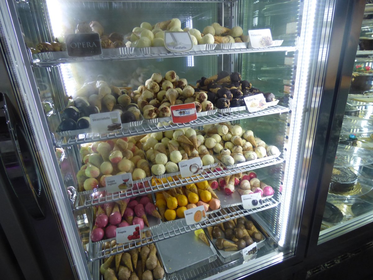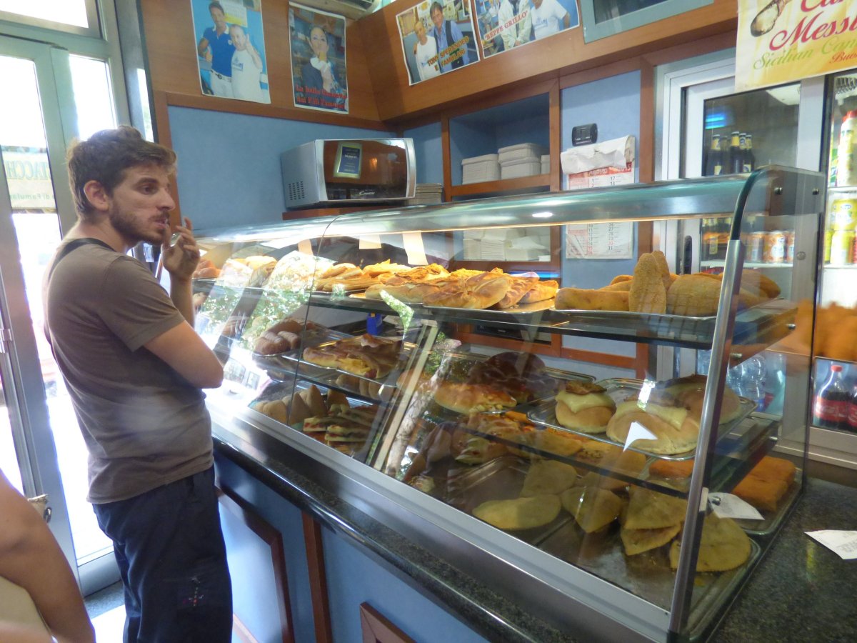 Každé ráno otec rodiny zajel do některé z mnoha pekáren a přivezl plný tác krémového pečiva – na fotce. Tyto obřadně rozkrájel a spolu s moka kávou jsme labužnicky před cestou na pláž ochutnávaly. Každý den jsme zašly do cukrárny a italská kamarádka objednala granitu – někdo by řekl, že je to naše ledová tříšť a proto by nás asi nenapadlo, si to objednat. Ale na Sicílii i v Kalábrii je to lahůdka – nejedná se o umělé příchutě, ale je to z ovoce, báječně vyšlehané. K tomu je kopec pravé šlehačky a čerstvě upečená brioška. Vzpomínám si také, že kamarádky z Itálie byly předtím u nás v Brně a někde jsme šly kolem ledových tříští – zaradovaly se, že vidí něco, co znají. No, jejich výraz ve tváří po ochutnání české granity – snažily se, co nejvíc to šlo, zamaskovat zklamání. Takže opravdu doporučuji ochutnat mlsounům pravou italskou granitu – se šlehačkou a teplou brioškou, prosím. V cukrárnách jsou ve vitrínách zmrzlinové výrobky mnoha různých příchutí (na fotkách), stejně jako zmrzlinové dorty, či jejich kousky – doporučuji rozhodně ochutnat. Další specifickou sicilskou dobrotou jsou cannoli – dělají se s mnoha různými náplněmi. Arancini – na Sicílii a v Kalábrii je spousta pekáren – je to vynikající, levné, mnoho druhů. Nejlepší jsou samozřejmě ty, které jsou např. u škol. Tak jak všude – vyplatí se pozorovat, kde je chumel místních. A v pracovních dnech se na mnoha místech (u pobřeží), ale ne na místech, určených obvykle pro turisty, nabízí polední menu – za pár euro s více chody (těstoviny, tousty, olivy, bruschetty), včetně nápoje, které je potřeba sdílet (pro 4 osoby jsme objednávali tuším jen 3 „meníčka“).