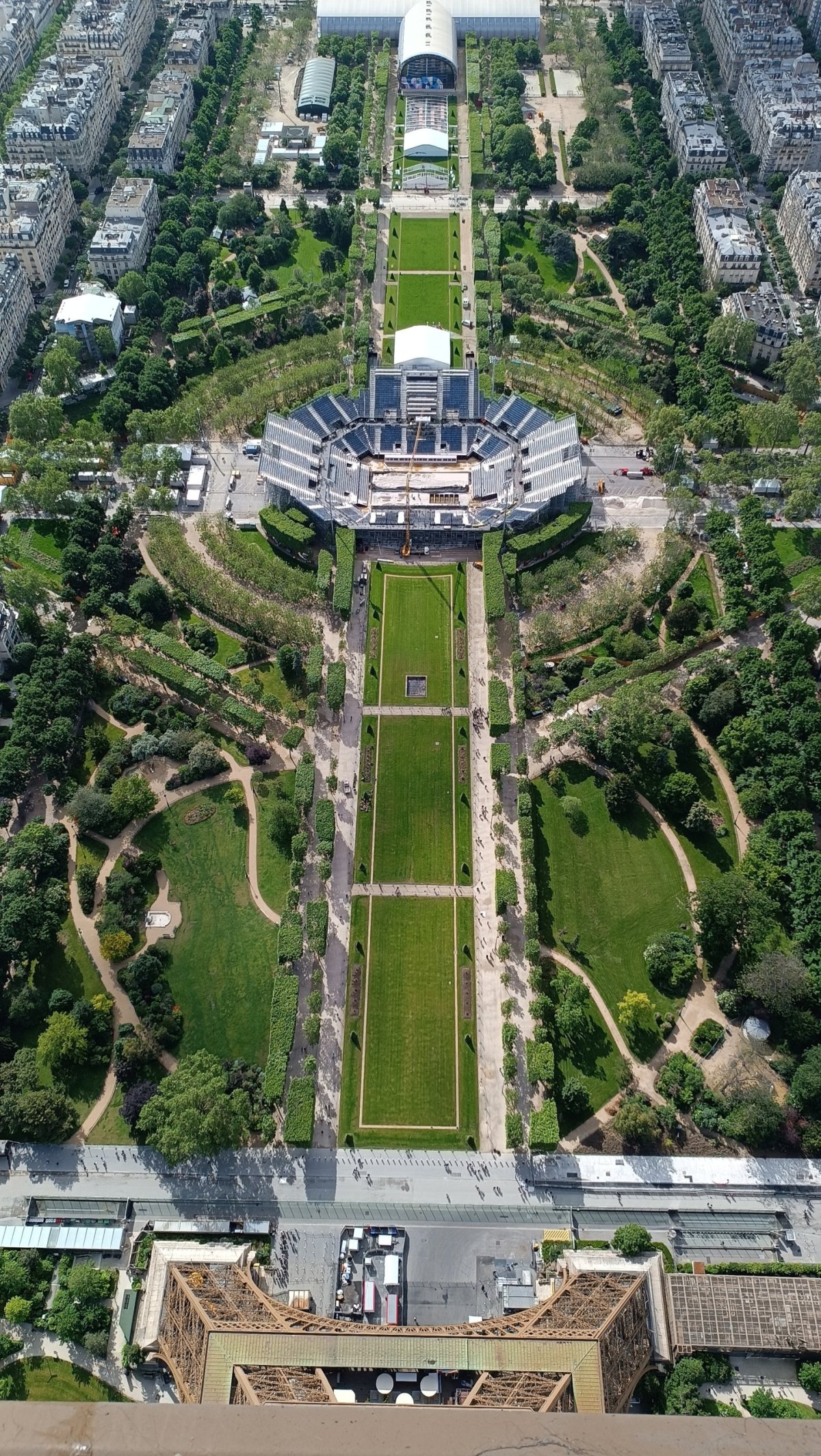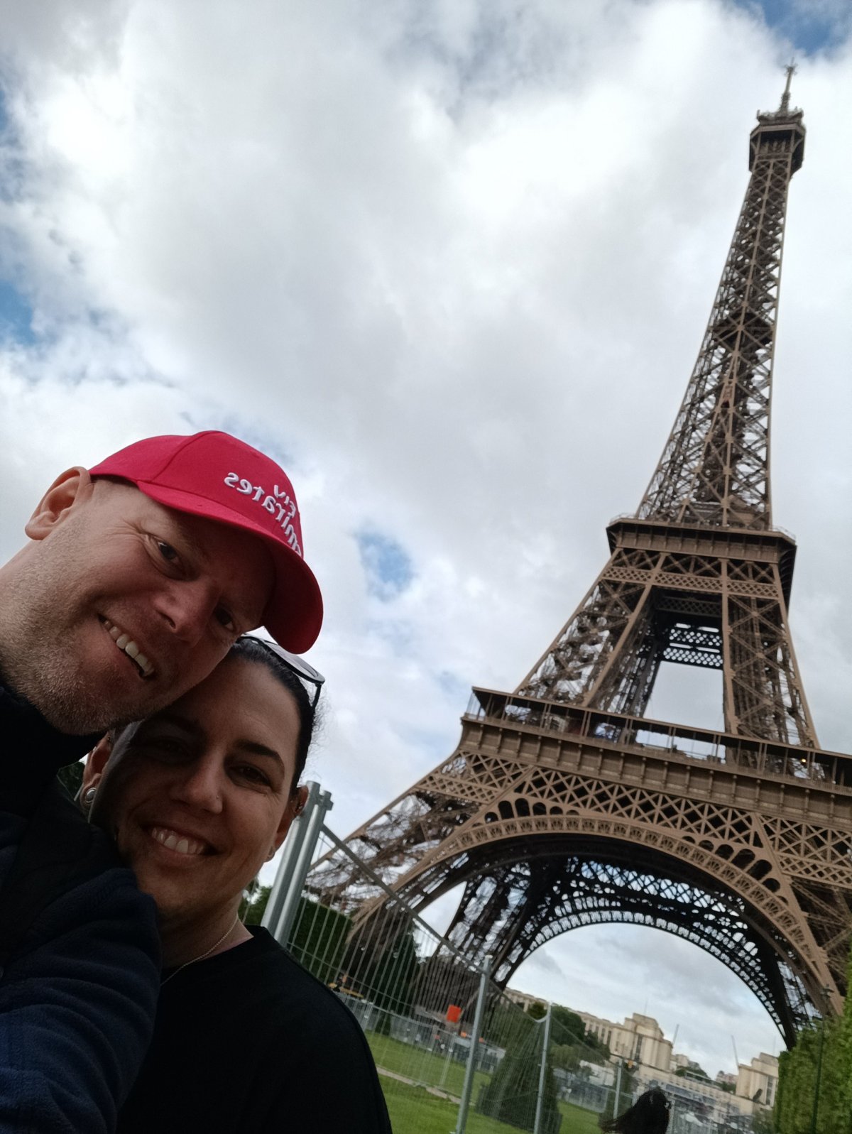 Vstáváme kolem sedmé. Z hotelu vycházíme přibližně v 8:15 a jdeme na metro. Z metra vystupujeme ve spodní části Martových polí a jdeme pěšky k Tour Eiffel. Vstupenky jsme si koupili v předstihu přes web. Téměř pod Eiffelovkou si dáváme snídani, máme salám, sýr a bagetu. Kousek před 9:30 přicházíme k Eiffelovce. Po bezpečnostní kontrole nastupujeme do výtahu a vyjíždíme do druhého patra. Zde se nezdržujeme nastupujeme do druhého výtahu a jedeme až na vrchol. Ív napadne, že bychom mohli výstup nahoru oslavit originálně a kupujeme si dvě skleničky Champagne. Rozhlížíme se na všechny strany a snažíme se poznat známé pamětihodnosti. Champagne nám trochu pomáhá. A kdybychom náhodou nějakou stavbu identifikovali špatně, bude nám to asi jedno. Celkem tu strávíme více než dvě a půl hodiny. Zastavujeme se ještě totiž ve druhém a prvním patře, kde si dáváme malý oběd z vlastních zásob.
