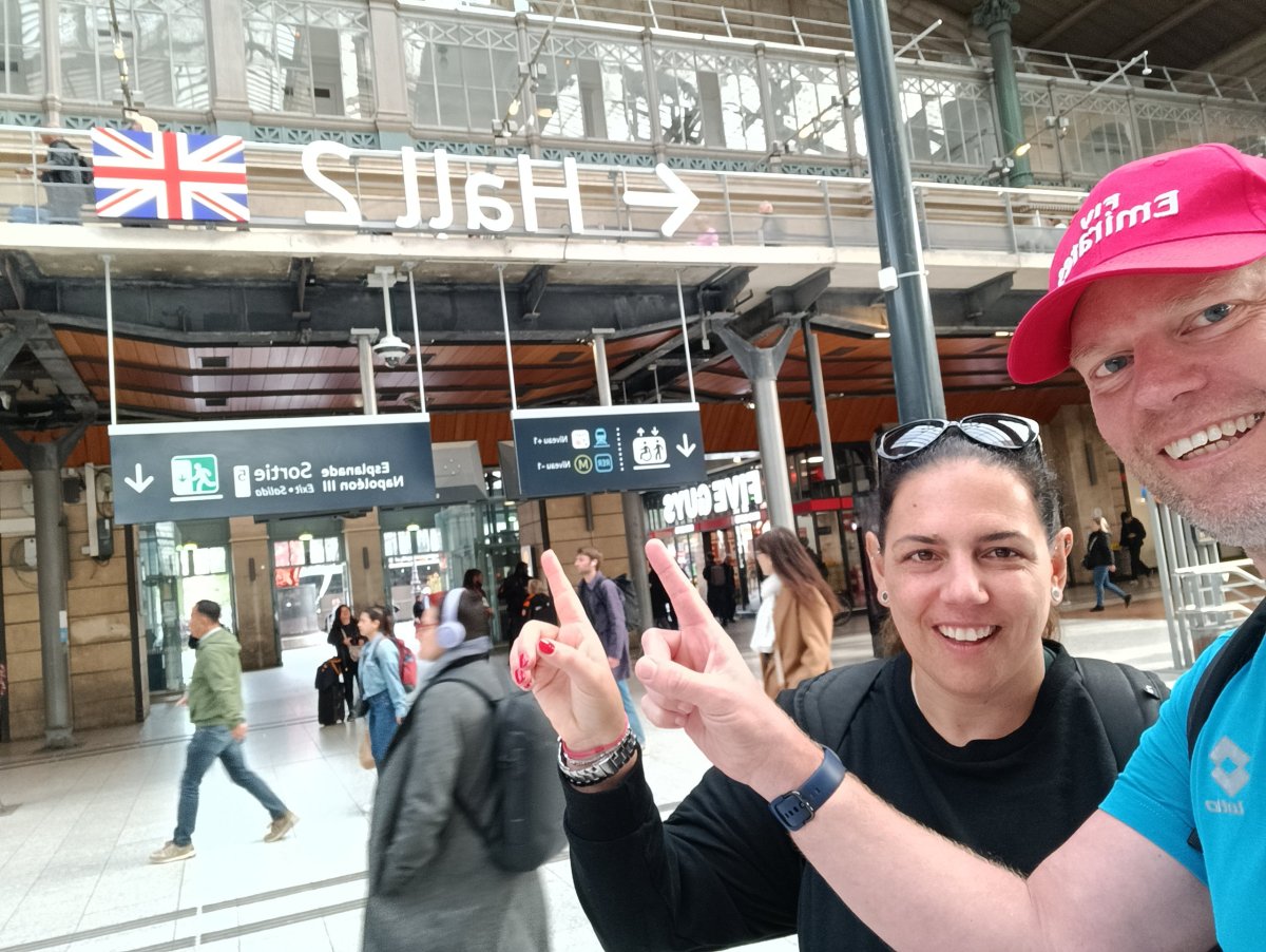 Ráno vstáváme kolem sedmé, ani nesnídáme a kolem třičtvrtě na 8 vycházíme z hotelu na stanici metra. Jedeme metrem na Gare du Nord, ale Ív zatím jen asi tuší, kam pojedeme. Hlavně čím. Přicházíme na hlavní nástupiště a já jí ukazuju TGV a říkám že tím nepojedeme, otáčím se a ukazuji na britskou vlajku v čele nástupiště. Ív má velkou radost. Jdeme se zařadit do fronty na celní a pasovou kontrolu. Procházíme bez větších problémů a máme cca hodinu čas, takže snídáme zásoby z předchozího dne. Máme sýr, paštiku a bagetu.