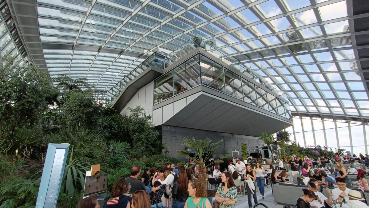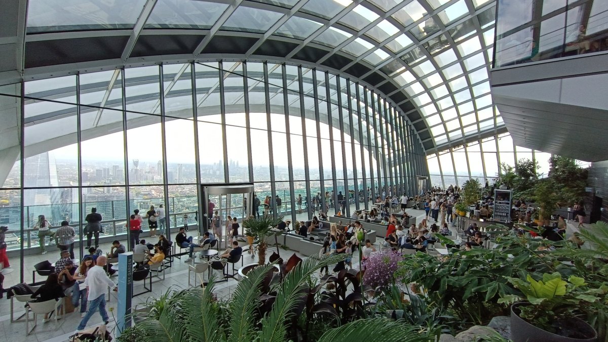 Přecházíme přes Hungeford bridge a sedáme na metro na Embankment a jedeme pět stanic na Monument, kde vystupujeme. Ke Sky garden přicházíme skoro na čas. Zde začíná naše malé dobrodružství. Nejdřív stojíme ve frontě s lístky, abychom se dozvěděli, že máme rezervaci na druhý den (Mari to věděl, ale myslel, že nám to projde). Poté si stoupneme do fronty bez rezervace a čekáme, zda na nás vyjde řada. Po chvíli čekání se dozvídáme, že pro dnešek se už bez rezervace nepouští. Mari nabízí naši rezervaci na druhý den nějakým Indům, kteří nám na oplátku kupují kávu, džus a vodu, přesto, že jsme za to nic nechtěli. Usedáme na lavičku a přemýšlíme, co dál. Přichází Ind, kterému Mari věnoval lístky na pondělí a vrací nám je s tím, že nás tam pustí. Znovu tedy jdeme ke vstupu a Mari vysvětluje, že nám přebukovali let a zítra už se tam nedostaneme. Znovu nás posílají do fronty s tím, že nás dnes pustí. Kávu necháváme dole a čekáme frontu. Nakonec se dovnitř dostaneme. Ze Skygarden máme úžasný výhled na celý Londýn. Po hodině a pár selfie si dáváme svačinu a darované pití a poté se vracíme dolů.