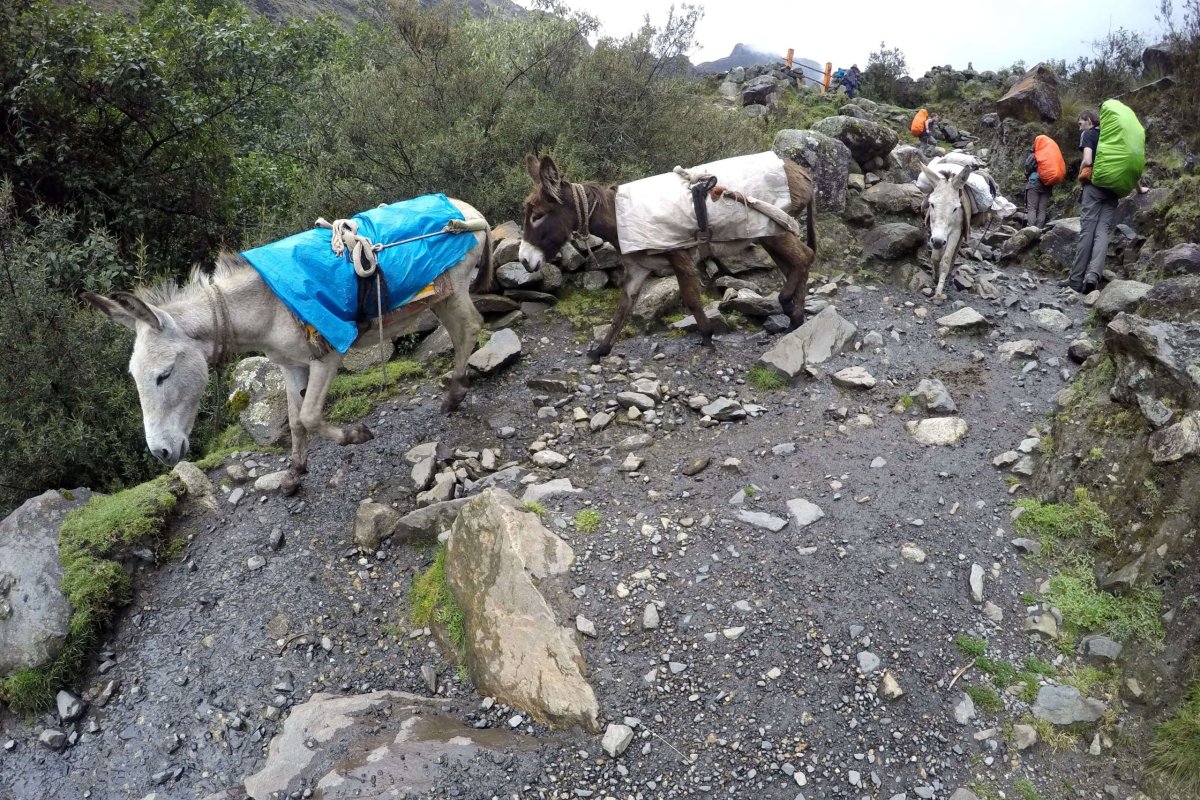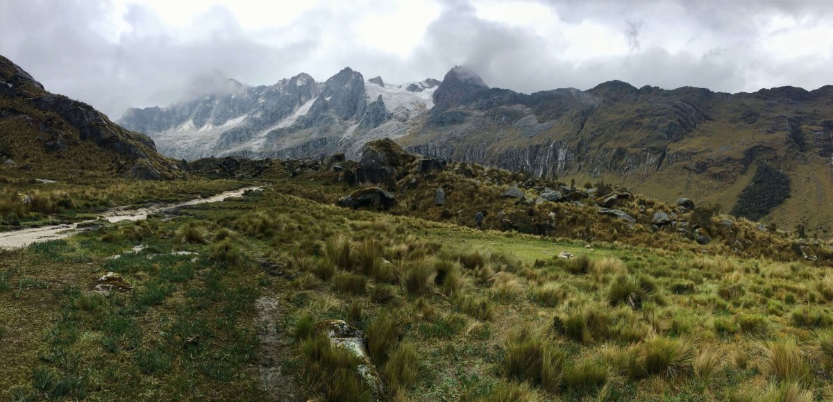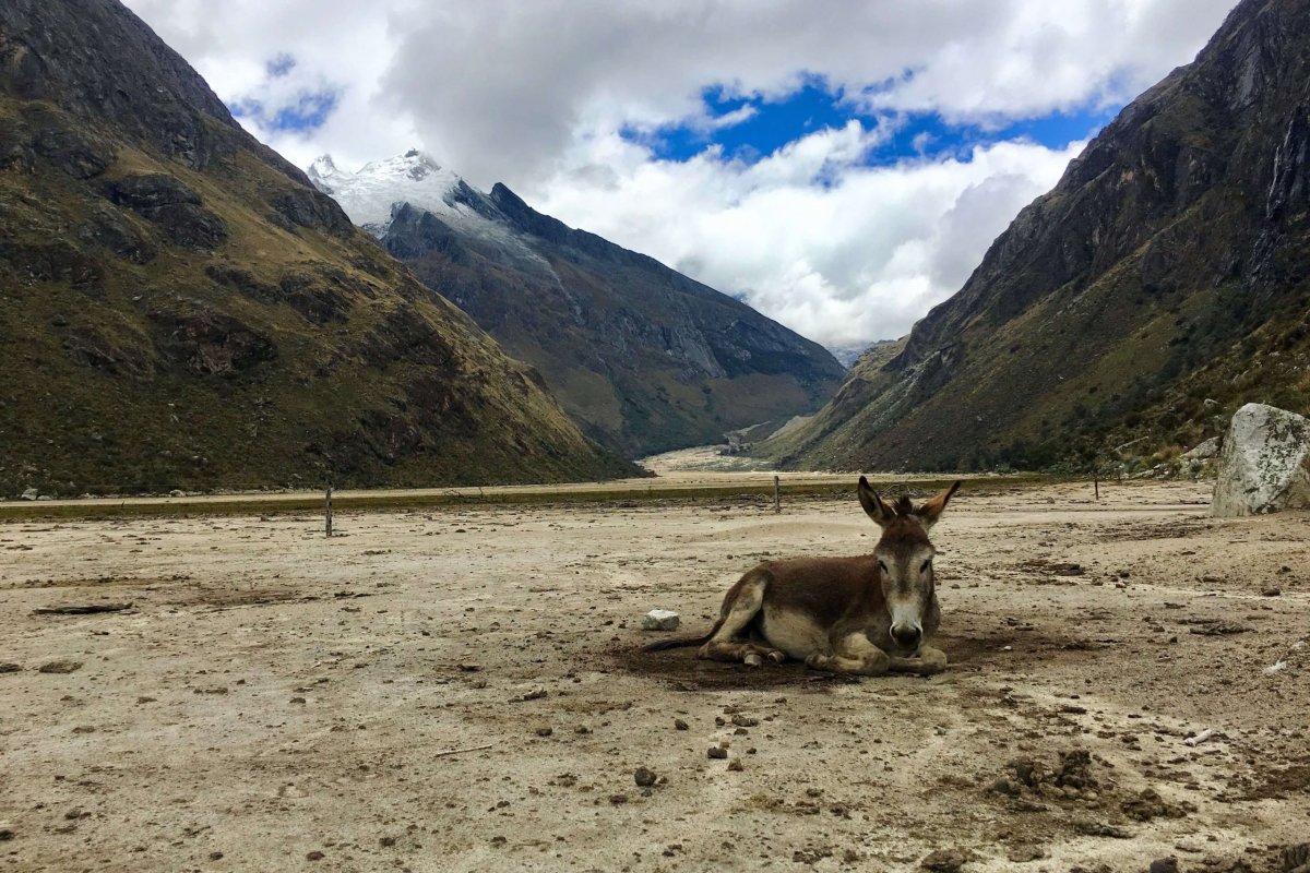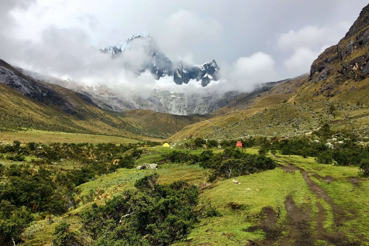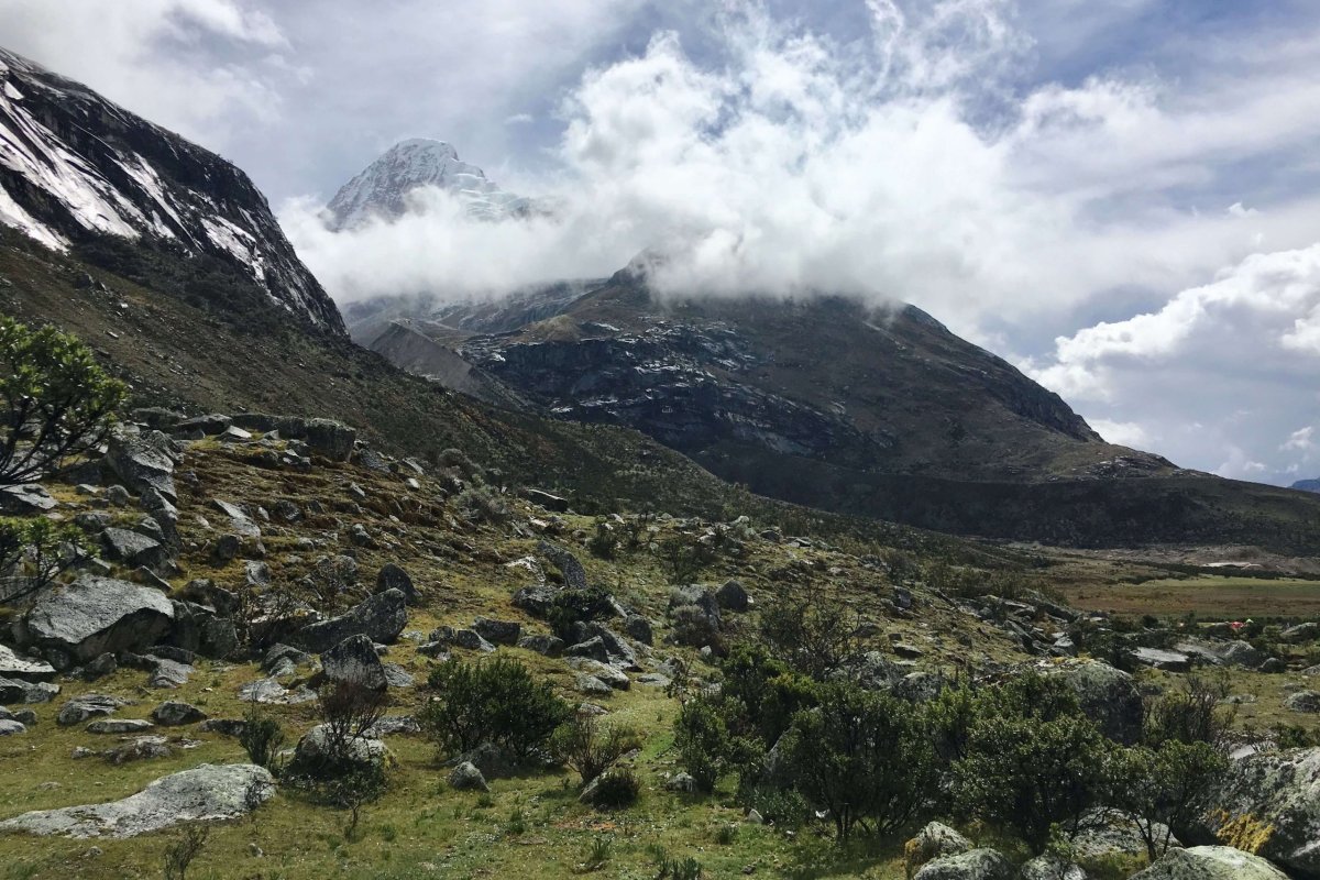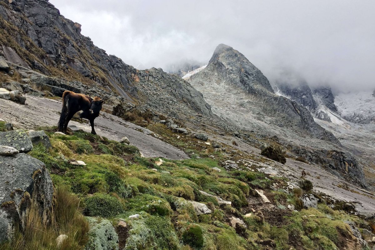 Den začíná opět brzkým budíkem. Bez snídaně vyrážíme chytit první colectivo v 5:00 směr Yungay. Colectivo je taková dodávka, kam neberou každého, kdo chce jet tím směrem a cestou staví a nabírá a vyhazuje další bez ohledu na kapacitu. Ale co, za hodinku jízdy platíme celkem 10 solů, tak fajn. V Yungay nás hned odchytne další dodávkář, a když naplní všechna místa, vydá se s námi směr Vaqueria, náš výchozí bod trasy. Z Yungay je to asi další 2 hodiny cesty, ale tentokrát už po nezpevněné cestě linoucí se do hor. Sice je pod mrakem, ale občas se nám otvírají úžasné pohledy na okolní vrcholky hor (včetně Huascaranu). Po chvíli se cesta začne pekelně klikatit a překonáváme sedlo ve výšce 4860 m.n.m! Od něj už to není daleko do Vaquerie. V téhle vesničce nás vysadí, my nandaváme krosny a dál už jdeme po svých. První dva kilometry jsou z kopce, to jen tak na trénink, ale stejnak je znát, že jsme v nějakých 3600 m.n.m. Pak už začne stoupání a každý krok je vykoupen utrpením, děláme pauzy každých pár metrů a do toho střídavě nandaváme a sundaváme pláštěnky dle aktuálního počasí. Průběžně se střídáme s dalšími dobrodruhy, kteří dorazili s námi. S francouzským párem, který jde sice o něco pomaleji, ale vůbec nezastavují a nefotí a s jedním Francouzem – indiánem, který po chvíli vzal čáru a už sme ho neviděli. Po pár kilometrech míjíme boudu se vstupem do národního parku, tak se zapisujeme,ale vstupné po nás nechtějí, prý ho zaplatíme až na konci. Cesta pokračuje údolím s pastvinami, kde míjíme lamy, osly a hlavně krávy. Okolní kopce jsou většinou v mracích a jedinou světlou chvíli je pauza na tortillu. Odpoledne už jsme přesáhly výšku 4000 metrů a po téměř 15 kilometrech v nohách začínáme cítit únavu. Špatně se dýchá a zastavujeme co pár kroků. Do toho se cesta začíná zvedat a nám dochází síly. Naštěstí kolem půl čtvrté docházíme do tábořiště vyznačeného v mapě (je až překvapující, že všechny cesty, hory, tábořiště a zajímavosti jsou vyznačeny v mapách maps.me, takže mapy od Alpenverainu jsme ani neotevřeli). Francouzi už mají postavený stan a my jim kazíme romantiku a stavíme ho o pár metrů vedle. Na to, že ho stavíme poprvé a že zas začíná pršet, nám to celkem jde, akorát jsme ho postavili vchodem z kopce a museli spát hlavami u sebe na užší straně stanu. Když zas přestalo pršet, jdem vařit večeři, nedovařená čínská polívka to spraví (celkově je těžké sehnat tu v obchodech instantní jídla, a jak jsme později zjistili, i instantní polévka se dle návodu má tři minuty vařit, takže zalití horkou vodou z jet boilu to nedá). Jelikož jsme dost unavení, jdeme spát už někdy v šest. Druhý den by to mělo být ještě náročnější…