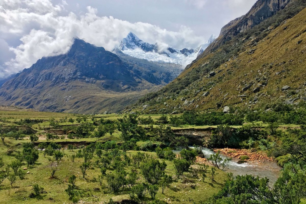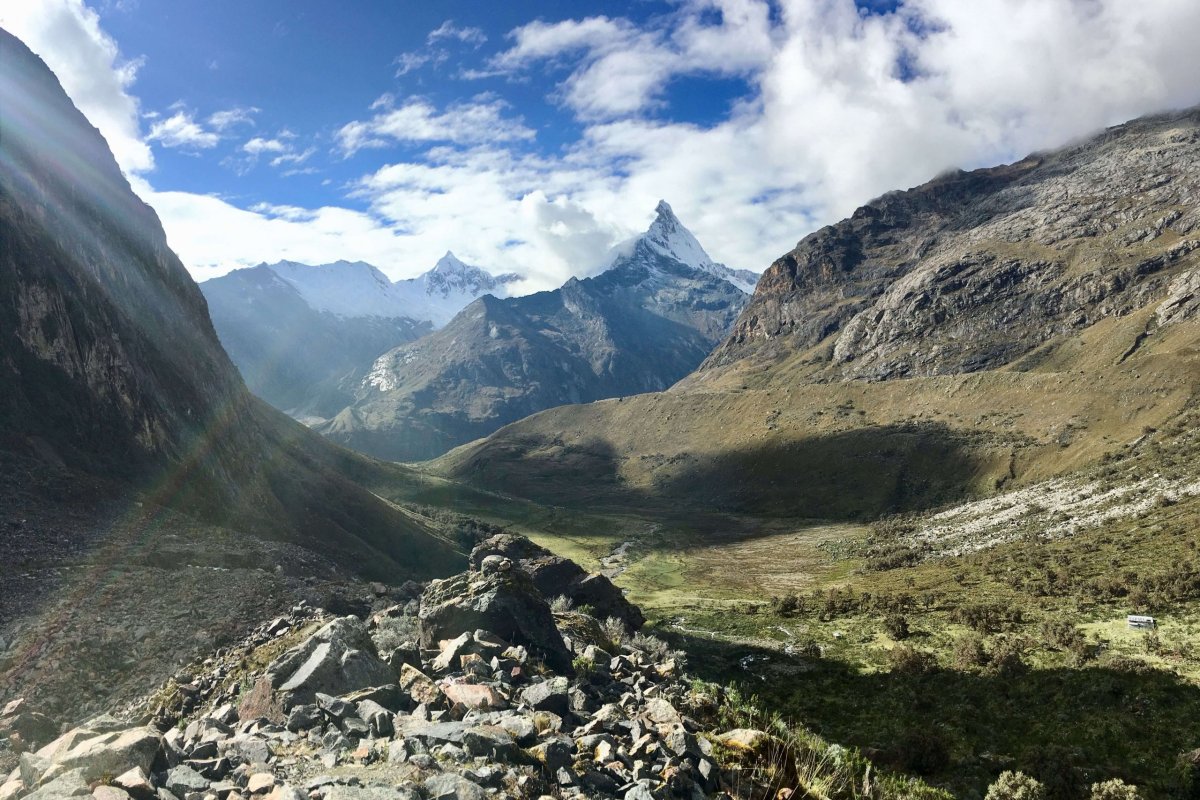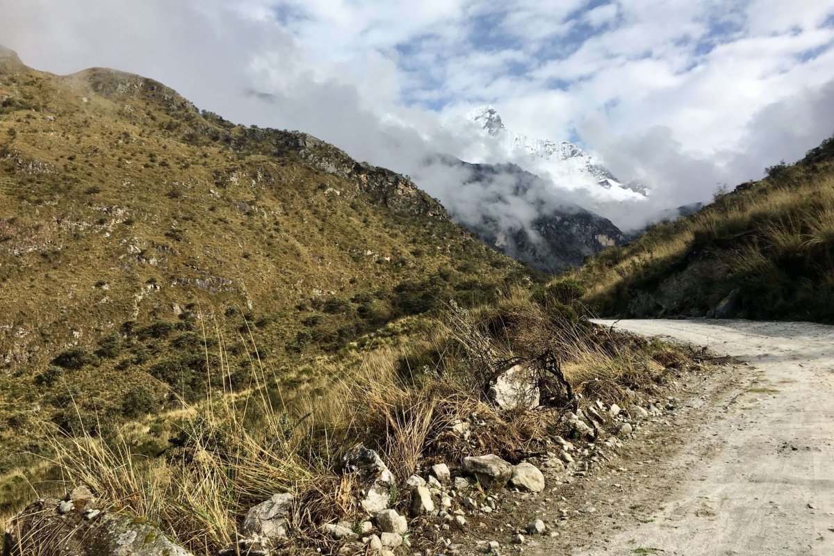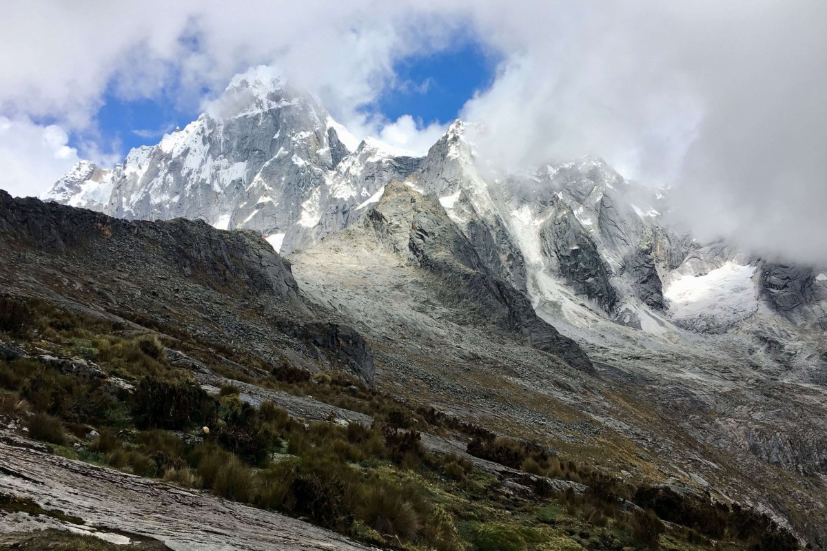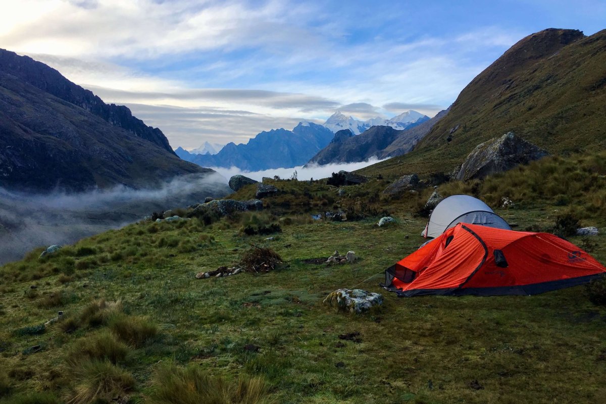 Den začíná opět brzkým budíkem. Bez snídaně vyrážíme chytit první colectivo v 5:00 směr Yungay. Colectivo je taková dodávka, kam neberou každého, kdo chce jet tím směrem a cestou staví a nabírá a vyhazuje další bez ohledu na kapacitu. Ale co, za hodinku jízdy platíme celkem 10 solů, tak fajn. V Yungay nás hned odchytne další dodávkář, a když naplní všechna místa, vydá se s námi směr Vaqueria, náš výchozí bod trasy. Z Yungay je to asi další 2 hodiny cesty, ale tentokrát už po nezpevněné cestě linoucí se do hor. Sice je pod mrakem, ale občas se nám otvírají úžasné pohledy na okolní vrcholky hor (včetně Huascaranu). Po chvíli se cesta začne pekelně klikatit a překonáváme sedlo ve výšce 4860 m.n.m! Od něj už to není daleko do Vaquerie. V téhle vesničce nás vysadí, my nandaváme krosny a dál už jdeme po svých. První dva kilometry jsou z kopce, to jen tak na trénink, ale stejnak je znát, že jsme v nějakých 3600 m.n.m. Pak už začne stoupání a každý krok je vykoupen utrpením, děláme pauzy každých pár metrů a do toho střídavě nandaváme a sundaváme pláštěnky dle aktuálního počasí. Průběžně se střídáme s dalšími dobrodruhy, kteří dorazili s námi. S francouzským párem, který jde sice o něco pomaleji, ale vůbec nezastavují a nefotí a s jedním Francouzem – indiánem, který po chvíli vzal čáru a už sme ho neviděli. Po pár kilometrech míjíme boudu se vstupem do národního parku, tak se zapisujeme,ale vstupné po nás nechtějí, prý ho zaplatíme až na konci. Cesta pokračuje údolím s pastvinami, kde míjíme lamy, osly a hlavně krávy. Okolní kopce jsou většinou v mracích a jedinou světlou chvíli je pauza na tortillu. Odpoledne už jsme přesáhly výšku 4000 metrů a po téměř 15 kilometrech v nohách začínáme cítit únavu. Špatně se dýchá a zastavujeme co pár kroků. Do toho se cesta začíná zvedat a nám dochází síly. Naštěstí kolem půl čtvrté docházíme do tábořiště vyznačeného v mapě (je až překvapující, že všechny cesty, hory, tábořiště a zajímavosti jsou vyznačeny v mapách maps.me, takže mapy od Alpenverainu jsme ani neotevřeli). Francouzi už mají postavený stan a my jim kazíme romantiku a stavíme ho o pár metrů vedle. Na to, že ho stavíme poprvé a že zas začíná pršet, nám to celkem jde, akorát jsme ho postavili vchodem z kopce a museli spát hlavami u sebe na užší straně stanu. Když zas přestalo pršet, jdem vařit večeři, nedovařená čínská polívka to spraví (celkově je těžké sehnat tu v obchodech instantní jídla, a jak jsme později zjistili, i instantní polévka se dle návodu má tři minuty vařit, takže zalití horkou vodou z jet boilu to nedá). Jelikož jsme dost unavení, jdeme spát už někdy v šest. Druhý den by to mělo být ještě náročnější…