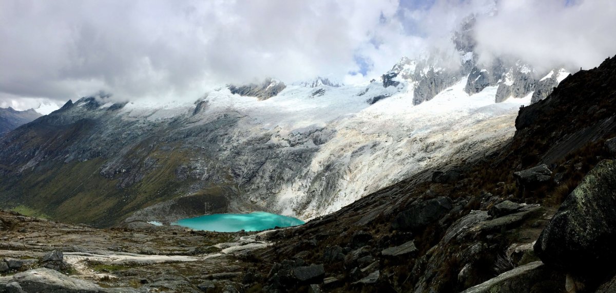 Po této laguně přišlo asi to nejhorší, co jsme kdy zažili – stoupání do Ponte Union. Ať se jdou všechny půlmaratony a horské výzvy klouzat, stoupat do této výšky je fakt zážitek. Asi nikdy předním jsme neměli tep 180 šest hodin a nemuseli po deseti krocích zastavovat a vydýchavat se. No trvalo to tak dvě tři hodinky, ale nakonec jsme se tam vyskrabali, Kuba o něco dříve, Tom plival krev víc.. Ale ten výhled ze sedla na druhou stranu, kde nebylo tolik zataženo, wau, tohle se fakt vyplatilo. Blankytně modrá laguna pod ledovcovými vrcholky a nekonečné údolí v dáli.