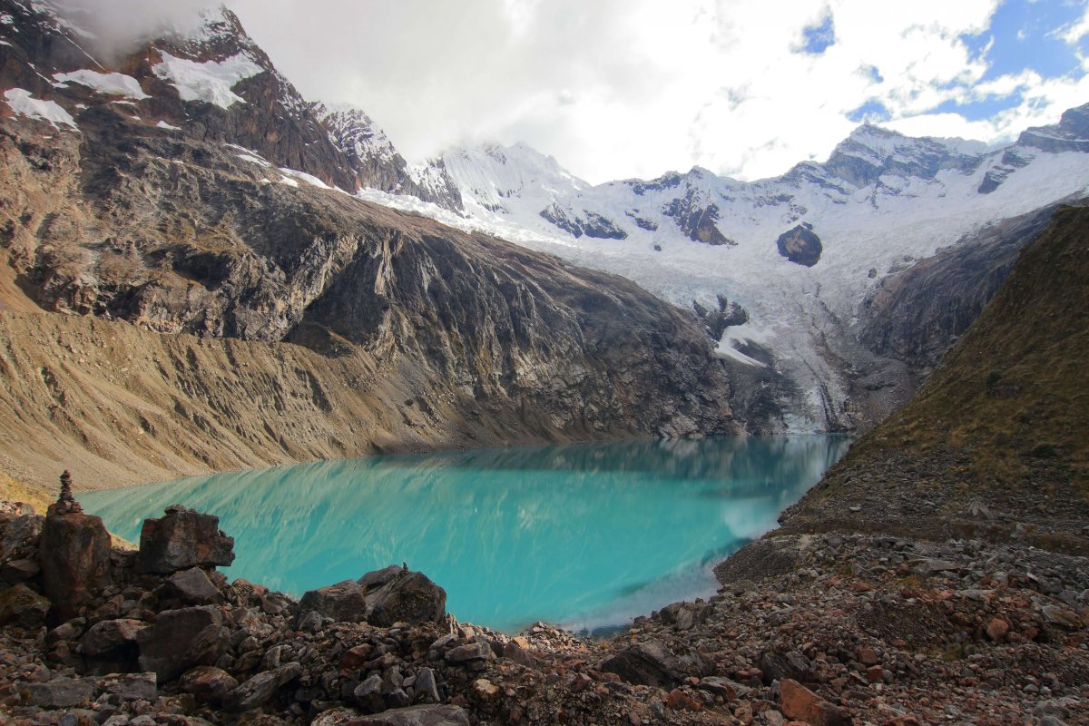 Podle plánu vstáváme už před šestou. Střecha ani nebyla třeba, protože v noci stejnak nepršelo. I tak to ale byla zase divoká noc. I když jsme byli ve spacáku asi 11 hodin, naspali jsme asi 4. Ráno vaříme čaj, kaše a kafe a sušíme zadejchanej stan. Kolem sedmý vyrážíme nahoru k laguně. I když jdeme na lehko, výstup je to pěknej. A stojí za to. Laguna je fakt krásná, zrovna na ní zpoza vracholků začíná svítit sluníčko a ledovec, kterej až do ni sjíždí je úchvatnej. Z mraků občas vykouknou i vrcholky okolních hor Quiaritu a Alpamayo (který nás teda trochu zklamalo, na pohledech je focený z druhý strany a tam vypadá líp). Stejnak je to ale asi nejhezčí okamžik našeho výletu.