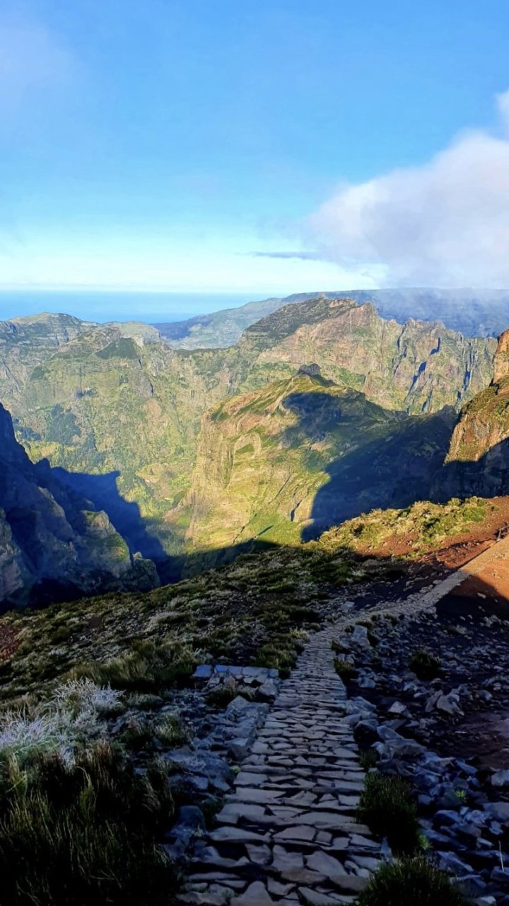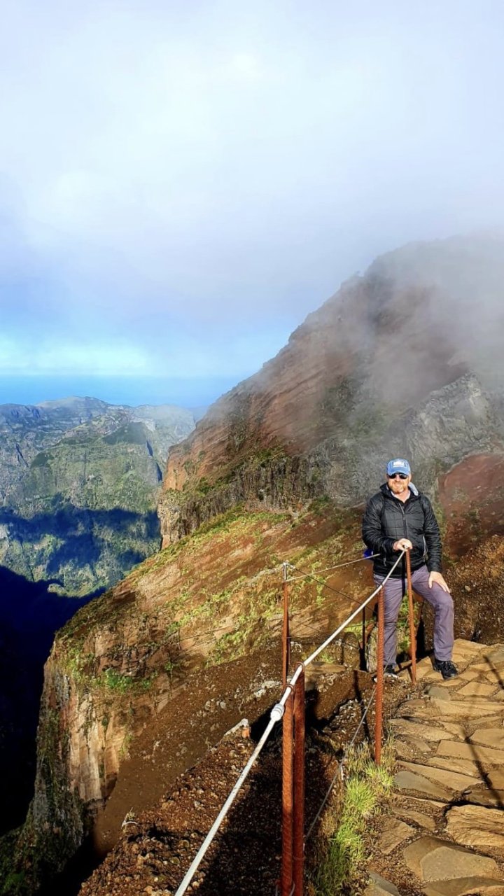 ✌️🌏 Dnešním naším cílem je leváda Lombardo do Monhio-Novo. Už jsme na ostrově jako doma. Pavel se jako rodilý Madeiřan proplétá v místním provozu , všude je blízko. Z východu na západ po hlavní silnici podél pobřeží je to něco přes hodinu a stejným směrem vyrážíme s úderem deváté hodiny i dnes. Po půlhodině jízdy , kdy už nám připadá, že za ty tři dny známe každý strom, každý banánovník a každou skálu zabočíme u Ribeira Brava směrem do hor, do vnitrozemí. Projíždíme půvabné vesničky, míjíme domky posazené na hřebenech a zastavíme u kostela, kde nám navigace hlásí počátek dnešního tripu. Trasa vede po vrstevnici kopce směrem od moře . Jsme tu úplně sami a jsme nadšeni jakým krásným krajem si to šlapeme. Rokle pod námi, všude spousta zeleně, tu a tam v kopcích domek nebo políčko. Je nám záhadou jak se k nim místní dostanou. Rogalem, podzemním tunelem? Odlehlá místa a složitý přístup. Pěšiny jsou místy sotva metr široké , žádné zabradlí a pod námi pár stovek metrů sráz. Docházíme na konec, odpočíváme a v tom si to k nám šinou dva kluci okolo 25 let. Spustí anglicky, přízvuk slušný. Odpovídám česky a trefa. Chvíli pokecáme rodným jazykem a už hledáme kudy jít nazpět, jelikož stejnou trasou nemíníme jít. Vracíme se pěšinou posazenou a 100metrů výše v úbočí kopce. Druhou dnešní zastávkou je Funchal, stotisícové hlavní město Madeiry. Leží u Atlantiku na úpatí hor. Parkujeme u přístavu a už ho vidíme! Cristiano Ronaldo v nadživotní velikosti z bronzu. Nejslavnější žijící rodák, po kterém je pojmenováno i místní letiště. Jdeme k němu, okolo jen pár lidí. Cristiano je zcela jistě celosvětovým idolem, což prozrazuje zde na místě zcela vyhlazená přední část trenýrek od jeho fanynek a asi i fanoušků...Projdeme starou část města nad přístavem a hledáme kde se navečeříme. Načež prakticky současně zvoláme „Camara de Lobos!" Skáčeme do auta a s vidinou skvělé kuchyně jedeme 15 kilometrů nazpět.