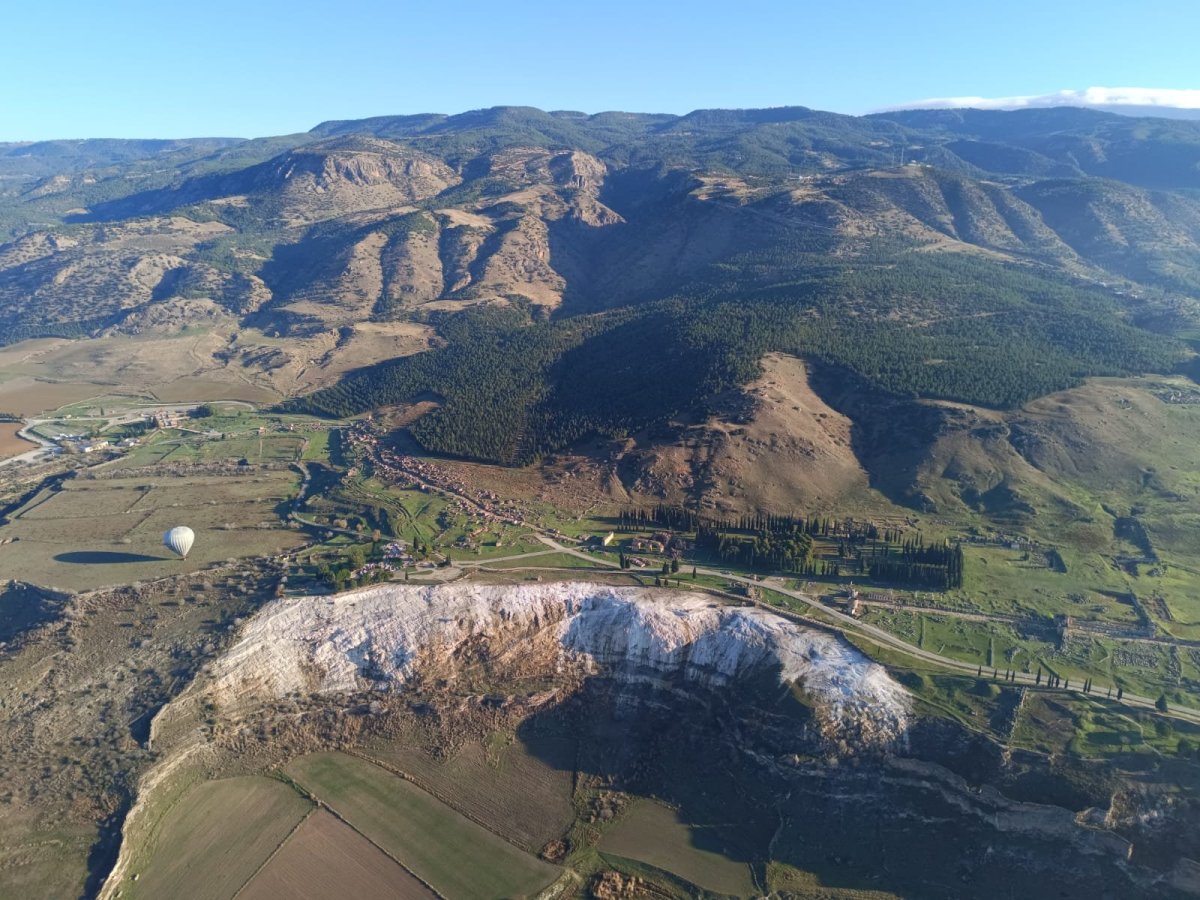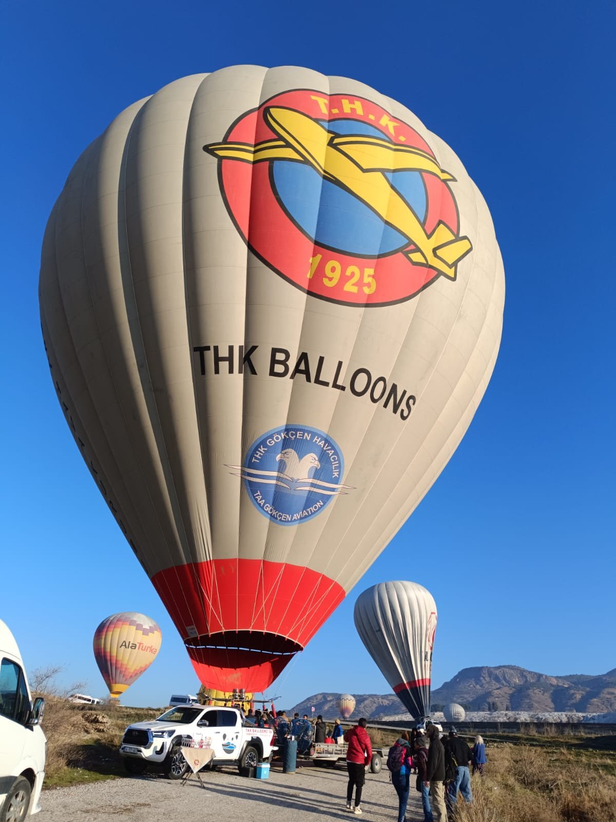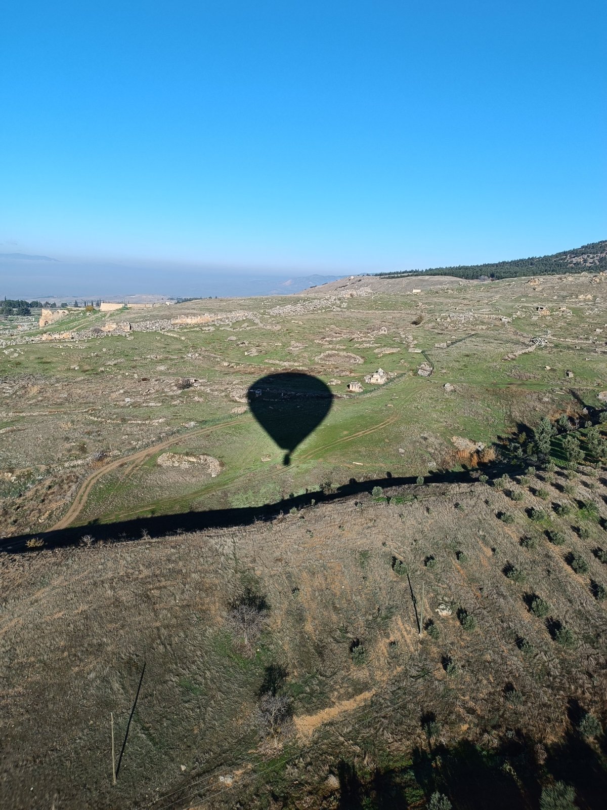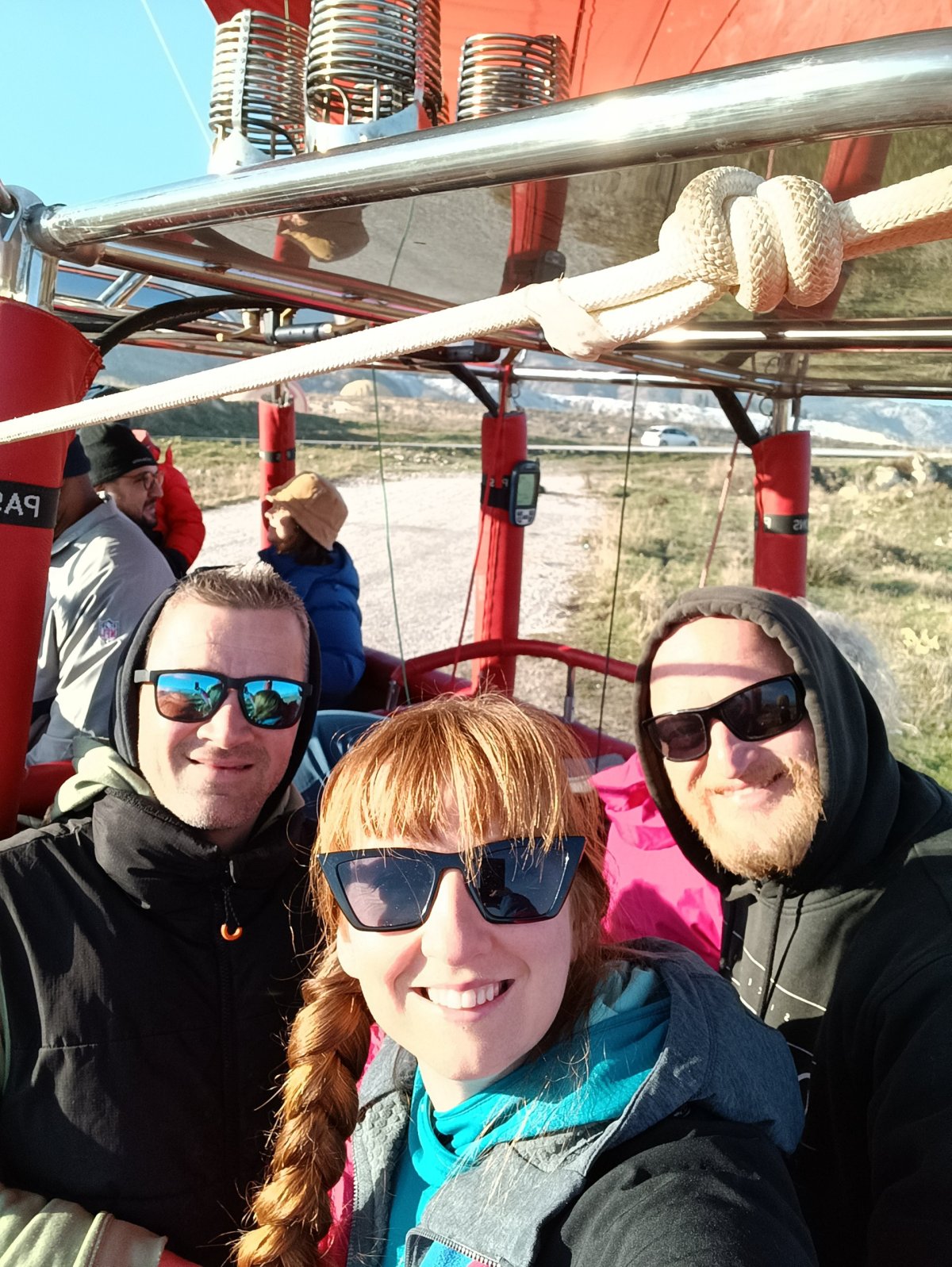 Ráno neprobíhá úplně podle plánu. Stojíme před hotelem a sledujeme, jak nebe zaplňují létající balóny. Koukáme na ně ze země, ačkoliv už jsme měli být 30 minut v autobusu. Budím majitele hotelu. Uklidňuje mě, že autobus přijede. Nakonec s hodinovým zpožděním přijel. Cestou jsme zastavili ještě pro několik turistů a v celkovém počtu 16 lidí zastavujeme před vchodem u Pamukkale a sledujeme, jak se balóny vznáší nad námi. Průvodce nám ukazuje, že támhle ve vzduchu je náš balón. Je fakt veliký. Po chvilce jsme nahnáni zpět do autobusu a jedeme k místu, kde přistává balón. Nastupujeme a vzlétáme. Je zima. Ejzí má na sobě neopren - zapomněl si s sebou vzít bundu. Já mám na sobě vše, co jsem měla sbaleno. Během letu si děláme selfíčka. Felda natáčí na GoPro. Pilot nás fotí na 360°kameru, ale za poslání fotek na WhatsApp si pak řeknou 30€, tak to ať si je nechá. Po přistání jedeme do hotelu sbalit věci, vyzvedáváme oběd s sebou a jdeme na prohlídku Pamukkale.