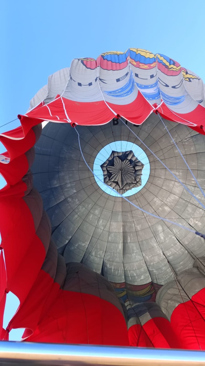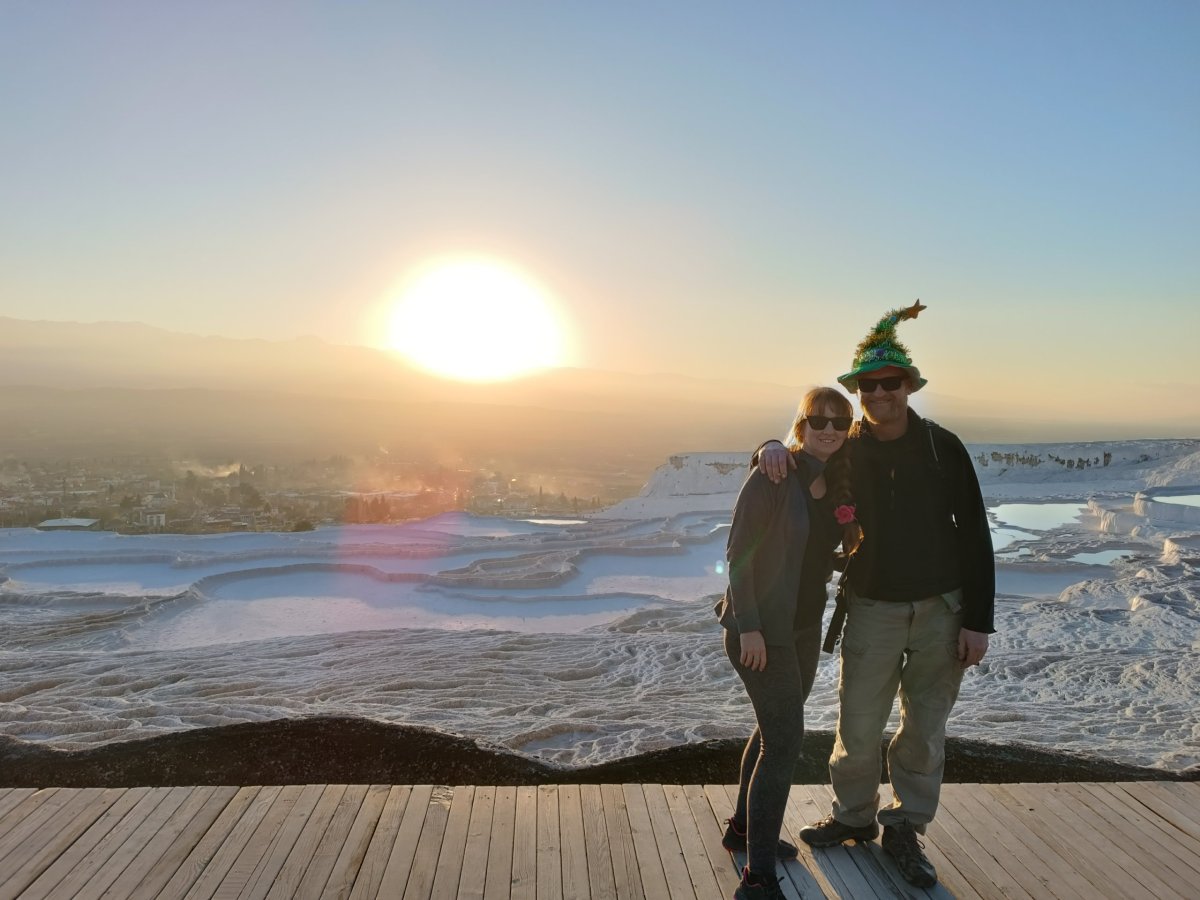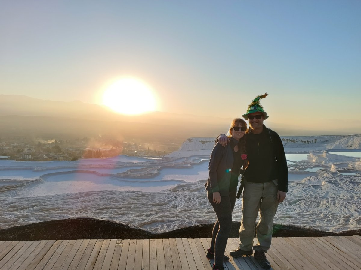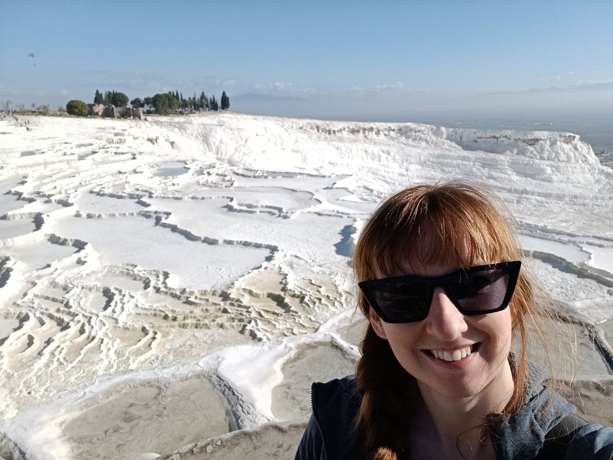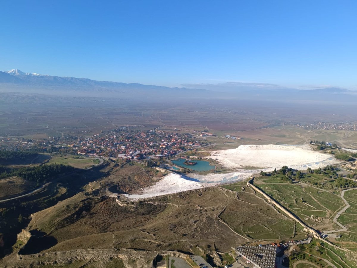 Ráno neprobíhá úplně podle plánu. Stojíme před hotelem a sledujeme, jak nebe zaplňují létající balóny. Koukáme na ně ze země, ačkoliv už jsme měli být 30 minut v autobusu. Budím majitele hotelu. Uklidňuje mě, že autobus přijede. Nakonec s hodinovým zpožděním přijel. Cestou jsme zastavili ještě pro několik turistů a v celkovém počtu 16 lidí zastavujeme před vchodem u Pamukkale a sledujeme, jak se balóny vznáší nad námi. Průvodce nám ukazuje, že támhle ve vzduchu je náš balón. Je fakt veliký. Po chvilce jsme nahnáni zpět do autobusu a jedeme k místu, kde přistává balón. Nastupujeme a vzlétáme. Je zima. Ejzí má na sobě neopren - zapomněl si s sebou vzít bundu. Já mám na sobě vše, co jsem měla sbaleno. Během letu si děláme selfíčka. Felda natáčí na GoPro. Pilot nás fotí na 360°kameru, ale za poslání fotek na WhatsApp si pak řeknou 30€, tak to ať si je nechá. Po přistání jedeme do hotelu sbalit věci, vyzvedáváme oběd s sebou a jdeme na prohlídku Pamukkale.