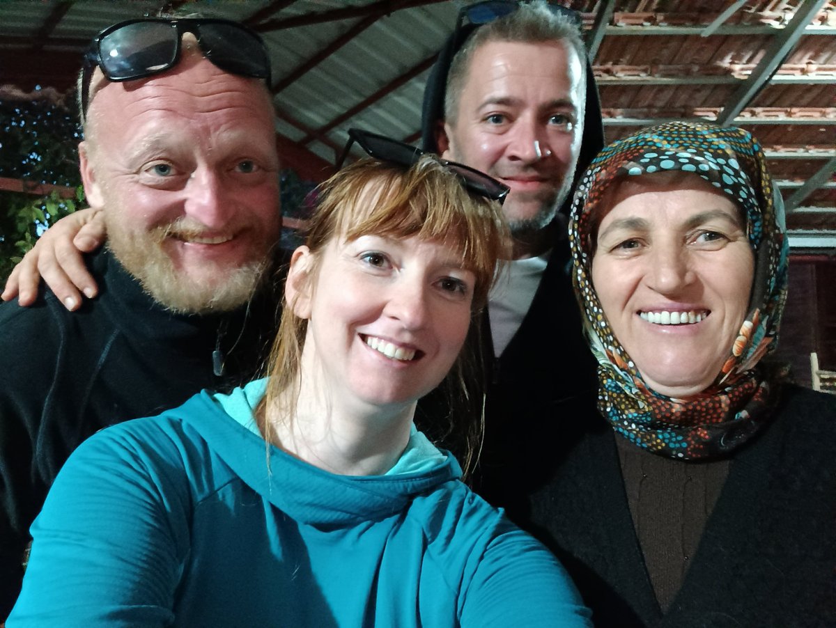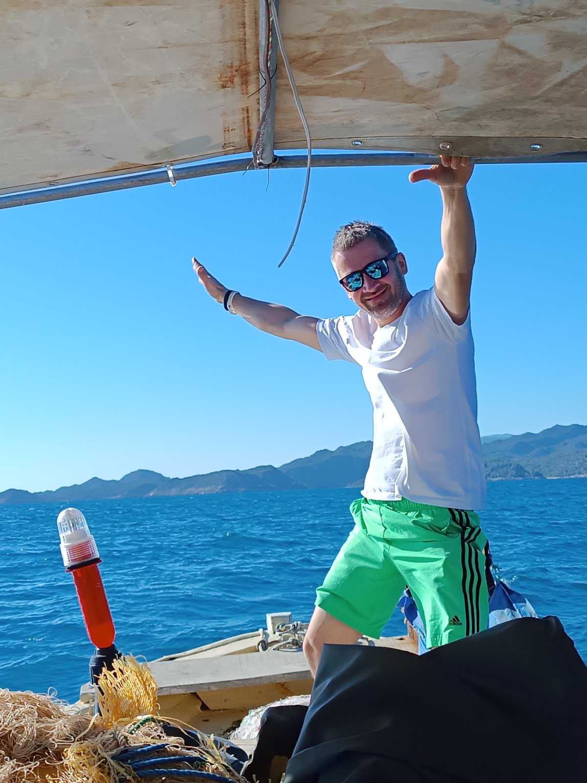 Ráno zkoušíme zprovoznit pračku. Kluci tím v noci strávili celkem slušnou dobu. Ono najít manuál k pračce, co se jmenuje REGAL je dost potíž. Manuál jsme získali... v turečtině... ale i tak to nefunguje. Volám majiteli a ten mi posílá do bytu o patro výše. Když vypereme a nasnídáme se, tak vyrážíme za Demre , k místu zvanému Myra. V bývalé Lykii to bylo jedno ze 6 největších měst. Žil zde a zemřel sv Mikuláš. Vstup do Myry je ale relativně drahý (250,-kč/osoba) a při pohledu od pokladny nás to moc nenadchlo. Zastavujeme na nedalekém parkoviště a prolítneme se v rychlosti nad areálem alespoň dronem, ačkoliv je jejich užívání v areálu zakázané. Pak míříme do přístavu. Máme v plánu se trajektem - pravidelnou linkou za pár korun- přesunout na protější břeh a pak dojít zpět k autu. Podle mapy by to mělo být asi 10 kilometrů. No, plán je to pěkný, ale vlastně se komplikuje už v přístavu, odkud žádný trajekt neodjíždí. Není totiž sezóna. Po chvíli k nám přijede nějaký maník na skútru. Nabízí nám převezení soukromou lodí. Když řekne cenu, tak se neudržím smíchy. Odmítáme. Vysvětluji mu, že jsme bílí, ale chudí. Po nějaké době se vrací, že můžeme jet rybářskou lodí. Menší luxus, než na jachtě, kterou nám sliboval, ale cena už je pro nás přijatelná. Problém je platba v hotovosti. Jedeme tedy do nedalekého města vybrat peníze a vracíme se. Ejzí si mezitím domluvil, že s naším novým kapitánem pojede ráno ve 3 na ryby. Cesta loďkou je dobrodružná, natáčíme si videa, děláme fotky. Po půl hodině jsme na druhém břehu a vydáváme se po další části lykijské stezky zpět k autu. Asi po hodině se ztratíme. Nebo spíš zjistíme, že jdeme úplně jiným směrem, než jsme měli v plánu. Asi jsme někde špatně odbočili. Cesta je hezká, ale náročná. Je dusno. A máme hlad. Po asi další hodině přicházíme do vesnice. Všude je spousta skleníků - někde pěstují papriky, jinde rajčata. Na googlu najdu Snídaňovou restauraci. Naše jediná naděje. Jdeme tam. Jinou možnost stejně nemáme. Je zavřená brána, ale slyšíme, že se uvnitř něco děje. Voláme a přichází nám otevřít starší paní. Nemluví anglicky. Ukazujeme jí, že máme hlad. Usadí nás ke stolu a začne vařit. Nejprve dostaneme čaj a kávu, pak zaběhne na zahrádku a donese suroviny. Uvaří nám něco na způsob leča, upeče nějaké slané sušenky. Je moc milá. Po chvíli přichází její manžel. Nakonec to dopadne tak, že se s nimi domluvíme, že nás manžel odveze k autu. Je totiž tma a auto je od nás vzdáleno přes 10 kilometrů. Před odjezdem si s majitelkou děláme selfíčko a vyměňujeme facebook. Ještě než dojedeme k autu, tak už sdílí fotku s neznámými cestovateli z Čech. Dodnes mi posílá pozdravy na moje zveřejněné fotky z cest. Snažíme se jít brzy spát. Ráno Ejzího čeká rybaření.