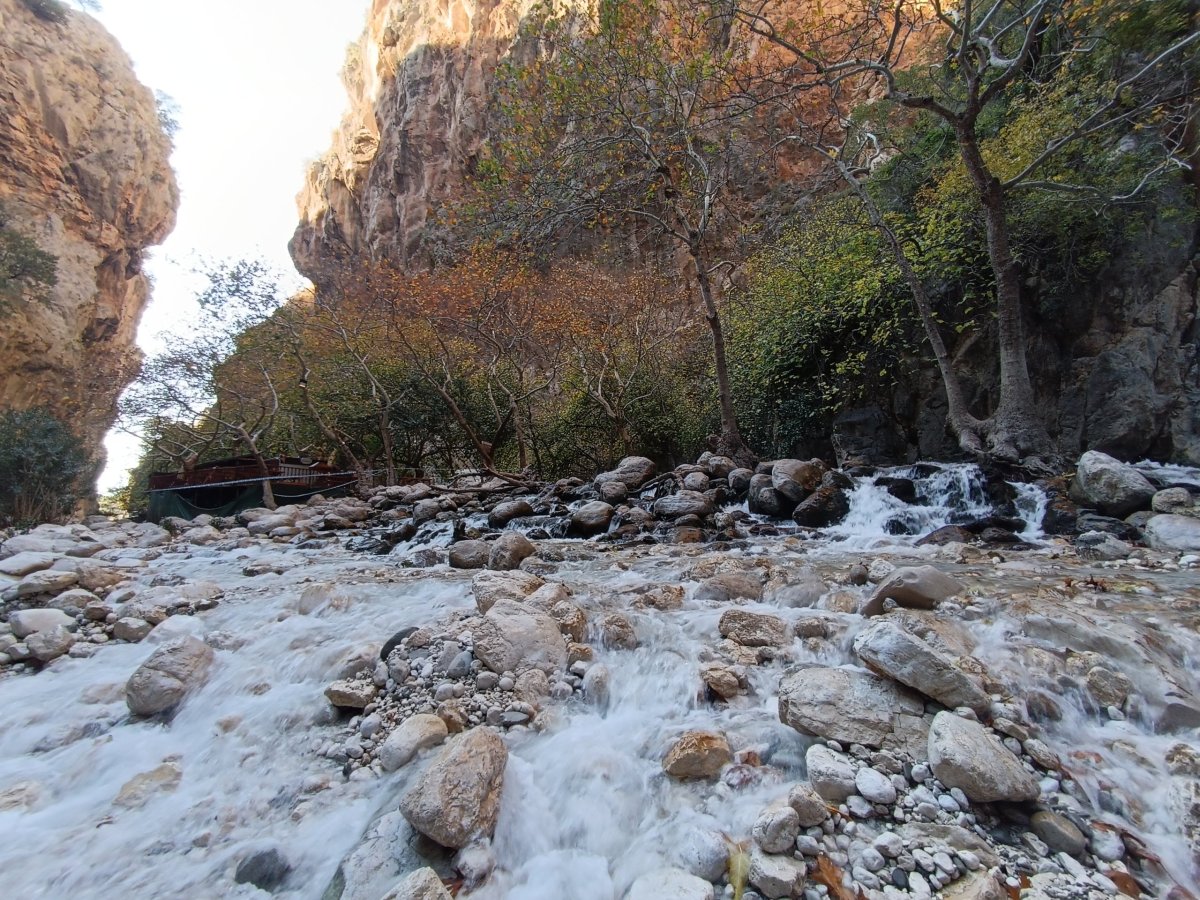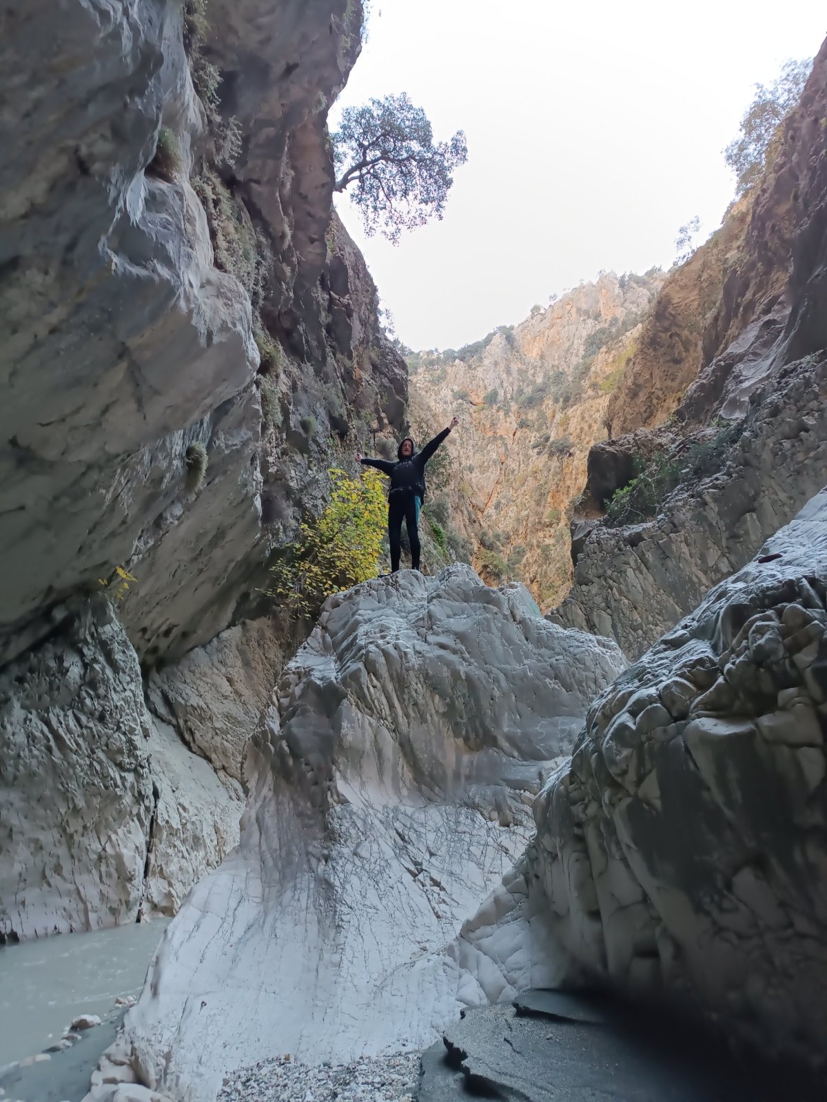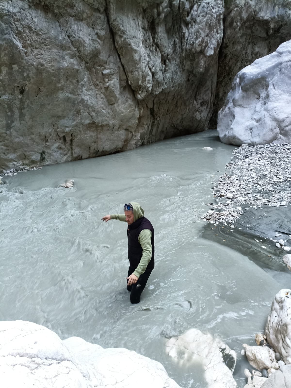 Pozitivní bylo, že když jsme přijeli k parkovišti u soutěsky, tak jsme tam byli téměř sami. Došli jsme k pokladně, kde jsme si za asi 30 korun koupili vstup. Super. Konečně přívětivé vstupné. V porovnání s jídlem a ubytováním jsou ceny za vstupy v Turecku hodně vysoké. Vcházíme do soutěsky. Wau! Je tu celkem chladno. Po asi 100 metrech narazíme na pásku. Cedule: Z důvodu vysoké vody.... U cedule stojí nějaký chlápek s visačkou. Ptáme se, jestli můžeme jít dovnitř. Říká že ano. Kluci si jdou do auta pro neopreny. Felix si bez dovolení vypůjčuje boty do vody ze zamřížovaných beden. Dosáhne jen na ty největší. Já si oblékám pláštěnku na kecky, a beru si sukni. Uděláme si fotku. Já to po prvním kroku vzdávám a čekám na kluky - nejprve v areálu soutěsky, pak v restauraci před vstupem. Kluci se asi po hodině vrací. Jsou nadšený. Nepotkali nikoho. Soutěsku měli jen pro sebe. Jsou zmrzlí, voda byla studená. Ale vypadají spokojeně.