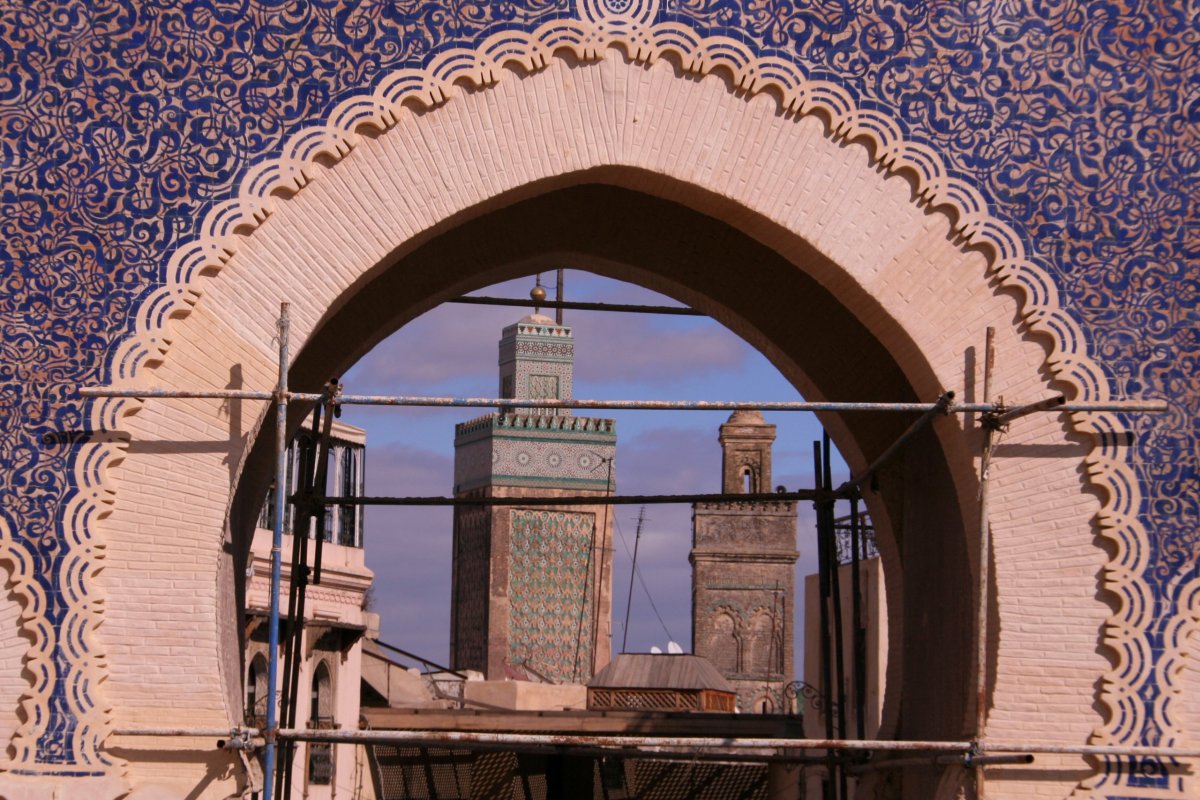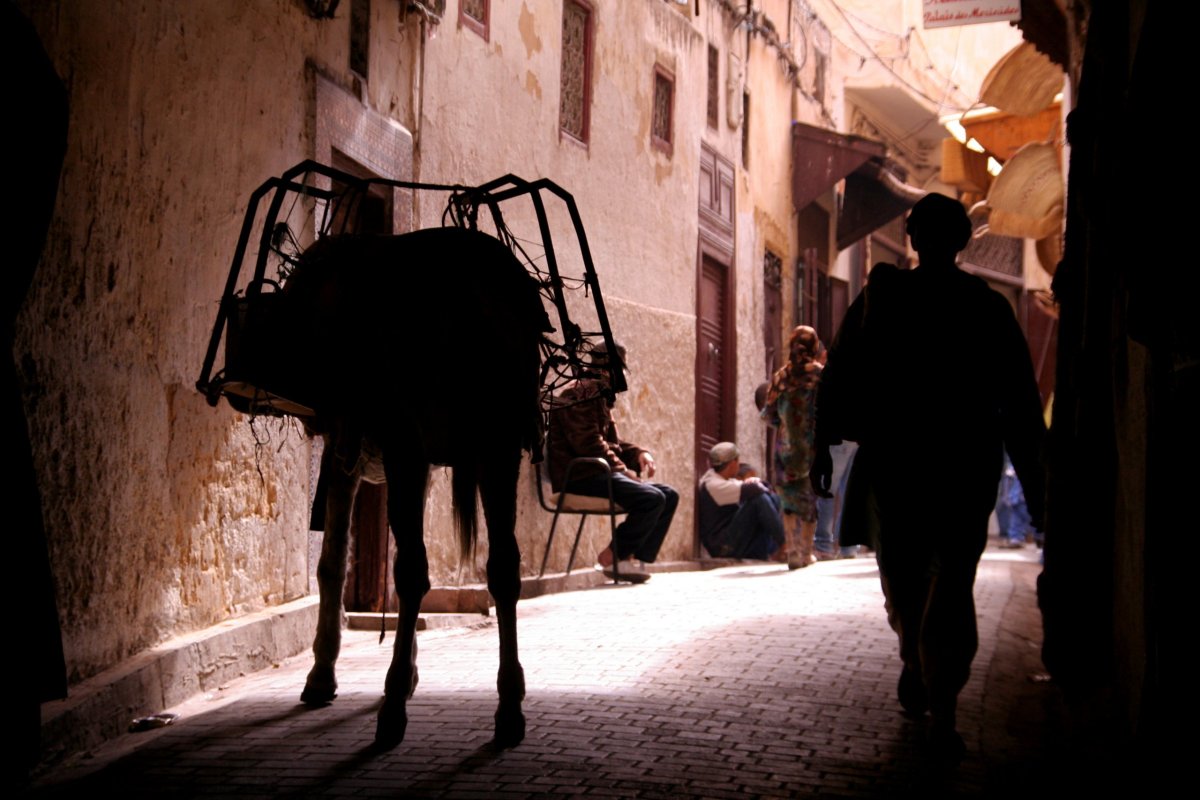 Do Fezu (nebo Fésu) přijíždíme opět v noci. Naštěstí velmi rychle nacházíme volný i příjemný hotel, kde jsou tak tenké stěny, že můžeme poslouchat tikot hodin ve vedlejší místnosti. Samozřejmě pokud zrovna na bazaru pod námi je klid, což není. Bydlíme kousek za bránou Bab-Bou-Jeloud v hotelu Mauritánia. To je symbolické, abychom se do této země tak nějak psychicky přiblížili. Fez je starobylé živoucí město plné uliček tak úzkých, že se často nevyhnou dva lidi vedle sebe, ale přitom dost širokých na to, aby se v nich dal hrát fotbal. Pravda, hřiště je poněkud nepřehledné a často zatáčí. To ale místní mládeži nevadí. Bezvadně se tu bloudí, když opustíme hlavni ulice plné bazaru, jsme okamžitě a to doslova na bílých místech na mapkách. Můžeme chodit hodiny a hodiny a vůbec nechápeme, která ulice sakra vede zpět a která není slepá. Chápu, že si zde děti vydělávají zachraňováním bloudících turistů, což samozřejmě není náš případ. My jsme hrdí Češi a každou ulici procházíme až do úplného slepého konce. Ulice jsou jedna jako druhá. Nezdobené, minimalistické, neudržované. Vše krásné je skryté. Občas máme štěstí a nakukujeme do krásných dvorků a madras skrze otevřené dveře.