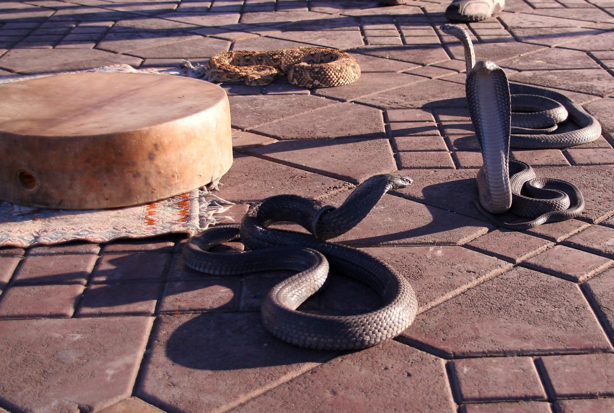 V Marakeshi mi hned při prvním vstupu na náměstí přistál na krku had. Paráda. Teda abych to vysvětlil. V Marakeshi je náměstí Djemaa el-Fna plné různých artistu a kejklířů, kteří za malý (nědky teda i nepříjemně velký) bakšiš předvádějí různé kejkle. A mezi nimi je spousta zaklínačů hadů. Vytahují z košíků různé druhy plazů včetně kober a hází je na turisty jen tak uprostřed náměstí a zaklínají je píšťalou, aby neutekli. Vy si je pak můžete pochovat, vyfotit nebo třeba políbit (byl jsem ubezpečen, že had je vodní a není nebezpečný), pak následuje scéna, kdy zaklínač žádá tučný peníz a kdy turista dává pár drobných. Následuje krátká hádka a zase vše dokola.
