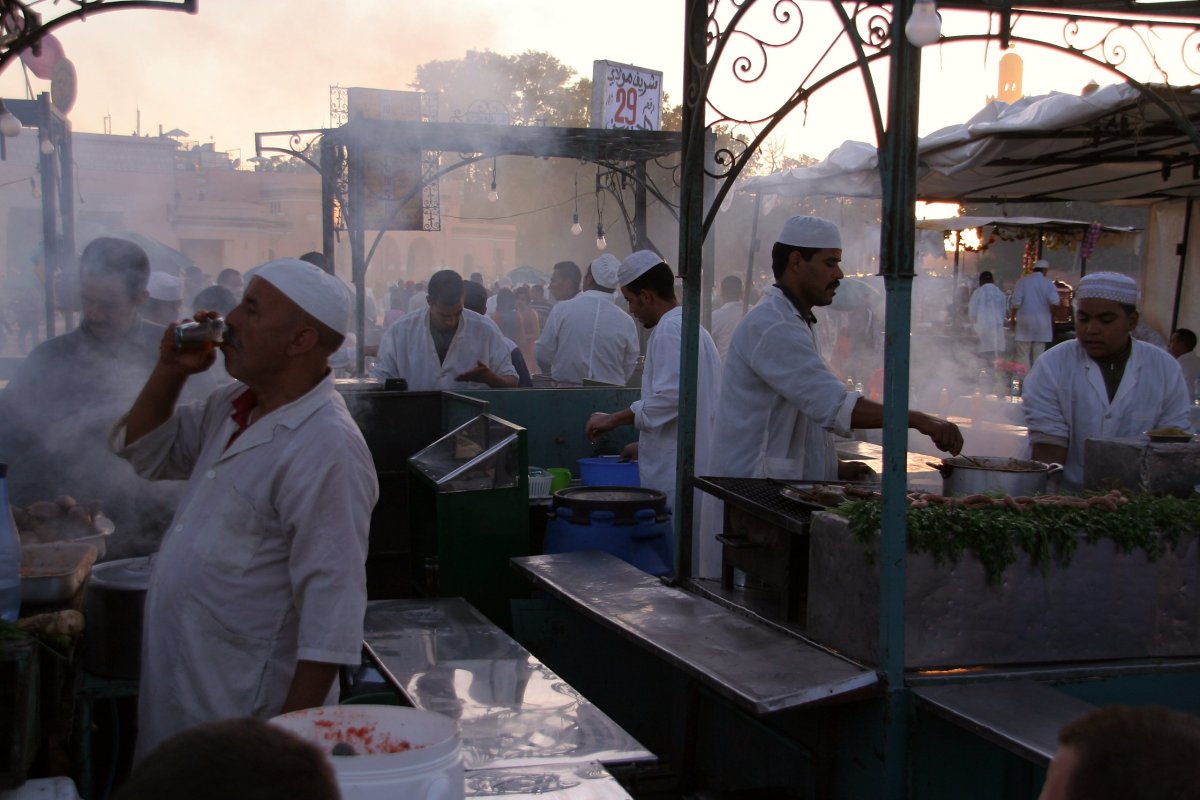 Hadi a opice jsou tu převážně pro turisty, ale ostatní kejkle jsou více méně pro místní. Pořádají se různá divadelní vystoupení, kterým našinec nerozumí, ale místní se popadají za břicho, nebo hraní na záhadné nástroje, věštění ze všeho možného, loveni flašek s limonádou, a různé akrobatické kousky. Některé jsou dost vydařené. Nejvíce živo je vpodvečer, kdy na náměstí přijíždějí pojízdné občerstvovány v ohromném množství a řadí se do zvláštního uskupení. Na jednom kraji šnekaři na druhém cukráři a mezi cca 120 pouličních jídelen.