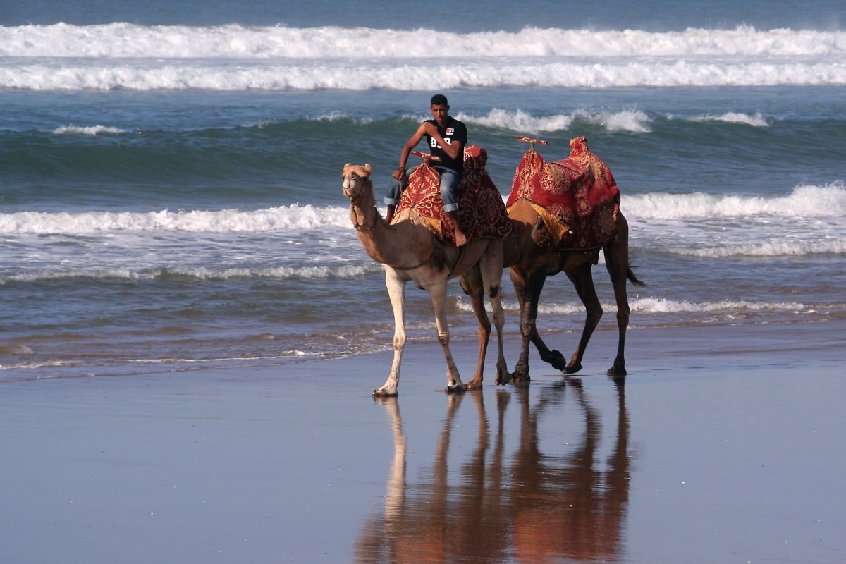 Nyní to bude trochu zkratkovité. Další zastávka je mořské letovisko Agadir a národní park Oued Massa, kde jsou bílí plameňáci a neuvěřitelná nekonečná liduprázdná pláž (kde se tu vzal ten velbloudář fakt nevím). Pak jedeme busem asi 20hodin na jih pres celou západní Saharu. To je krajina! Úplně plochá suchá pustina na jedné straně silnice a oceán na druhé. Každých cca 350 až 500km městečko. Jinak vůbec nic. Města se poznají už hodně z dálky podle krutého smradu ryb, což trochu vysvětluje pravidelně umístěná skládka těsně před a za každým městem.