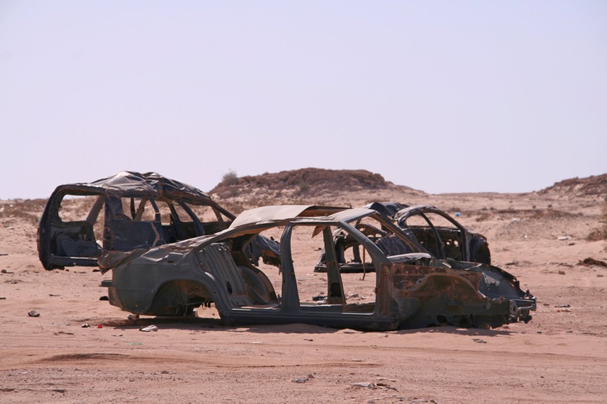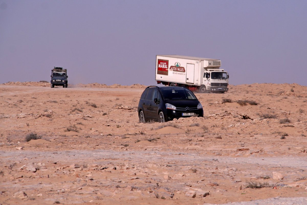 Angličan John nás bere na hranice, která je asi 350km daleko. Cesta končí. Dál je jen terén a zaminovaná pole. Mauritánská strana je 3km daleko a není vidět. Na konci je kolona aut a tak se loučíme s Johnem a zkoušíme štěstí pěšky přes všechny kontroly. Funguje to. Za pár minut jsme v Mauritánii a bereme prvního stopa do Noadhibou.