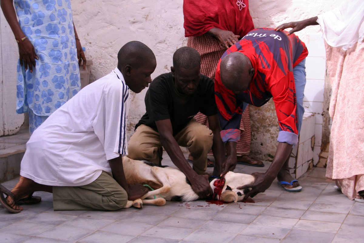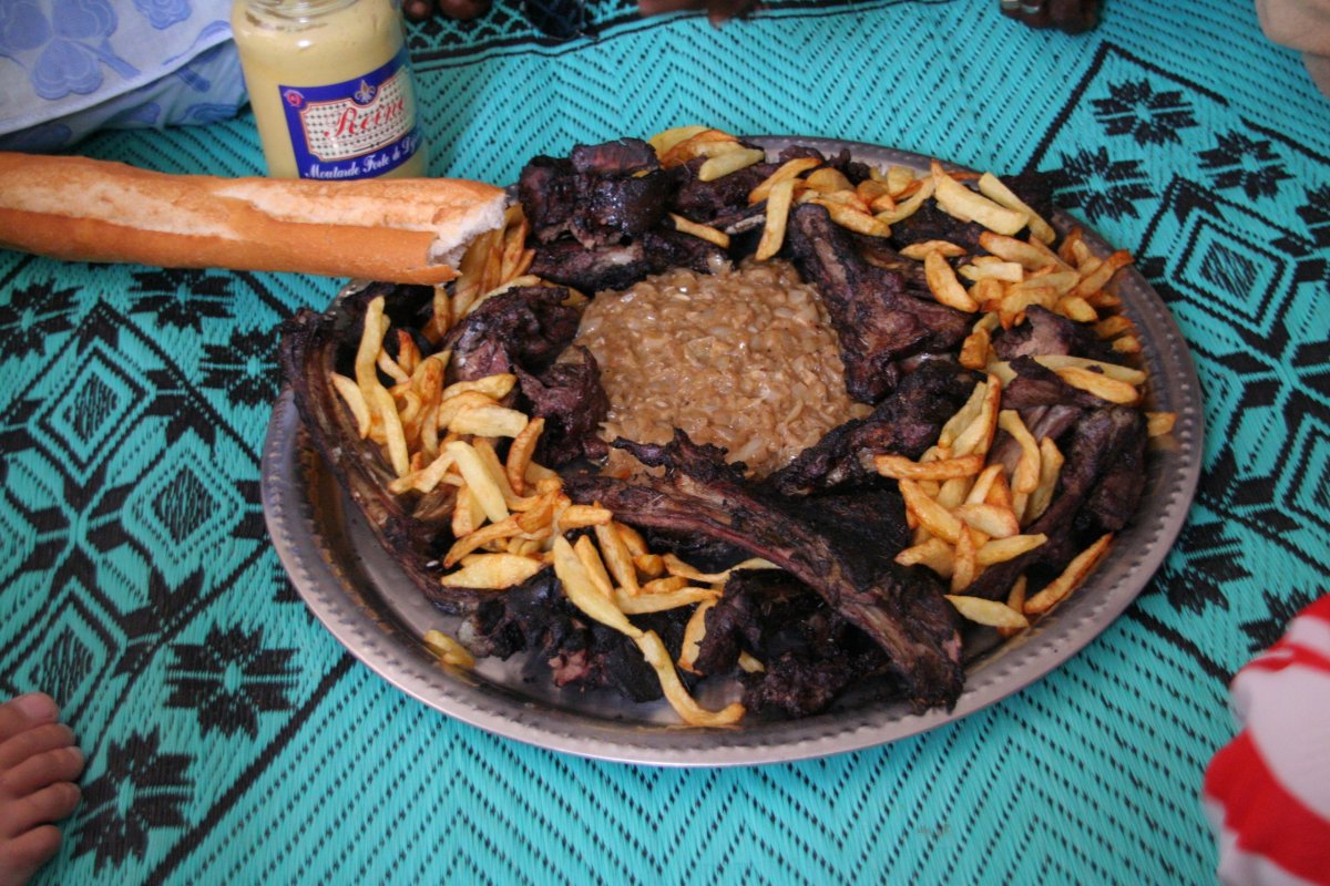 V sobotu 29.11. se budíme a mladá recepční z hotelu nás zve k nim domu na oslavu. Abychom vše zažili, jak se má. Rodina má asi deset příslušníků a není vůbec zjevné, jak jsou příbuzensky propojeni. "Už to bude, pojďte se dívat" Volá nadšeně slečna z recepce a otec se synem vedou velkého berana a za chvilku dalšího. Zkušeně je podříznou, stáhnou a rozporcují. Za pár hodin máme hostinu. Maso je tuhé, ale moc dobré. Nakonec se podává čaj. Už v Mauritánii se čaj pije děsně silný, ale tady doslova kroutí dolní čelist. Prý je to tak dobré na tráveni masa. Dostává se nám vysvětlení průběhu celého svátku.