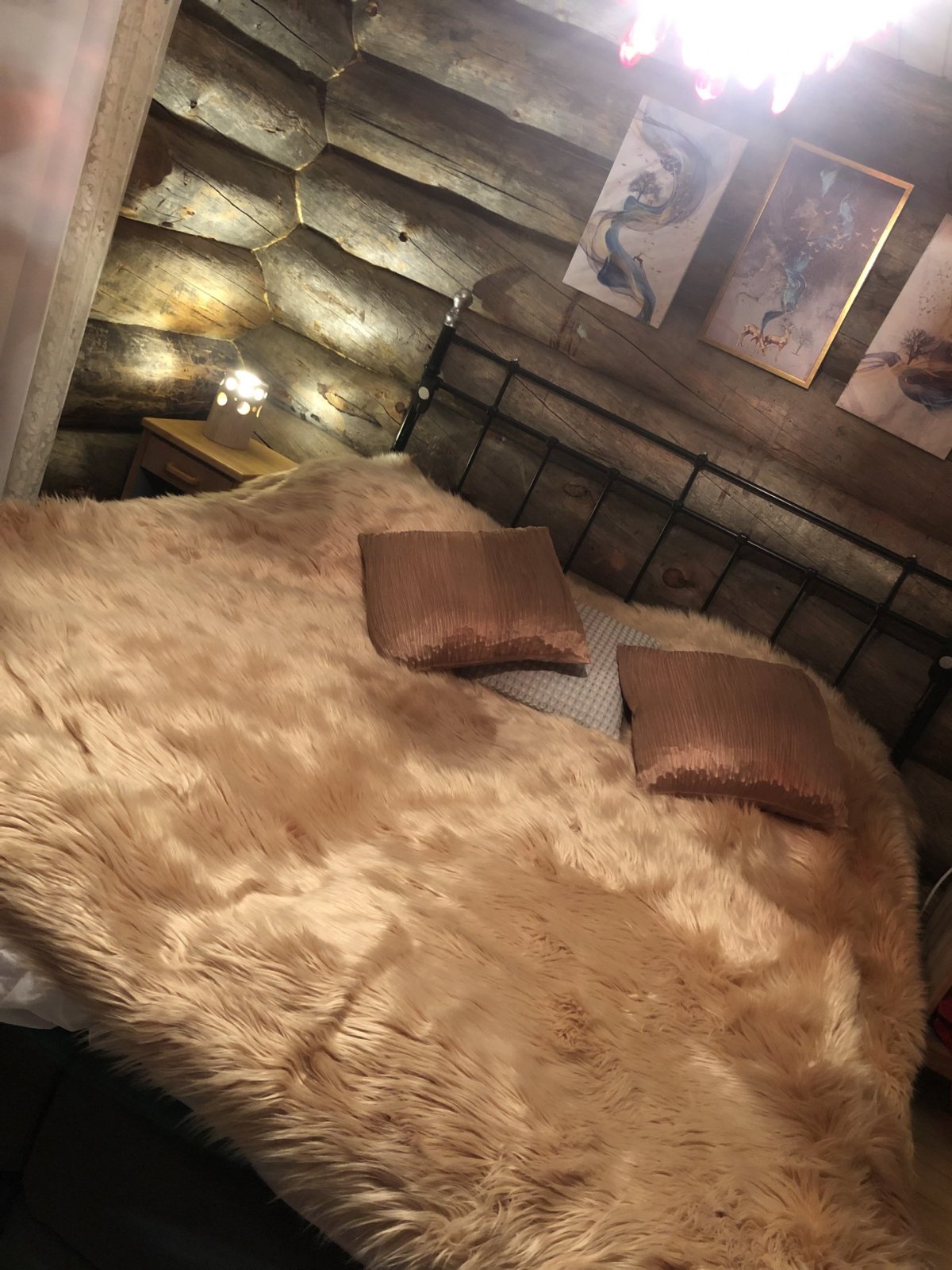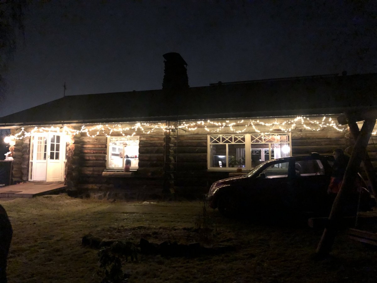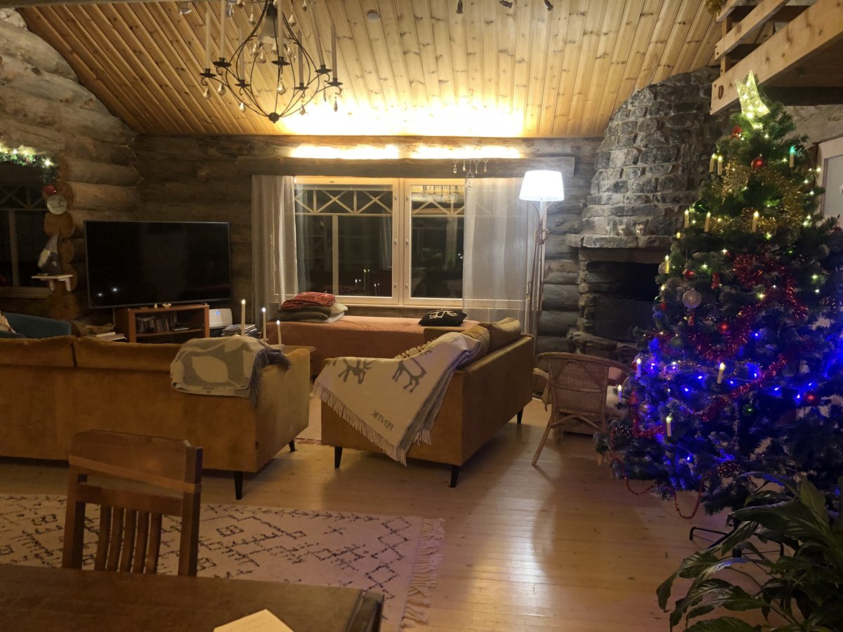 Na letišti jsme si daly předražený Burger King a pomalu se přesouvaly na náš poslední let do finální destinace. Do Rovaniemi jsme přiletěly kolem půl 10 večer. Na letišti už na nás čekal hostitel a odvezl nás do asi 15 minut autem vzdálené chaty. Manželé hostitelé byli velmi vřelí Francouzi žijící v Laponsku asi dva roky. Ukázali nám chatu a co vše je k dispozici, potěšili nás informací, že jsme jediní hosté a odjeli pryč. Ve spodním patře žila akorát jejich dcera se psem, ale tu jsme viděly jen jednou. Chatu jsme tedy měly jen pro sebe a byla nádherná.