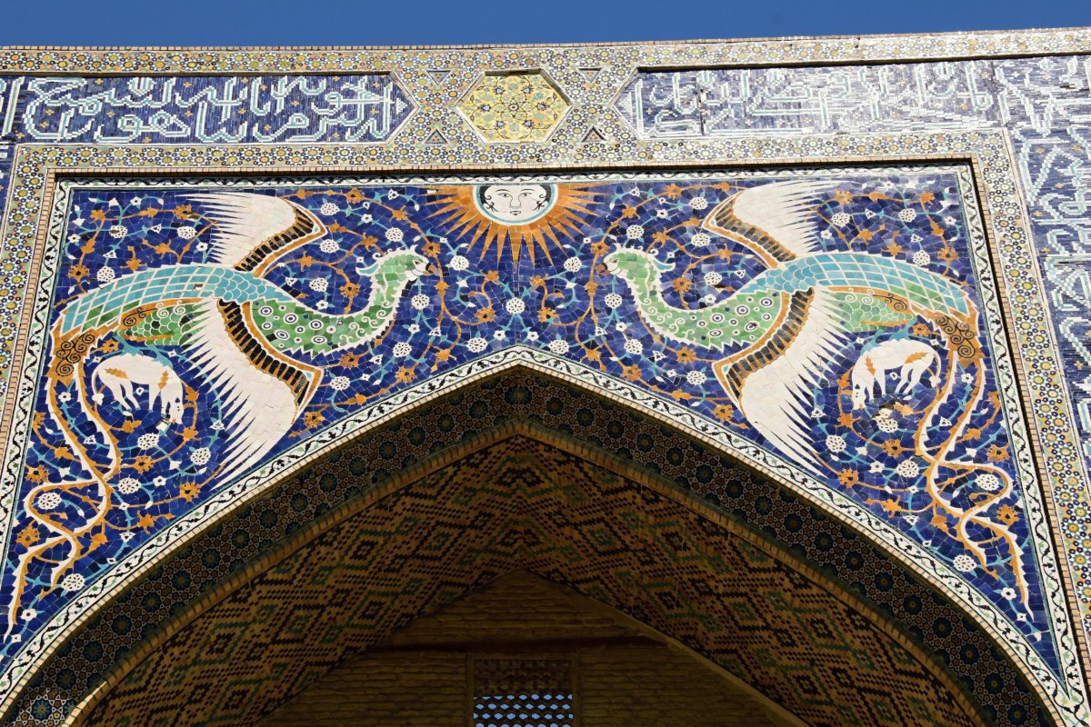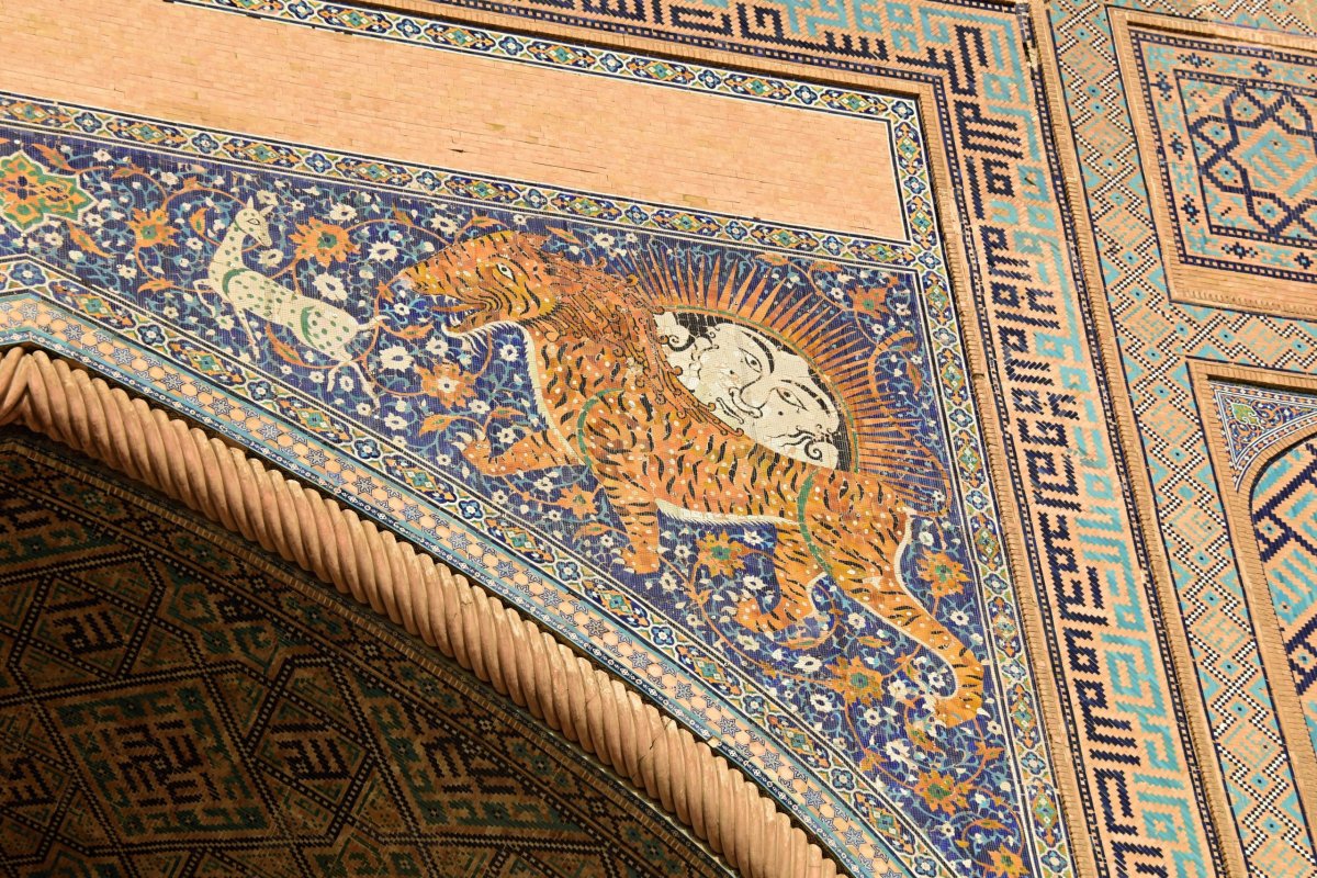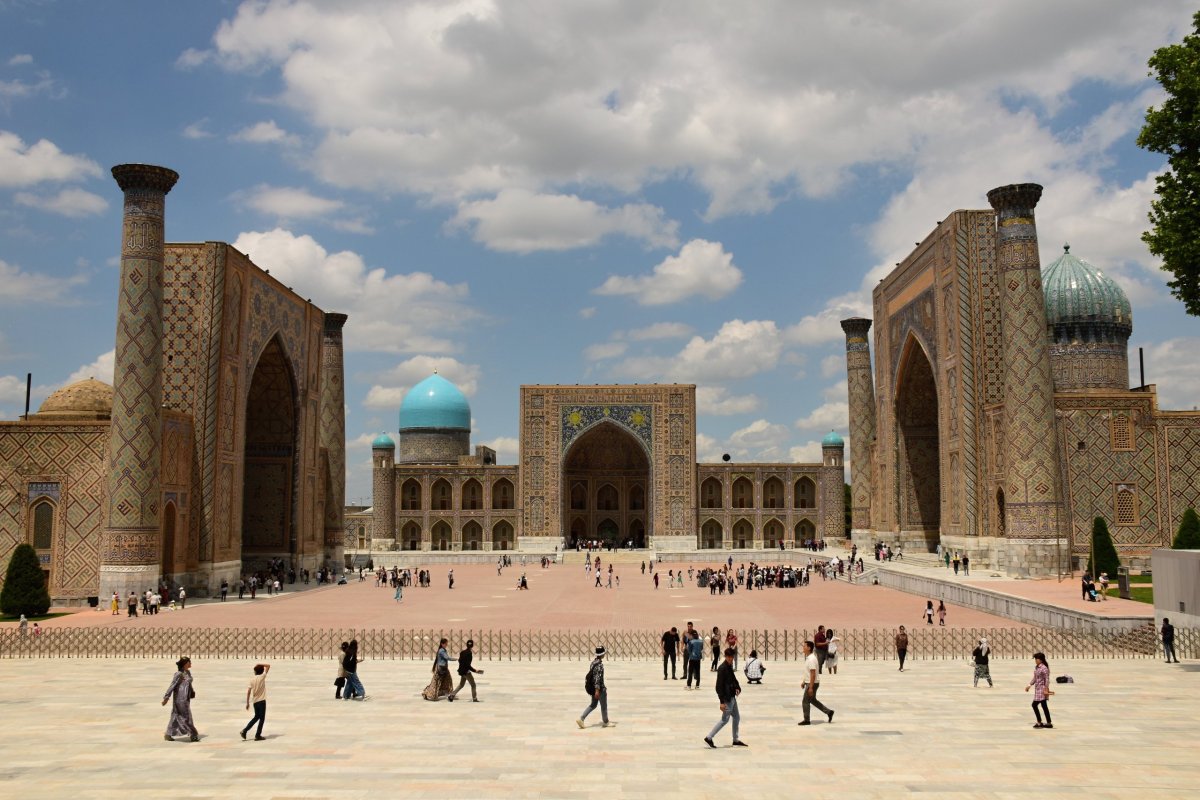 Medresy jsou postaveny do písmena U. Na západní straně je Ulugbekova medresa z 15. století. Ulugbek zde osobně přednášel astronomii, matematiku a filosofii. Proti ní je na východní straně medresa Šér Dór, což znamená mající tygry. Skutečně jsou tygři v mozaikách vyvedeni, což je pozoruhodné, protože islám zakazuje zobrazování živých bytostí. Tato medresa je ze 17. století. V průčelí náměstí stojí medresa Tilla Kori také ze 17. století. Procházíme medresy, ve kterých se hlavně prodávají suvenýry, ale jsou tam i expozice jak probíhala výuka a vědecká rokování.