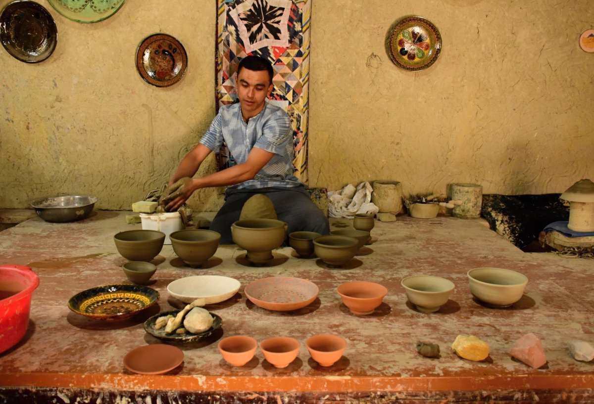 Po třech dnech opouštíme Samarkand a jedeme po tankodromu do Buchary. Cestou děláme krátkou zastávku u karavansaraje Malik, ze kterého zbyla prakticky jen vstupní brána. Další zastávka je v městečku Gižduvan, které je proslulé výrobou keramiky. Máme vytipovanou dílnu Ališera Narzullaeva. Skutečně ji na náměstí nacházíme, hned nás vítá nějaký maník a že nás provede po dílně. Exkurze je bezplatná, ale očekává se, že si nakonec koupíme nějakou keramiku. Ukazují nám jak se vytočí miska na hrnčířském kruhu, jak se maluje, jak se dělá glazura - ingredience na ní se melou na mlýnku, který pohání oslík, ale ten prý pracuje jen jednou za 14 dnů a pak má volno. Teď měl zrovna volno. Exkurze byla zajímavá a tak si kupujeme malou misku za 5 USD (větší by se nám nevešla do malých batohů). Hned vedle dílny je šašlikárna, kde se nacpeme dobrými šašliky a zapijeme to zeleným čajem. Na zpáteční cestě k autu si ještě prohlížíme místní mešitu.
