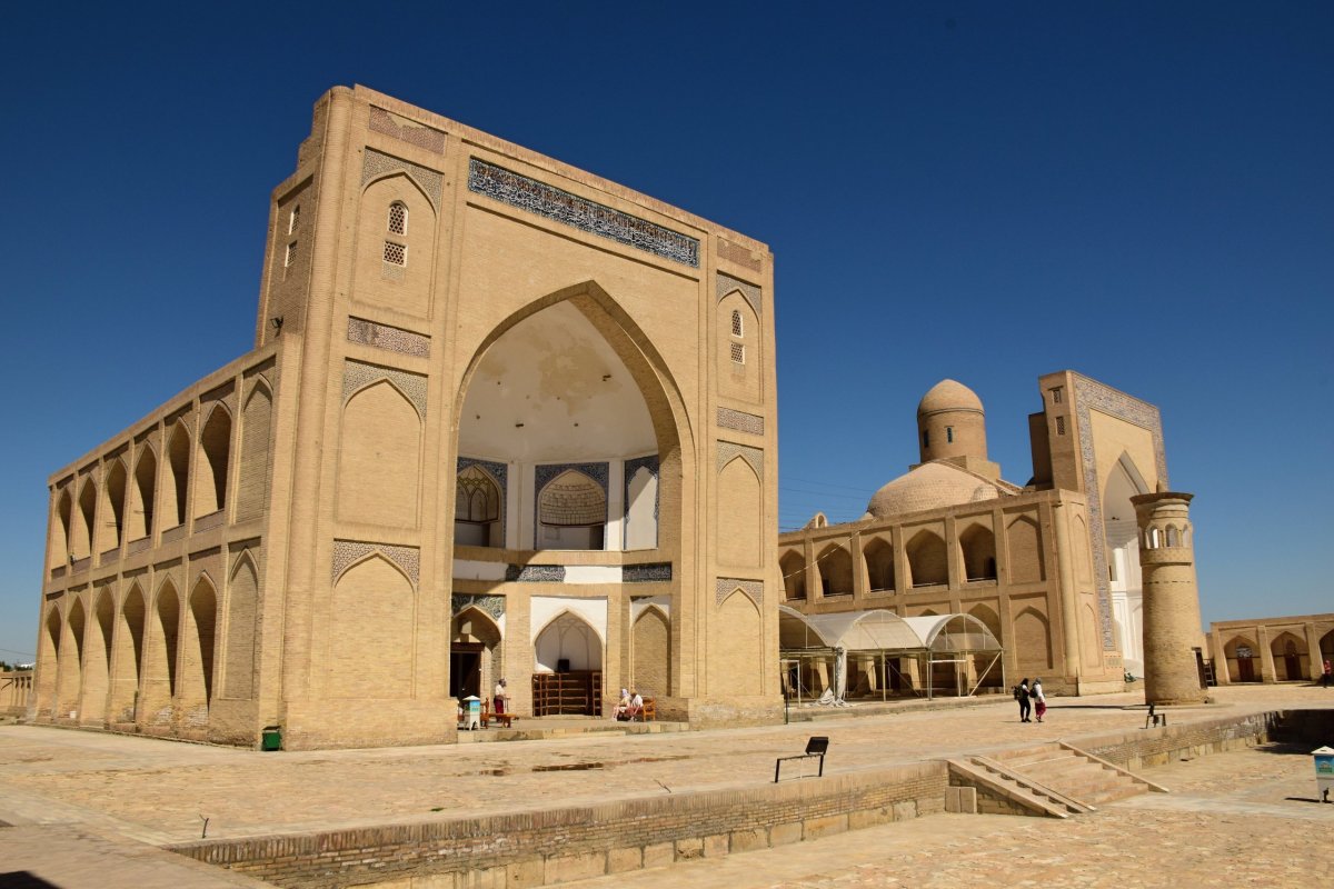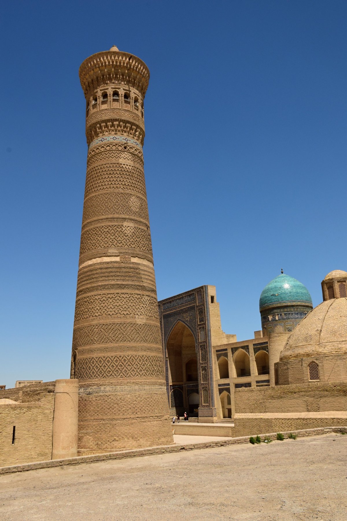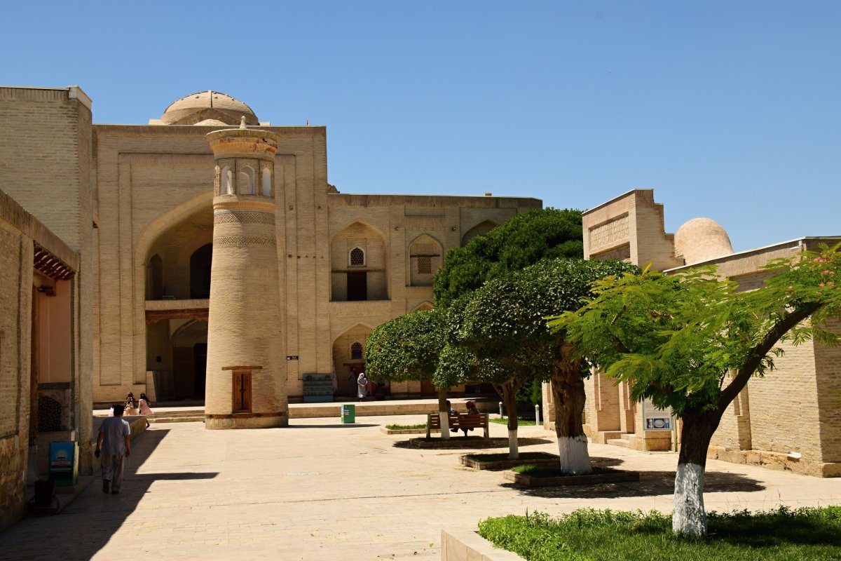 Nyní se dostáváme do samého historického centra Buchary. Na náměstí Kalon jsou hned tři pamětihodnosti. Mešita Kalon z 16. století, která byla svou rozlohou 1 hektar druhou největší ve Střední Asii. Hned vedle je minaret Kalon postavený z cihel uspořádaných do rozmanitých vzorů. Naproti mešitě je stále funkční medresa Mir-i-Arab, takže můžeme vejít jen do vstupního portálu, ale skrz mříž se mi daří vyfotit i nádvoří medresy.