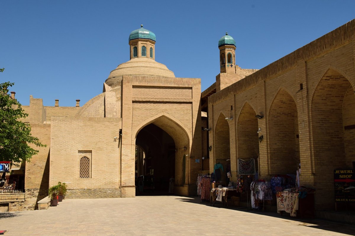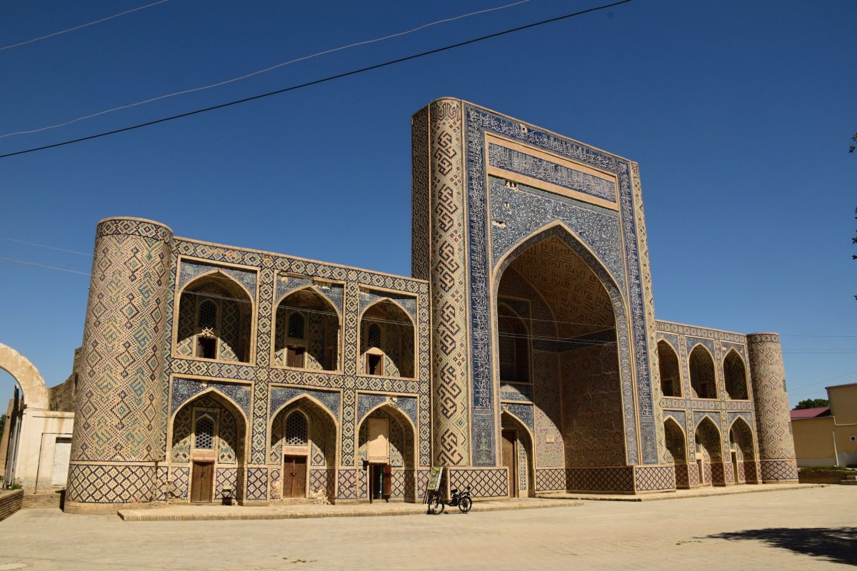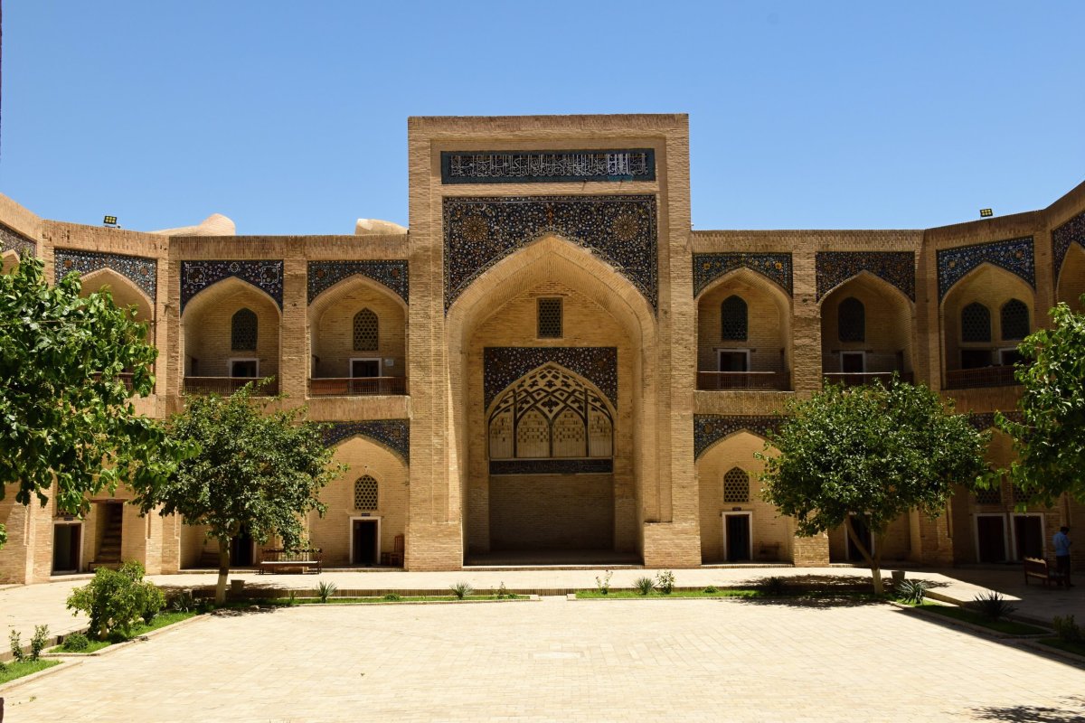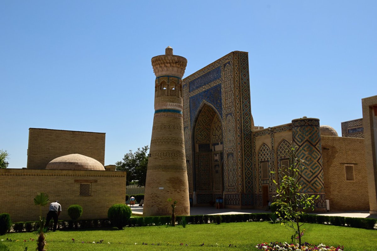 Nyní se dostáváme do samého historického centra Buchary. Na náměstí Kalon jsou hned tři pamětihodnosti. Mešita Kalon z 16. století, která byla svou rozlohou 1 hektar druhou největší ve Střední Asii. Hned vedle je minaret Kalon postavený z cihel uspořádaných do rozmanitých vzorů. Naproti mešitě je stále funkční medresa Mir-i-Arab, takže můžeme vejít jen do vstupního portálu, ale skrz mříž se mi daří vyfotit i nádvoří medresy.