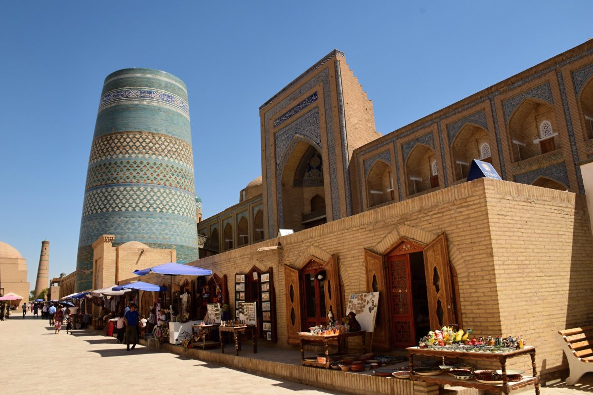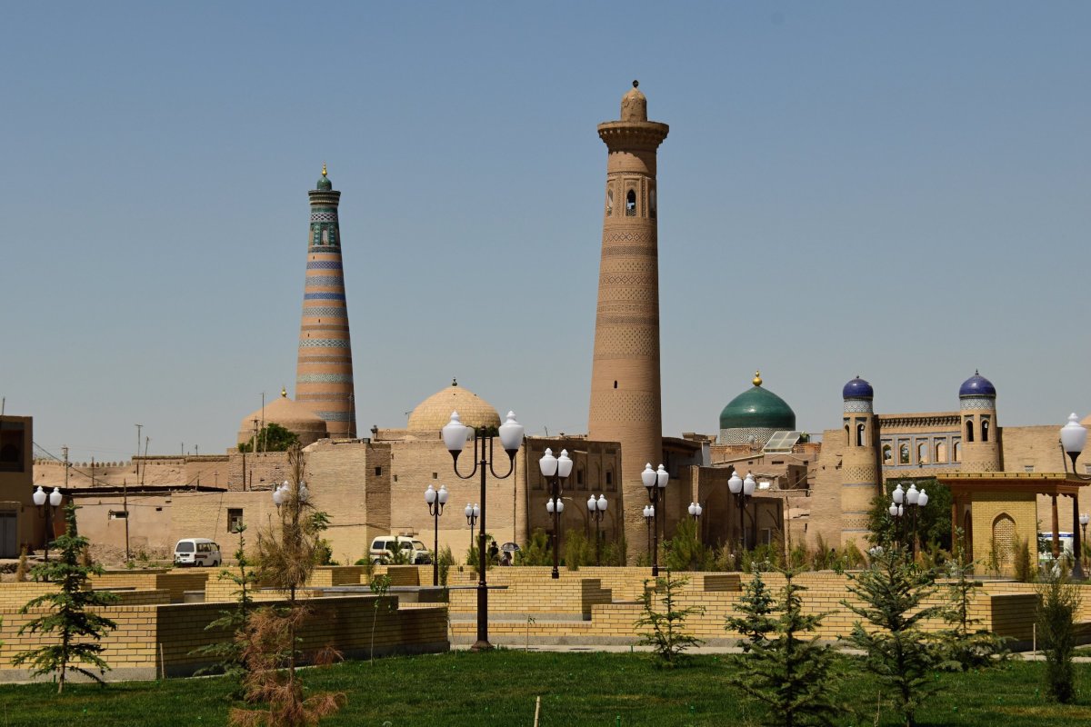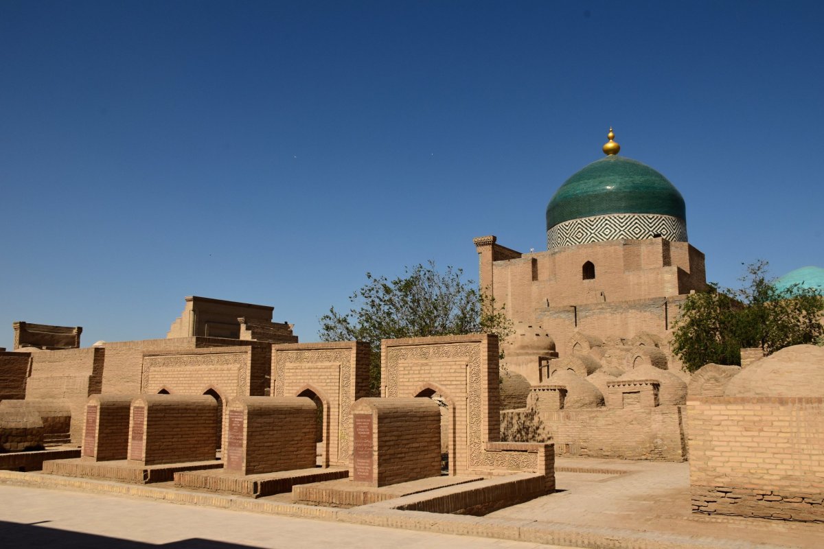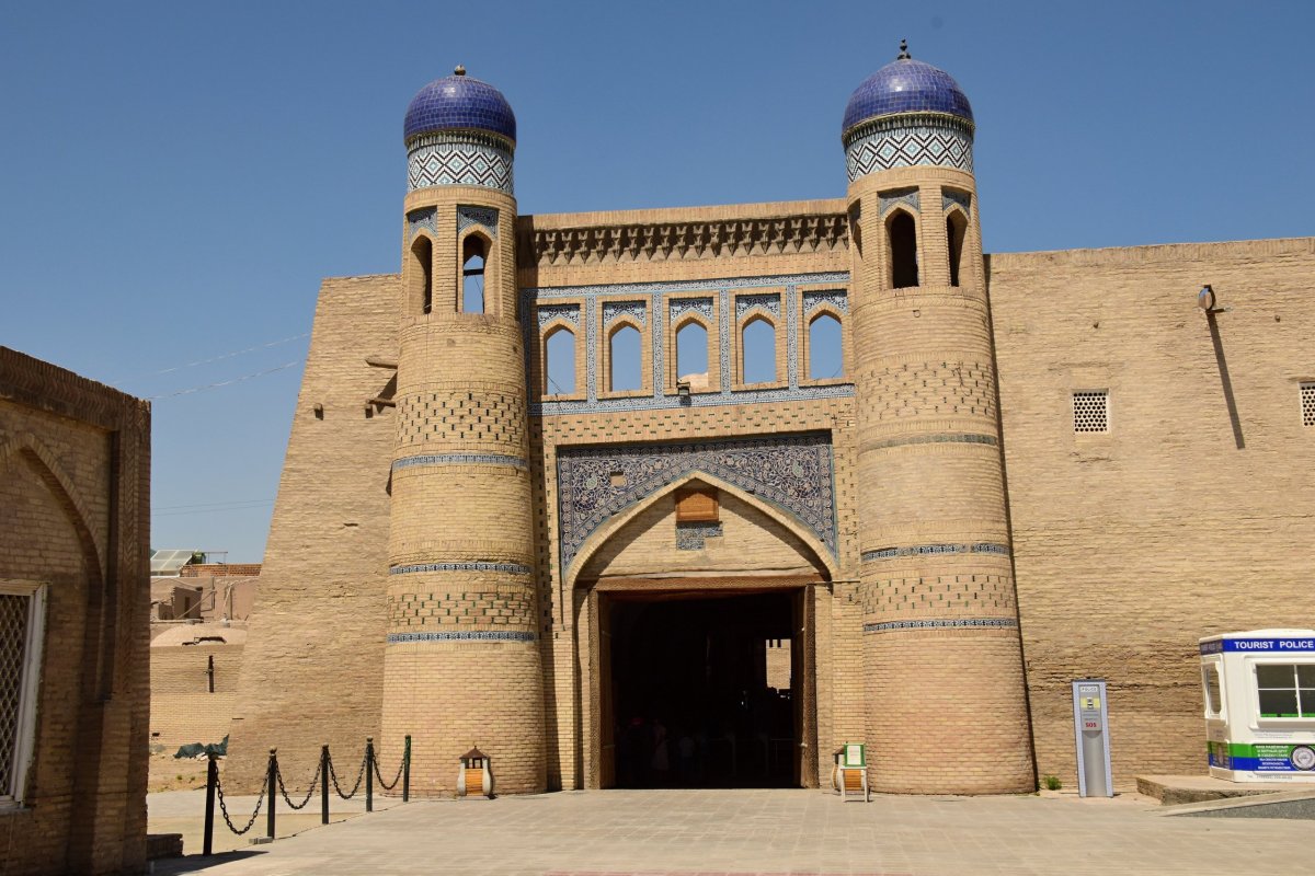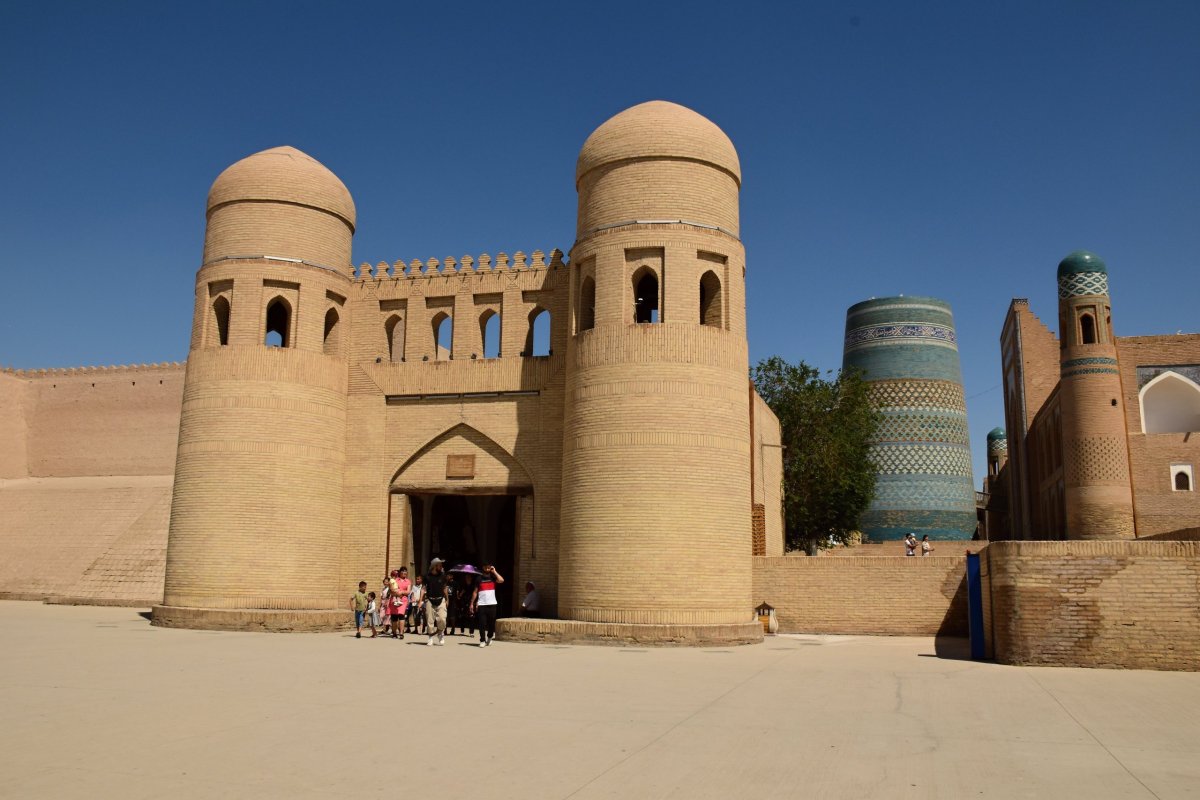 Do Chivy s naším autem nesmíme. Tak pojedeme vlakem. Protože jízdenky na vlak se rychle vyprodávají, koupili jsme je hned po příjezdu do Samarkandu. Bohužel odjezd vlaku je už ve 4 ráno. I to je důvod, proč bych tam radši jel autem. Ale nedá se nic dělat. Bucharské nádraží je asi 14 km od Buchary, ale před ním je velké parkoviště, tak tam snad auto vydrží. Po malém zmatku na nádraží náš vlak nalézáme a hned zalehneme ke spánku. Cesta je dlouhá, po rozednění pozorujeme okolní poušť. Konečně jsme v Chivě. Tam se nás snaží ulovit taxikář, že prý je město hodně daleko. Jenže já mám navigaci, tak se mu jen vysměji se slovy, že je to jen 1,5 km a to že ujdeme hravě pěšky. Směrem od nádraží jsou hezké pohledy na město, stojí za to jít pěšky. Ubytováváme se a po odpočinku jdeme prošmejdit město. Je možné koupit vstupenku za 150 000 UZS, která platí dva dny a je možné navštívit mnoho pamětihodností, většinou jsou to bývalé medresy, ve kterých jsou nyní malá muzea. Musím říci, že mnohá muzea nestála za nic, ale pár jich zajímavých bylo. Bohužel tato vstupenka nezahrnuje například nekropoli Pahlavana Mahmuda. Ale i tak asi stojí za to vstupenku koupit, protože bez ní se do ničeho nepodíváte. Staré město je poměrně malé, kompaktní. Procházíme ulicemi a občas zalezeme někam, kde nám platí vstupenka.