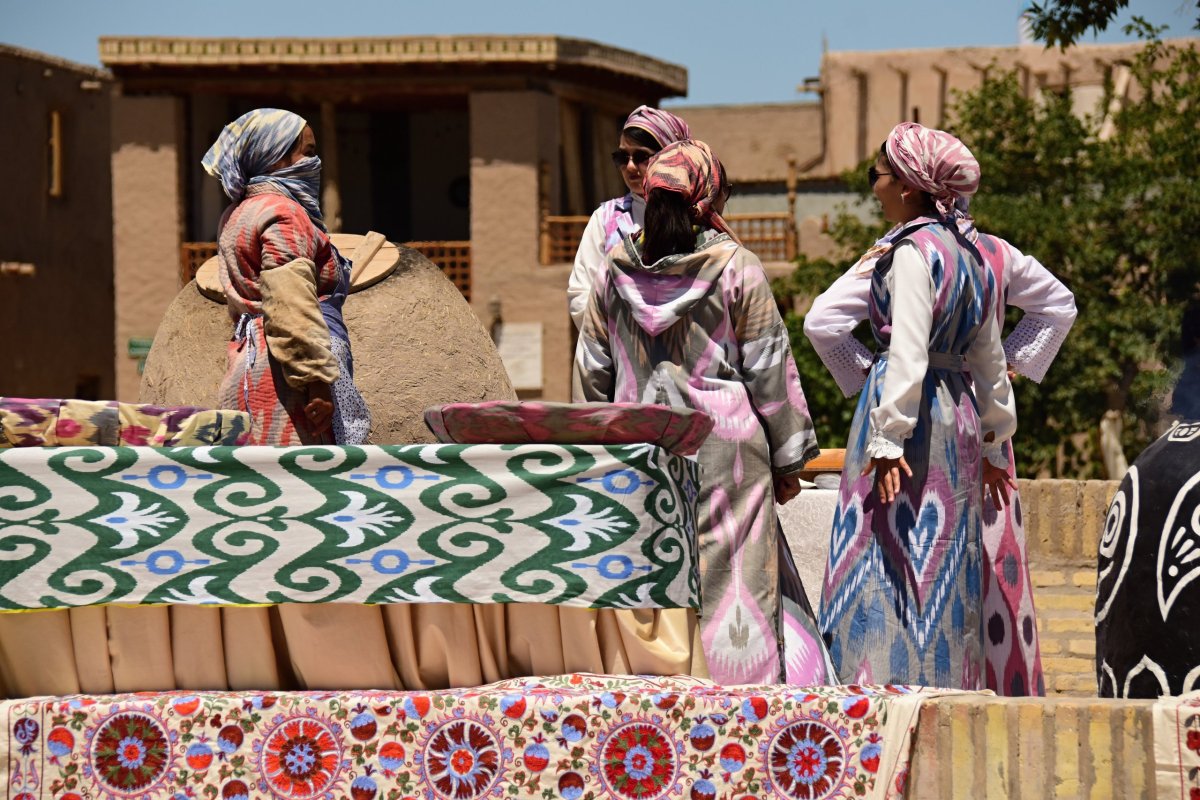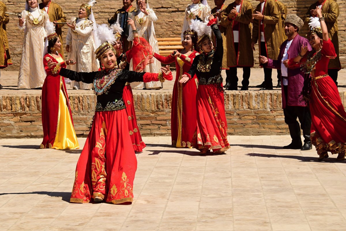 Poslední den našeho pobytu je v Chivě velká sláva. Město navštívil uzbecký a tádžický prezident. Ze starého města zmizeli všichni prodejci suvenýrů kromě prodejců vysokých chlupatých čepic, ti mají nějakou výjimku. Městem projíždějí na elekrovozítkách pistolníci se sluchátkem v uchu a s pistolí na zadku. Ale jinak vše funguje normálně, do pamětihodností se normálně může. Na jednom náměstíčku pečou nějaké dobroty a je tam také folklorní program s hudbou a tancem. Nic lepšího jsme si na závěr nemohli přát. Prezidenty jsme sice neviděli, ale aspoň jsem si užili tanečky.