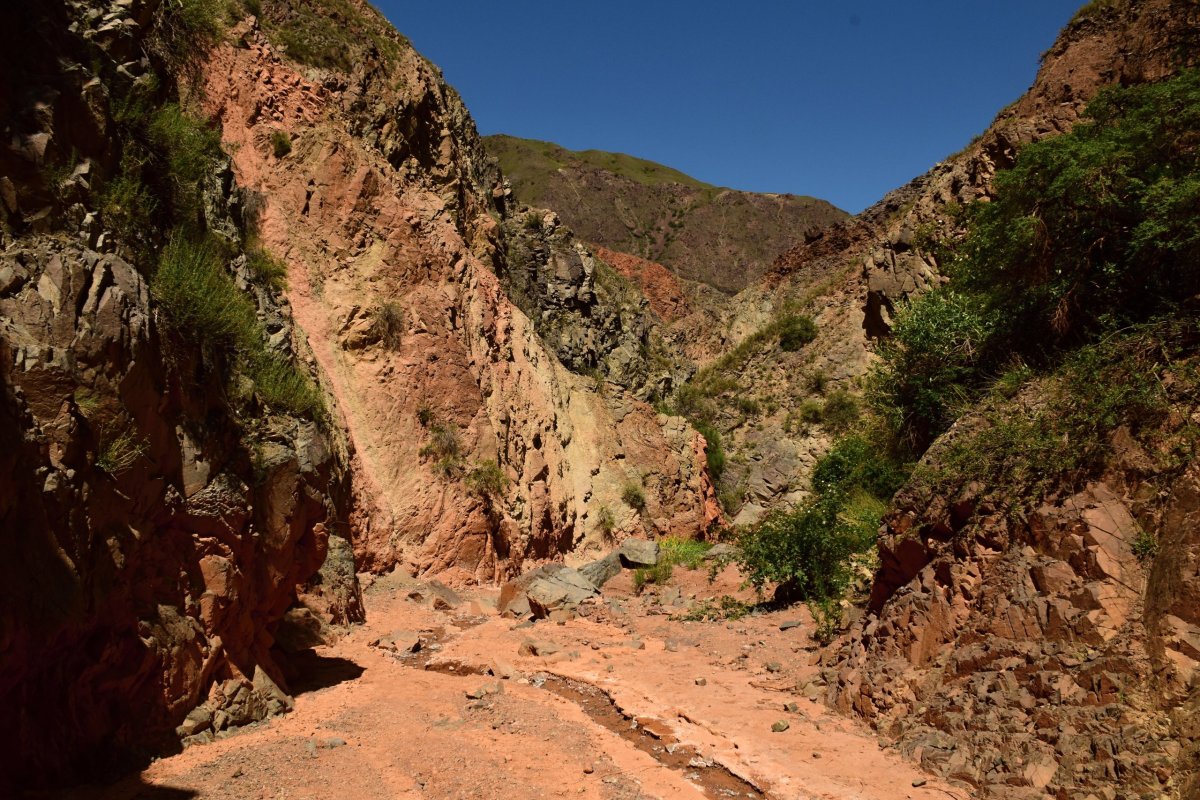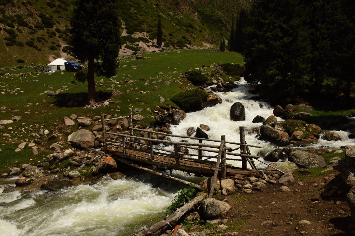 Po dešti jdeme na opačnou stranu, kde by měly být horké prameny. Cestička je tam úzká, po dešti kluzká, ale k pramenům se dostáváme. I tady je to překvapení - jsou to takové kamenné sudy, kam se dá vlézt a opravdu je tam teplá voda. Pak jdeme ještě na vyhlídku nad údolí, kde relaxujeme. Druhý den jdeme pěšky dolů po cestě, po které jsme předtím jeli UAZem. A užíváme si výhledy na hory a na divokou řeku. V Ak-Suu chytáme maršrutku a jedeme do Karakolu.