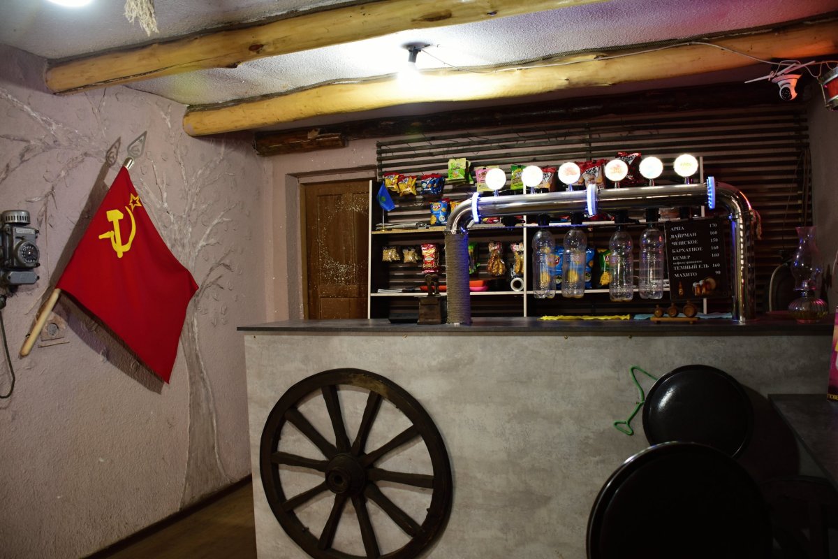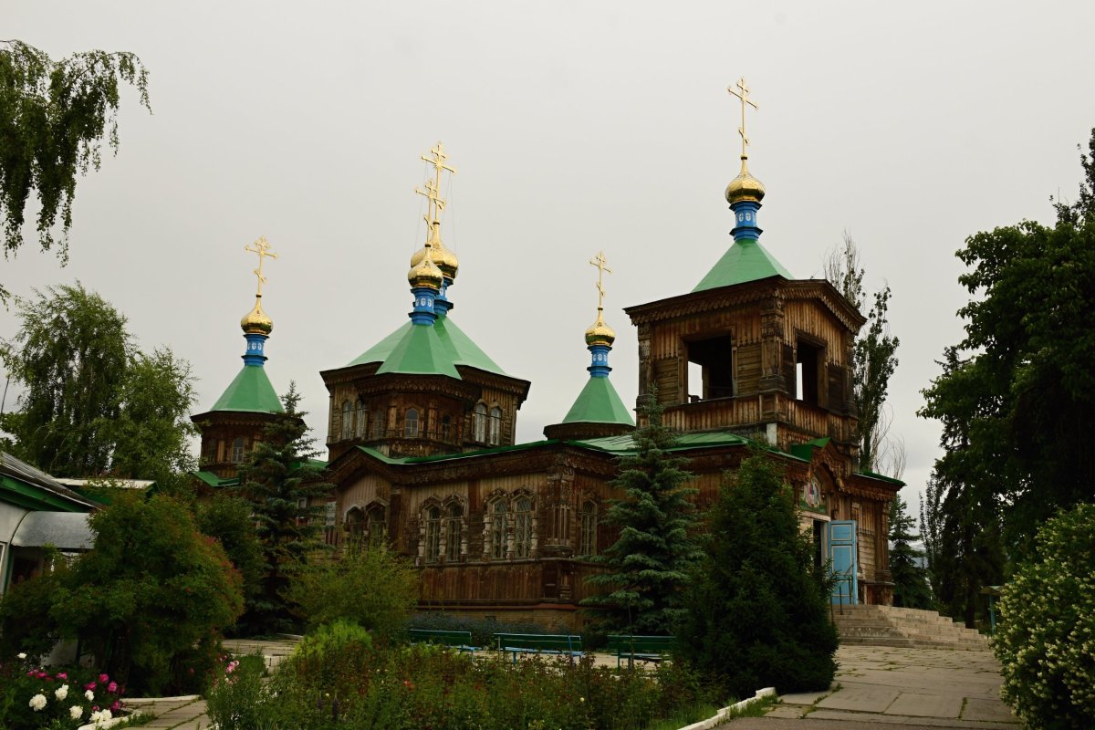 Pokračujeme ke kaňonu Konorčok, kus si ho projdeme a pak jedeme do Čolpon Aty, kde přespíme. Ráno se jdeme podívat na další kameniště s petroglyfy, mezi kterými se procházejí koně. Pak už uháníme po severním okraji jezera až do Pristaň Prževalsk, kde má být muzeum Převalského. Ano, toho, co jsou po něm pojmenovány koně. Muzeum je věnováno jeho cestám, ale připadalo nám takové nic moc, tak jsme byli rádi, že v pokladně nikdo nebyl a nemuseli jsme platit vstupné. Pak už konečně přijíždíme do Karakolu. Tam si jdeme sehnat odvoz do hor na zítra. Cestou si prohlížíme moc hezký dřevěný pravoslavný kostel svaté Trojice a zajímavou mešitu, kterou bych spíš zařadil někam mezi jihoasijské chrámy. Pak ještě couráme po Karakolu. V jedné pivnici mají dobré pivo a na zdi vlajku Sovětského svazu (viz fotka níže). Ono všeobecně je Kyrgystán více orientován na bývalý Sovětský svaz.