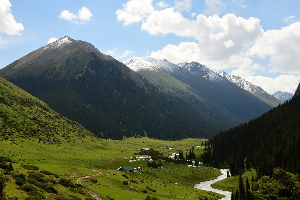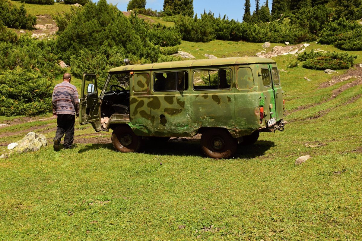 Konečně se vydáváme do hor. Kvůli nim se přece do Kyrgystánu jezdí. Ráno přijíždí Voloďa s rozhrkaným prorezavělým UAZem, který jsme si včera objednali za 7 000 KGS. Půjčené auto necháváme v ubytování, za dva dny se sem zase vrátíme. Voloďa startuje a vyrážíme. Do Ak-Suu je to po asfaltu, ale pak začíná horská cesta. Čekal jsem mnohé, ale tahle cesta byla opravdu mazec. Velké kameny, občas bahno, občas prudce do kopce,... Voloďa cestou nabírá ještě nějakého domorodce a pak si s ním povídá a jen tak mimochodem řídí auto. My vzadu se kymácíme, poskakujeme a jsme rádi, že se nějak držíme na sedadle. Je to krásných 14 kilometrů. Pak se najednou otevře údolí Altyn Arašan, Voloďa nám zastavuje na vyhlídce a poprvé se kocháme krásou hor. Pomalu sjíždíme z kopečka k našemu ubytování, kde se s Voloďou loučíme. Pak se jdeme projít údolím a pozorujeme pasoucí se koně. Bohužel se začínají stahovat mraky a začíná hřmít, tak se jdeme radši schovat.