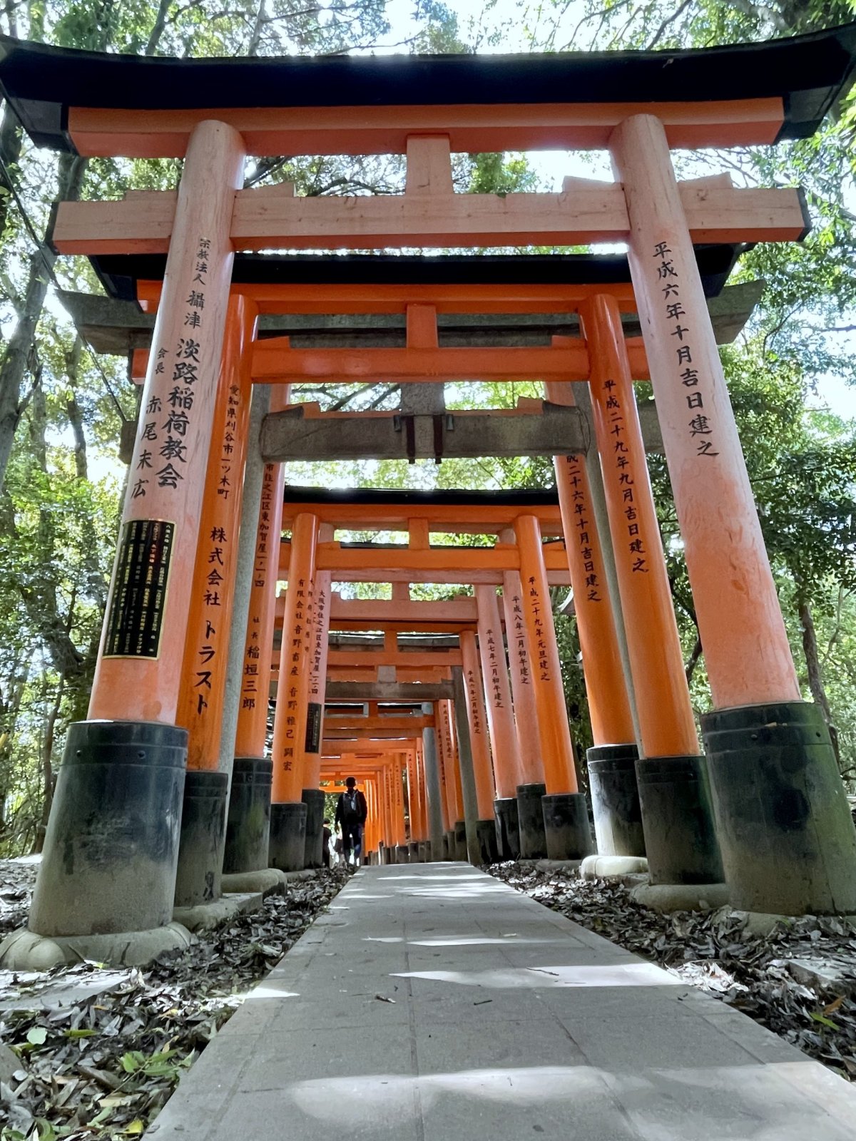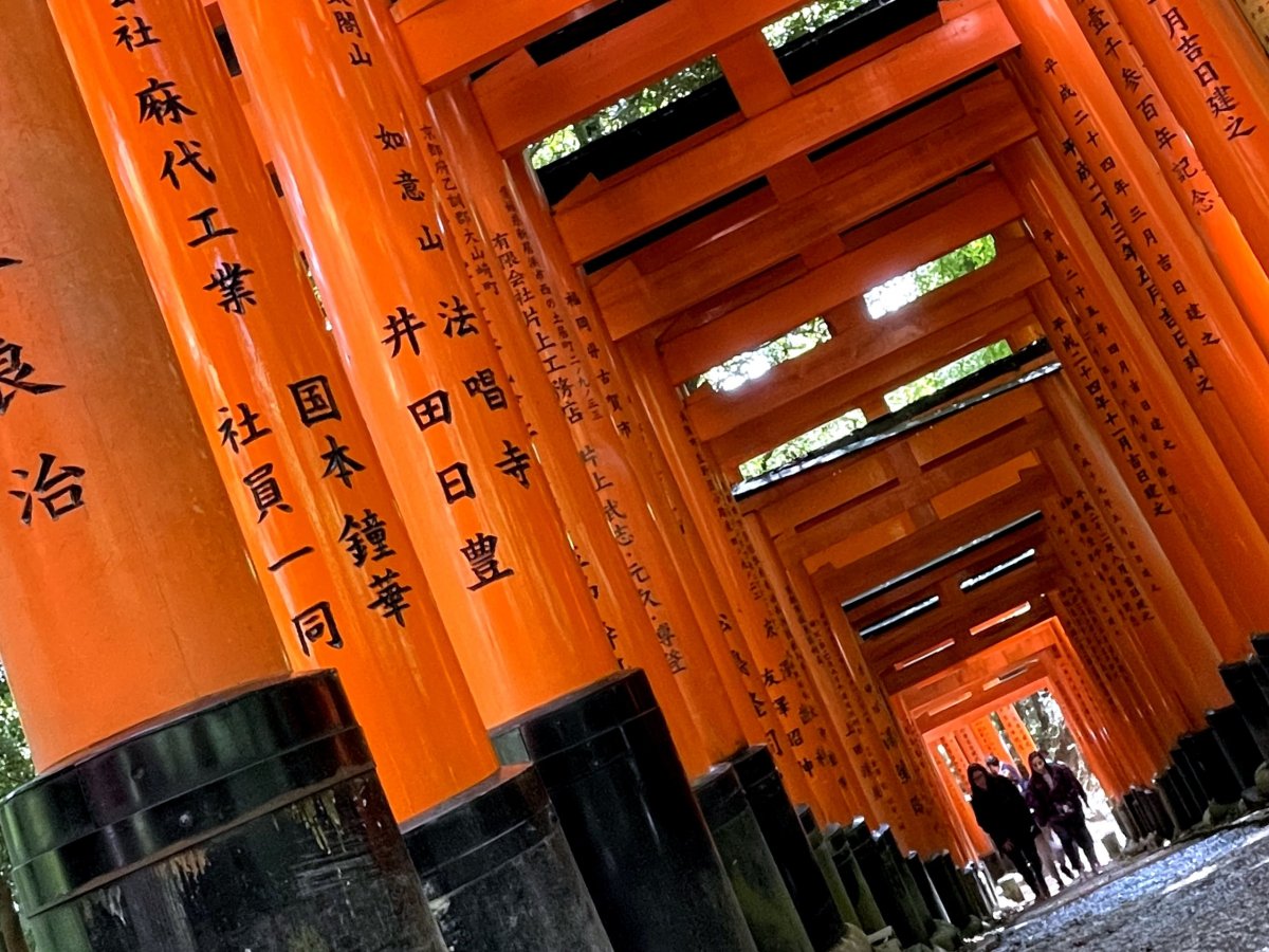 Protáhlý čumáček staví na minutu a centimetr přesně. Každý typ vozu má na zemi značení, kde který vagon zastaví, takže orientace místa nástupu je efektivní. I když fluktuace lidí je neuvěřitelná, díky perfektní organizaci, načasování a mentalitě lidí, kdy každý přicházející si prostě stoupne do fronty poslední a čeká, se výměna cestujících stihne ve velmi krátkém intervalu a vlak odjíždí na čas. Rychlost kolem 300 km/h vůbec necítíme a v Kyotu jsme za něco málo přes 2 hodiny. Opět hodíme věci na hotel (opět ze sítě sotetsu Fresa INN, tentokrát Kyoto-Shijokarasuma) a metrem se přibližujeme k Fushimi Inari, snad nejznámější shintojské svatyni. Obleněni po nepohodlné noci na nádraží procházíme tisíce oranžových bran torii, které zde budují jednotlivé firmy s vidinou úspěchu a většího zisku. Taky zde potkáváme první bytosti zahalené v tradičním kimonu. Těžko se nám evropanům rozlišují pravé Geishi od převlečených asijských turistů, ale ve výsledku je nám to vlastně jedno, atmosféru místu dodávají i tak. Lidí je tady mnohem víc než bran samotných, ale i tak se dá najít místo, kde jsme aspoň chvíli sami. I tak jsme ale davy brzy přesyceni, a tak se procházkou vracíme na hotel, kupujeme večeři a zbytek dne se válíme na střídačku v posteli a ve vaně.