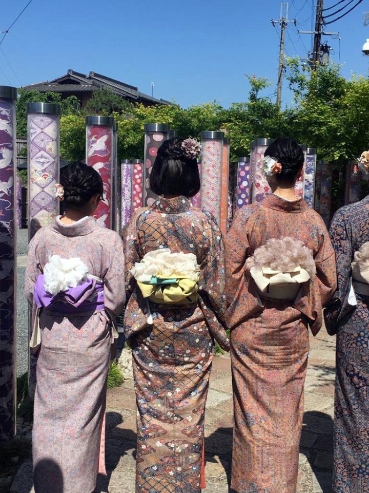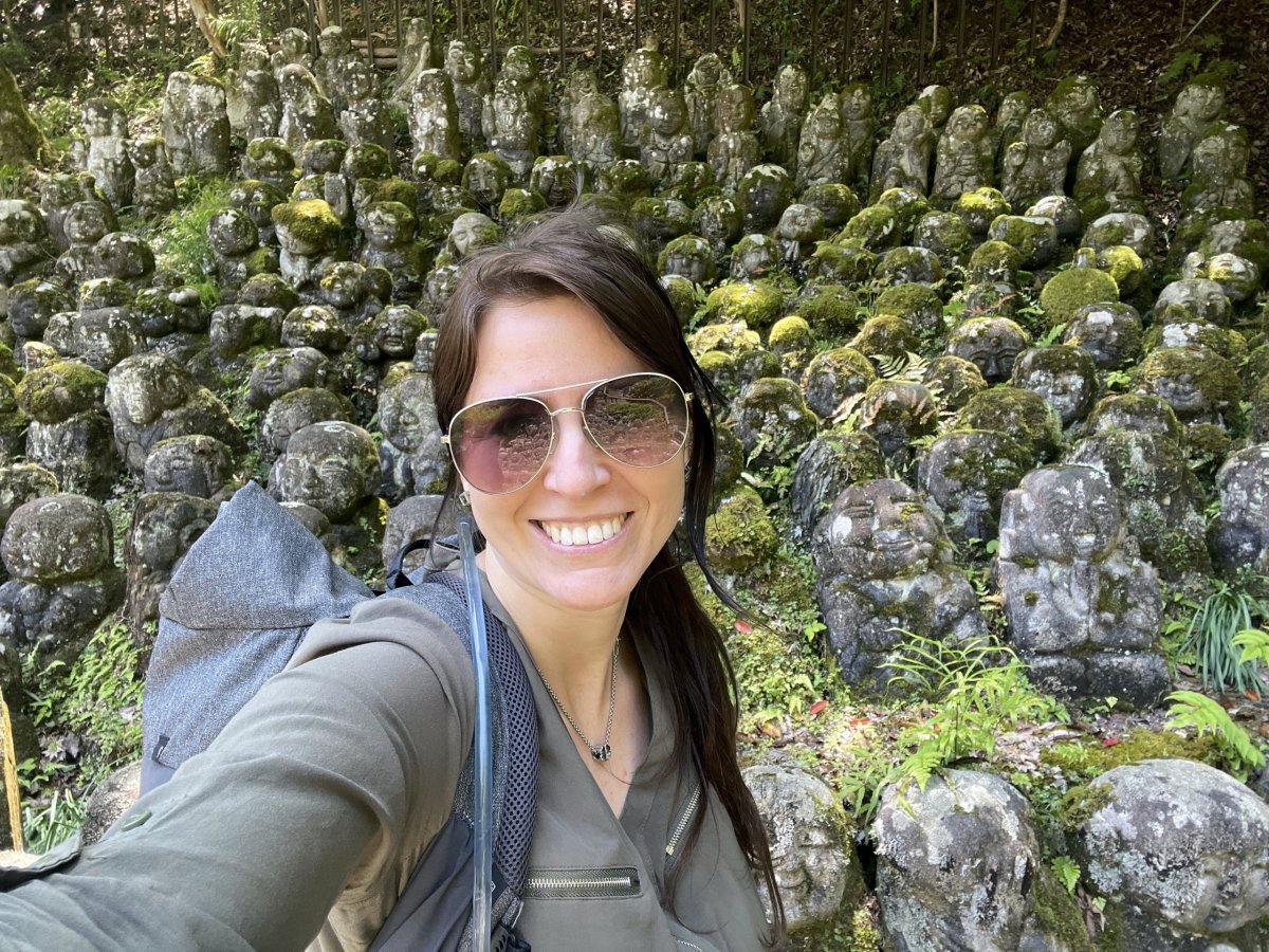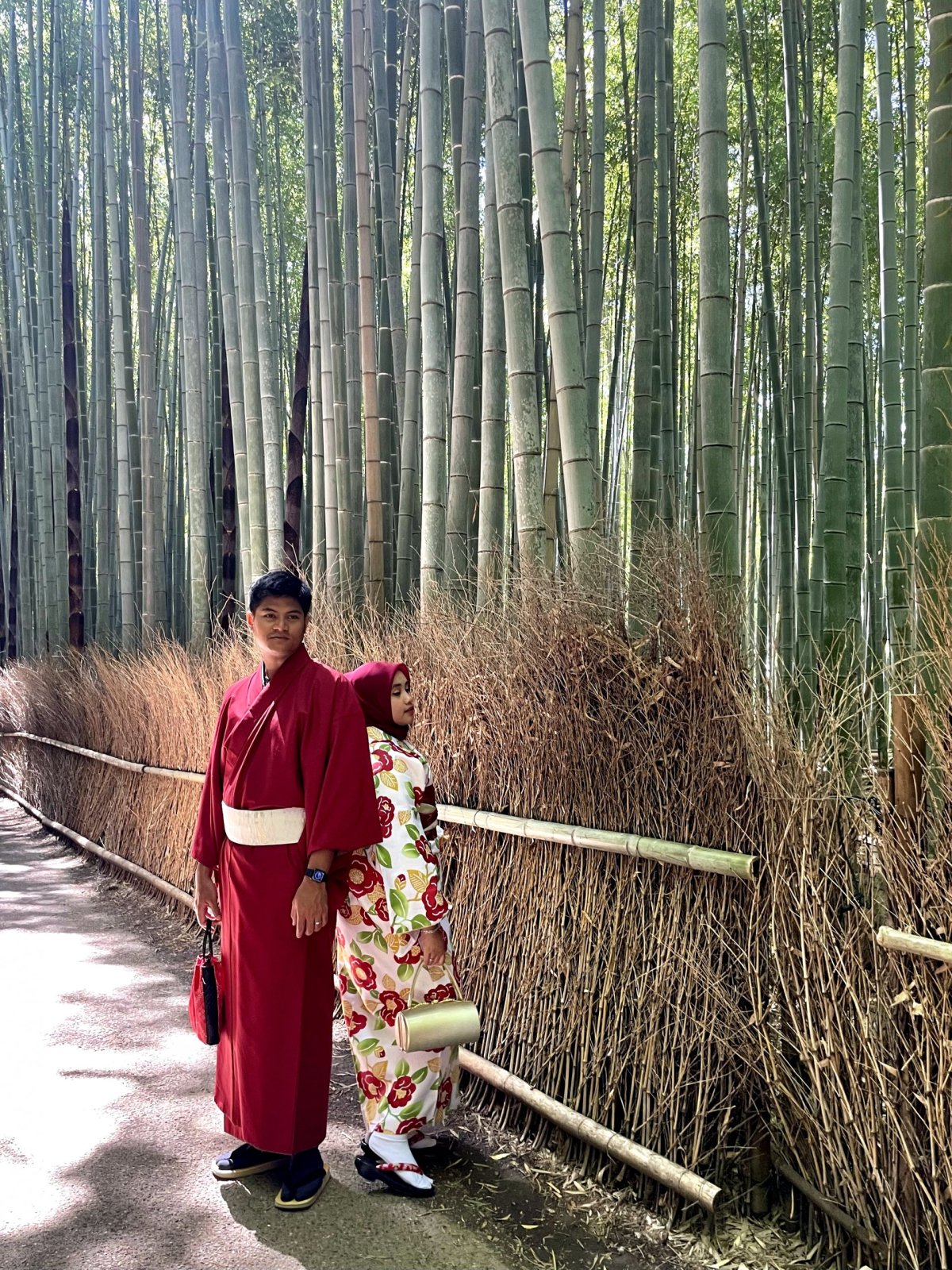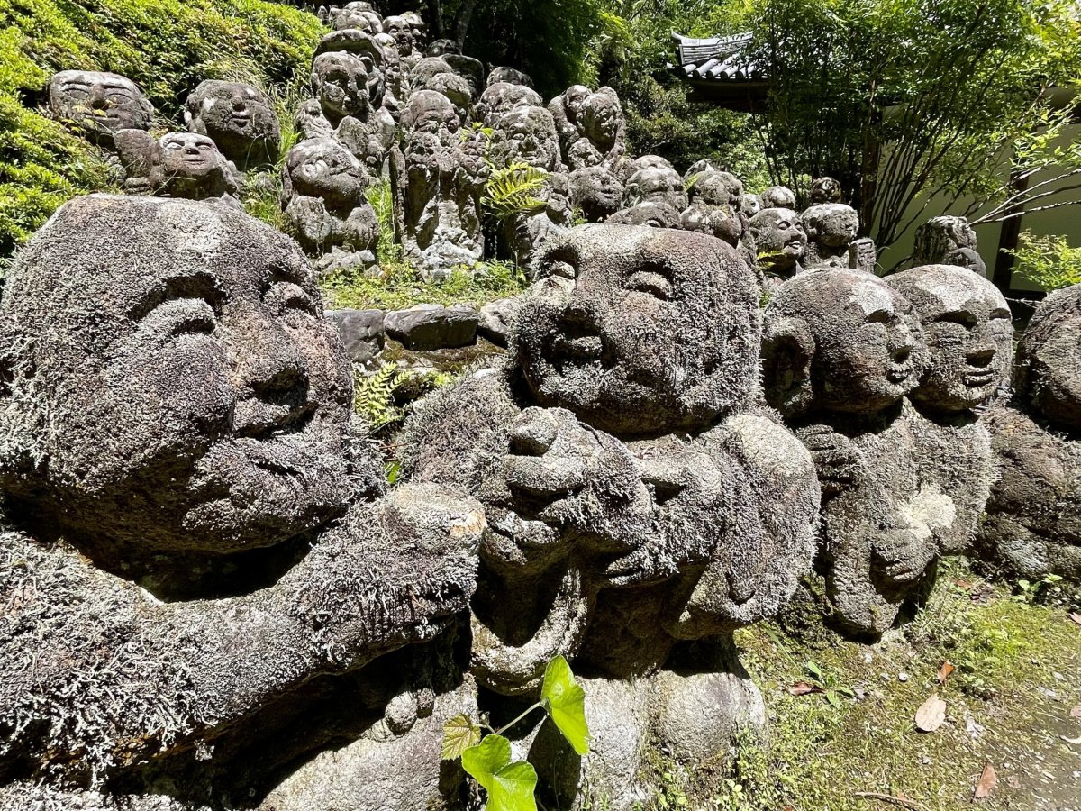 Odpočatí a voňaví se po snídani další den vydáváme autobusem k Arashiyama Bamboo Grove, bambusovému pralesu. Do busu se nastupuje zadními dveřmi, jízdné se platí při výstupu předními a to buď přesnou hotovostí nebo pohodlněji pípnutím SuicaCard. Krásnou, asi půlhodinovou procházkou, se dostáváme k bambusovému háji, který není nijak rozlehlý a kde množství turistů atraktivnosti nepřidá, a tak se moc nezdržujeme a pokračujeme dál k Otagi Nembutsu-ji Temple. Už cestou bytostí významně ubývá. Mechem a zubem času spotřebované rakan sochy (kamenné sochy představující Buddhovy učedníky), kterých se zde nachází kolem 1200 a kde každá má jiný výraz ve tváři, dodávají místu neuvěřitelné kouzlo. Jsme tady skoro sami, a tak máme spoustu času na odpočinek a meditaci v tradičním svatostánku. Po nabrání sil se vydáváme na cestu zpět. Hospůdky lemující trasu už pomalu otevírají, a tak se v jedné tradiční rodinné zastavujeme na domácí ramen. Interiér je koncipován pro drobné japonské postavy, takže po zaplnění převážně turisty působí místo poněkud stísněně. Na kvalitě jídla a požitku to však vůbec neubírá. Zpátky v Arashiyamě procházíme obchůdky a stánky s nejrůznějšími dobrotami a jdeme omrknout Kimono forrest. To jsou vlastně plastové válce, uvnitř kterých jsou nejrůznější vzory látek, z nichž se vyrábí kimono. Pak už jsme po celodenní chůzi ve sluneční výhni unaveni, navíc musíme brzo vstávat, tak se v podvečer vracíme zase zpátky domů.