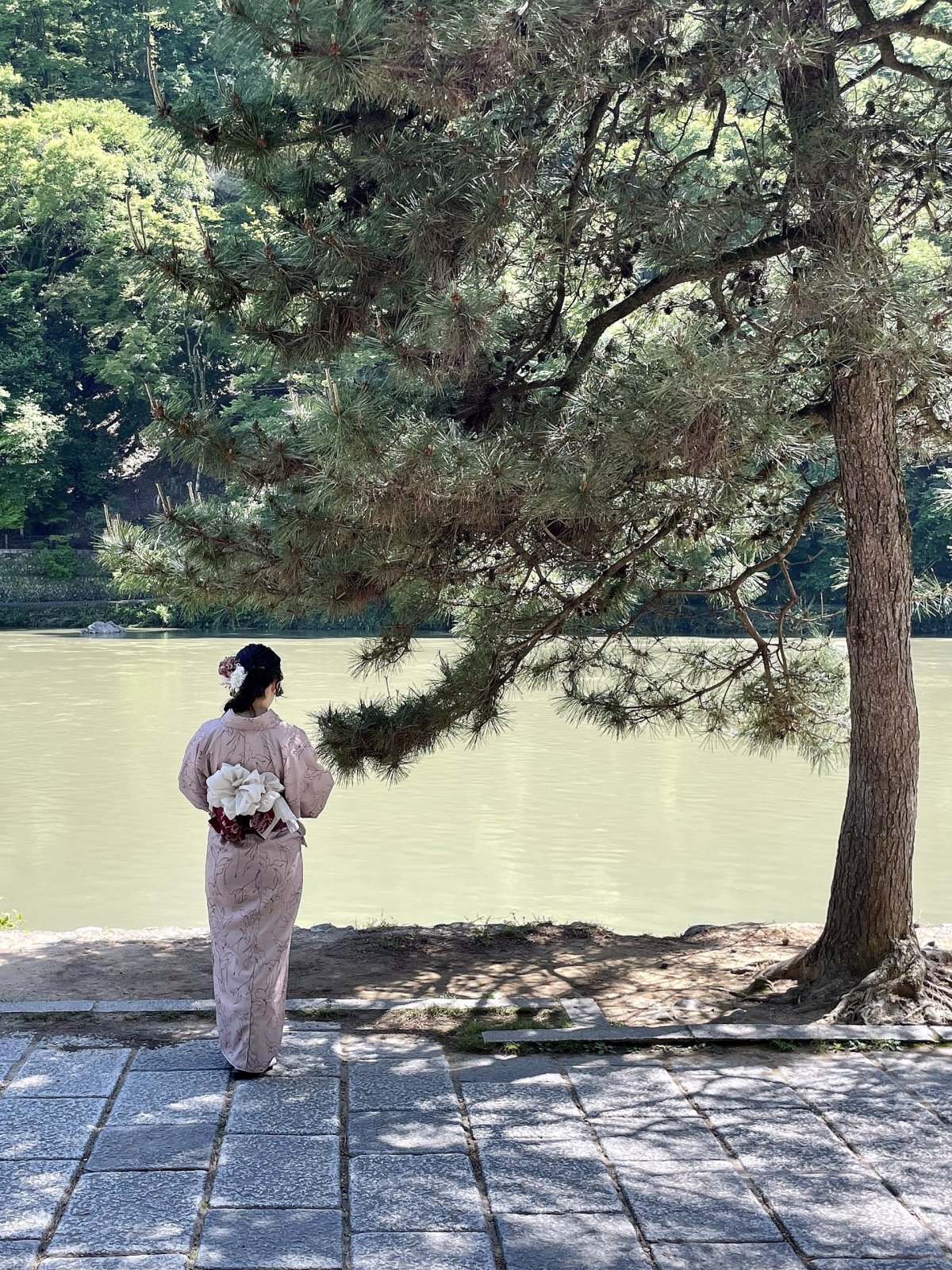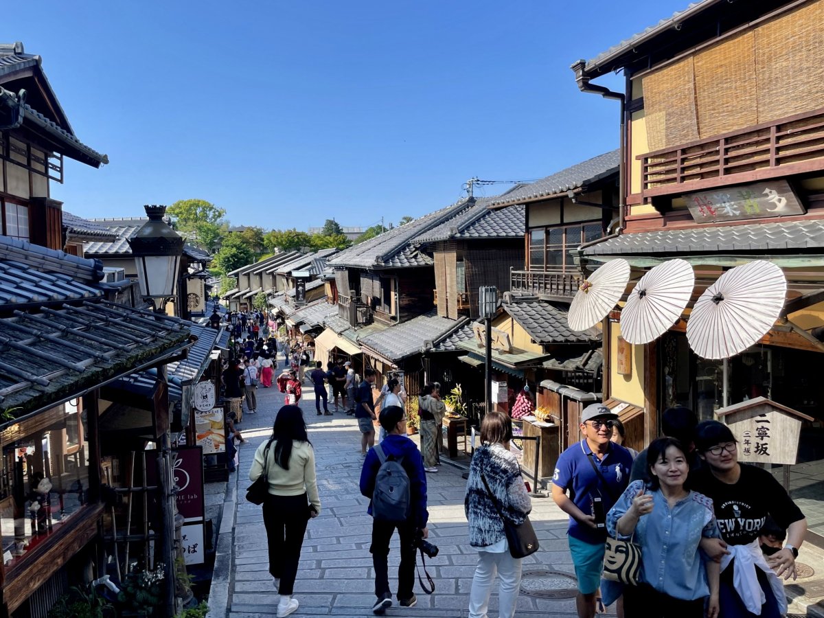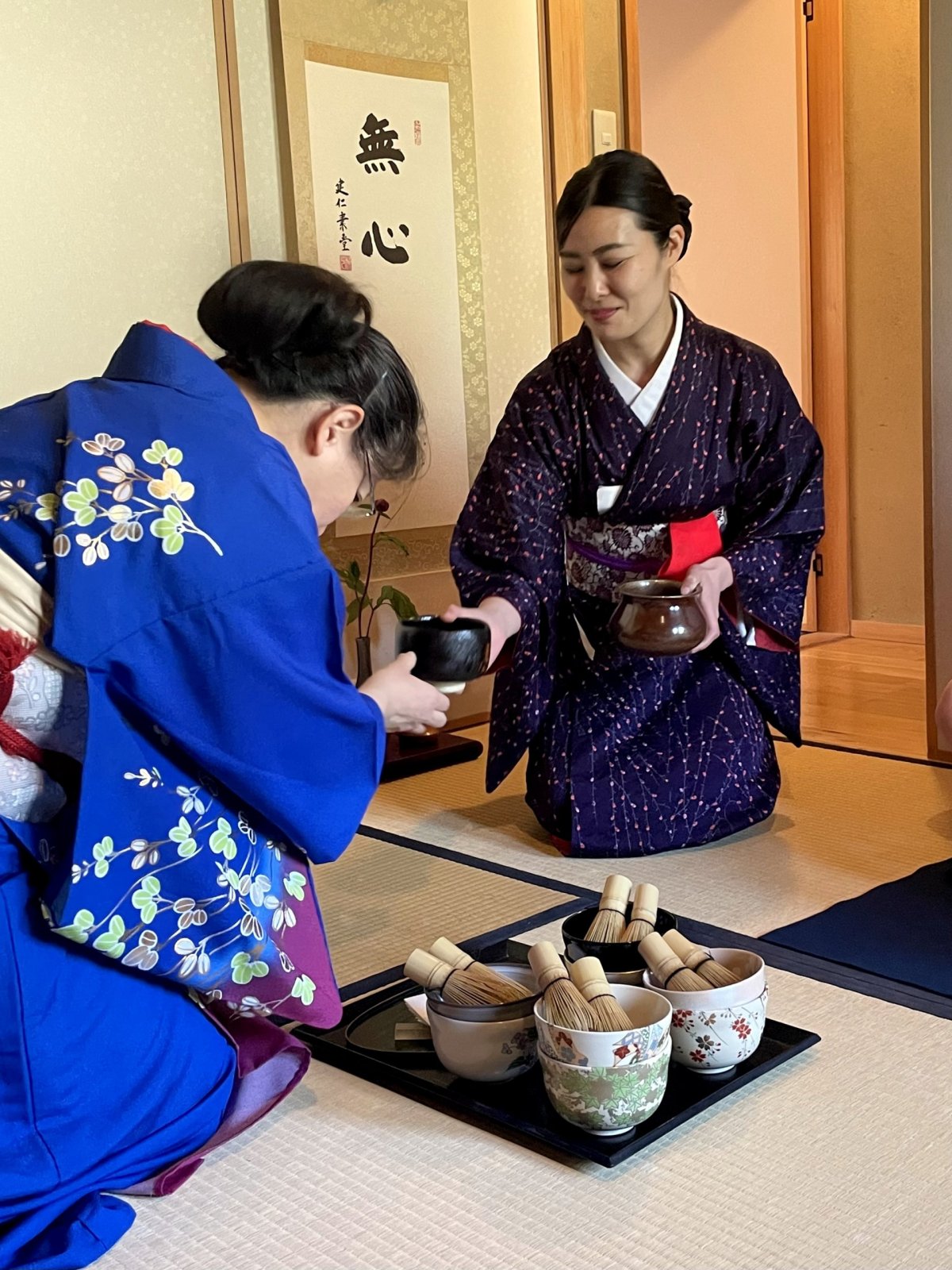 Ráno si po náročném předchozím dni přispíme a k chrámu Kiyomizu-Dera se tak vydáváme až před polednem. Je hrozné vedro, všude spousta lidí a my na ty památky zase tolik nejsme, a tak na chvíli kotvíme uprostřed hřbitova, který vzhledem připomíná Manhattan. Ve stínu zase nějaké minisvatyně si ke knížce kupujeme z automatu kafe a k našemu překvapení je plechovka teplá. Po siestě už míříme do čtvrti staré čtvrti Gion, kde se touláme původními uličkami až k odpolední zastávce při čajovém ceremoniálu. Tradičně oděna Japonka nás nejdříve zasvětí do složitosti celého procesu, jehož vážná atmosféra se nese až do chvíle, než nedopatřením skopne a rozlije vázu s vodou. To už se pak celý akt nese v poněkud uvolněnějším duchu, a tak je i to míchání čajového matcha prášku s vodou v misce štětkou na holení celkem zábava. Ale pít se to nedá. Po čaji a večeři se jdeme domů balit, protože se ráno přesouváme do města Kanazawa.