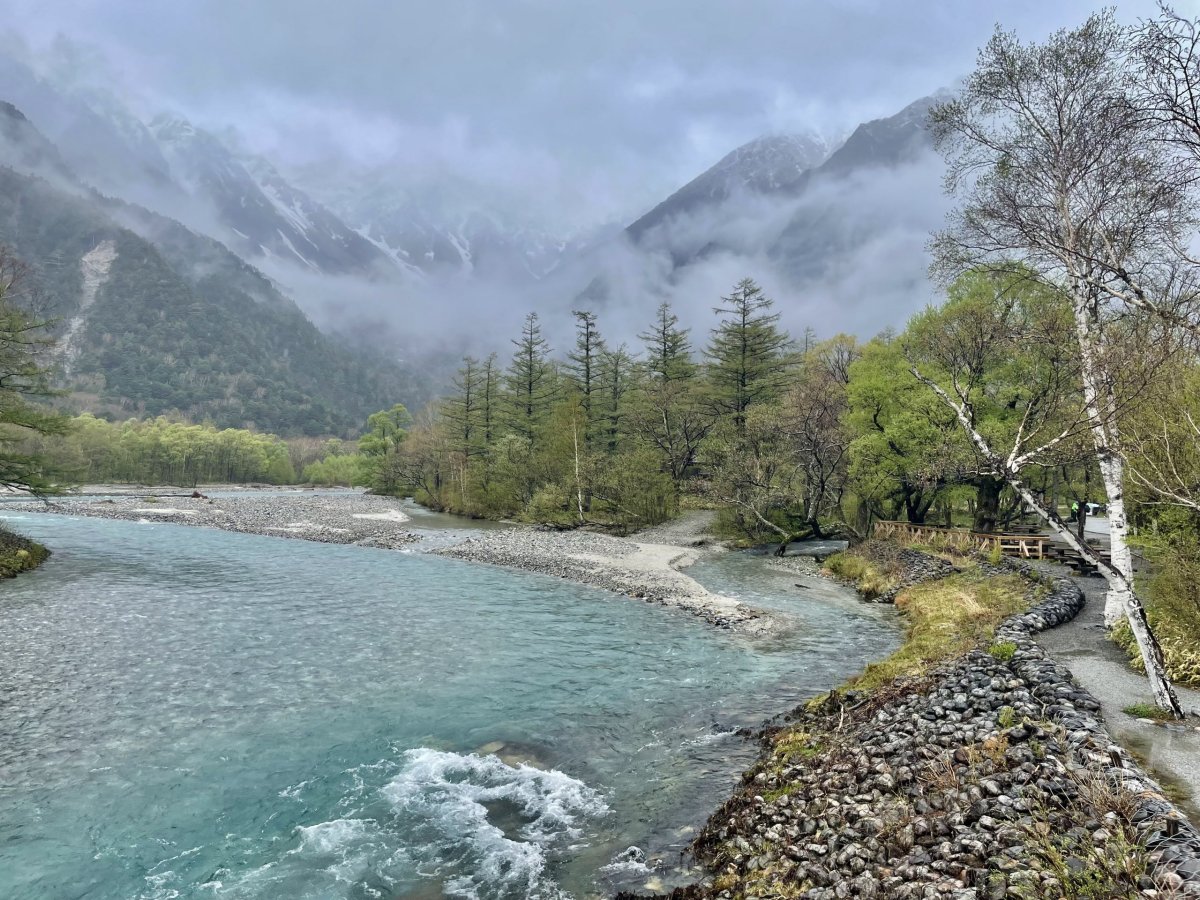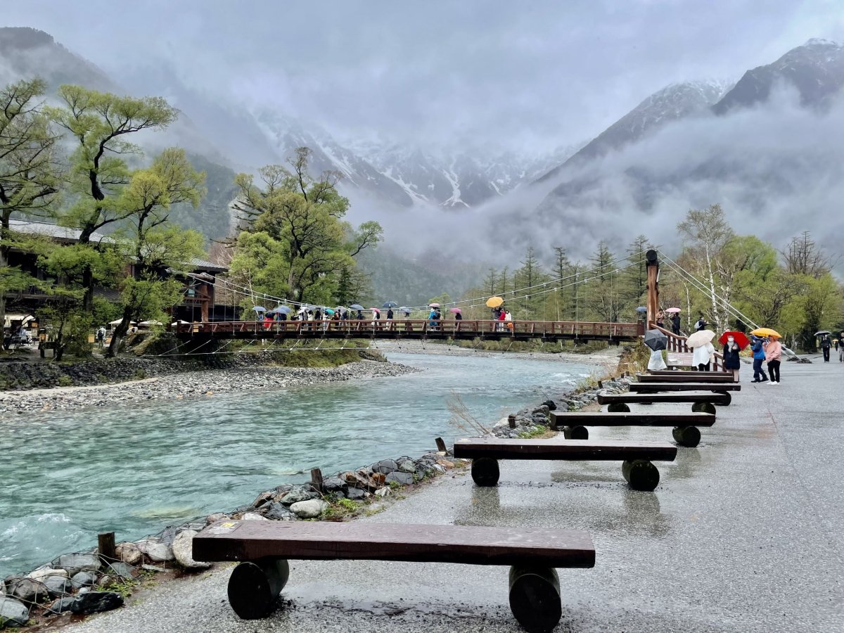 Ráno po snídani počasí nevypadá o moc lépe. Předpověď na další dny taky nic moc, tak se původního plánu do údolí Kamikochi nevzdáme. Bus jede něco přes hoďku a půl s nutným přestupem. Opět prší, tak nasazujeme pláštěnky a za již ustávajícího deště se vydáváme na asi pětikilometrový okruh. Výhledy kolem azurové řeky se zasněženými vrcholky Alp v pozadí jsou opravdu impozantní. K tomu u restauračky v kádích pěstované rybky, které na ohni ugrilované míří přímo na talíř, dotváří toto přírodní kouzlo. Cestou zpátky nás v těsné blízkosti míjí i několik opiček, kdy každá druhá má na zádech miminko. A to je teprve roztomilý pohled. Trochu promoklí a promrzlí se zase busem vracíme zpět na hotel a já se jdu opět ponořit do horké lázně.