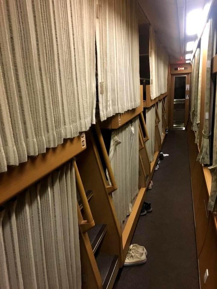 Ostravské letiště je malinkaté a slouží hlavně pro nákladní letadla, takže při frekvenci 2-3 letů denně není překvapením, že sehnat tady nějaké občerstvení je prostě problém. A tak jsme se vydali procházkou do okolí, kde zrovna nadšený motorkář otevřel novou hospůdku, a který nás se svým kamarádem až do odletu bavil svými drsnými historkami z cest. Hodinová cesta do Varšavy byl spíše takový vyhlídkový let před 6hodinových layoverem a před 23. hodinou už sedíme v DreamLineru směr Tokio. Let vzhledem k pohodlnosti stroje pocitově netrval oněch 12 hodin, a tak celkem odpočatí už zase za tmy míříme k imigračnímu. Letiště prázdné, tak jsme i s batohy venku do půl hodiny. Sedm hodin večer a hlavní tokijské letiště je úplně mrtvé. JR office, kde jsme chtěli vyměnit vouchery má už dávno zavřeno, tak jdeme vyzvednout alespoň SuicaCard. Takovou užitečnou kartičku vzhledu kreditky, která se dopředu nabije a pak se z ní platí jízdné, nákup v obchodě nebo třeba kafe v automatu. Zejména v metru či vlaku, kdy si po pípnutí při vstupu a výstupu sama spočítá jízdné, je její užití víc než komfortní bez starostí s kupováním lístků před každou cestou. Kromě fyzické karty, kde je vratná záloha 500 jenů se správním poplatkem kolem 200 jenů se dá použít i virtuální karta v appce (u novějších telefonů přímo přidáním do peněženky), kde si člověk ale musí ohlídat zůstatek, protože co na kartu pošle, může jen utratit, nikoli zůstatek refundovat, což u fyzické karty lze. No a když byla paní při vyřizování tak ochotná, tak jsem se rovnou zeptala i na JR pass. Prý není problém a vymění mi ho i ona. No super, rovnou tedy rezervuju i sleeping train za dva dny. Je to prý poslední jezdící vlak toho typu, který bývá dlouho dopředu vyprodaný, tak jsem měla radost, že na nás ještě nějaká místa zbyla.