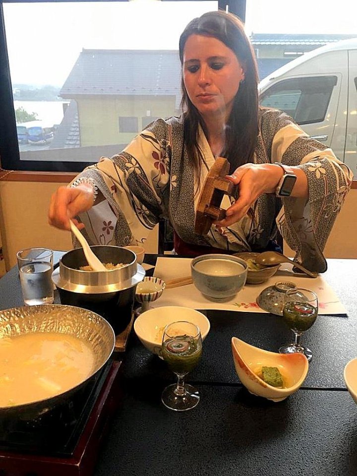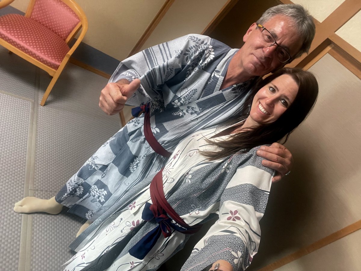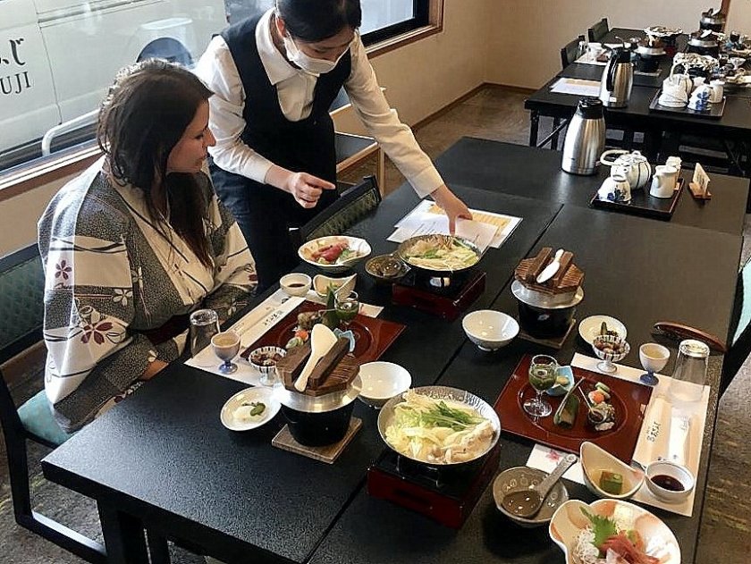 V Tokiu před 7 hodinou ranní posnídáme a rovnou přesedáme na vlak do Otsuki station, kde pro místní lokálkou (nutno koupit lístek zvlášť) pokračujeme do Kawaguchiko station. Tady pro nás přijedou a dokonce nás ubytují v Hotel Asafuji už něco po poledni. Konečně tradiční ryokan. Na zemi tatami podložky, uprostřed stolek se sedátky s připraveným matcha čajem a ve skříni nažehlené kimono. Jdeme na krátkou procházku kolem jezera, nad kterým se tyčí majestátní hora Fuji, poté opět onsen s výhledem přímo na Fudjinu, a už se strojíme do kimona na večeři. Večeře se podává formou Kaiseki - o několika chodech, a ke které potřebujeme instrukce. Tisic malinkých mističek, u kterých obsah a techniku konzumu lze jen těžko odhadovat. Naštěstí nejsme jediní, kdo má trochu problém, a tak se nám nikdo ani moc nesměje. Ochutnáváme sashimi, syrovou chobotnici, hot pot s houbičkami a zeleninou, syrovou i grilovanou rybu, zeleninu i zvířectvo v těstíčku nebo panáka s mořskými řasami, které se po napití táhnou jako sliz. Zkrátka průřez tradiční japonskou kuchyní. Než se vrátíme z večeře, místo stolíku a čaje už máme ustláno na futonových matračkách, a tak jen ležíme a nasáváme atmosféru.