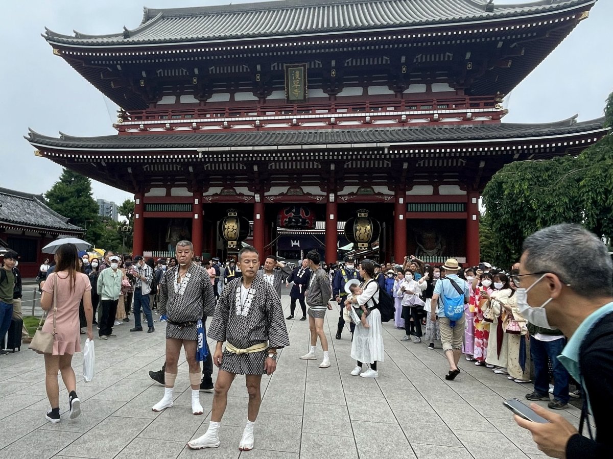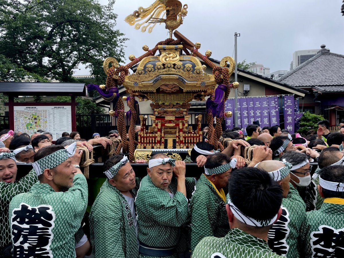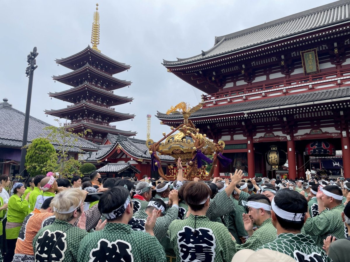 Další den se do Asakusy vracíme, protože tady má být festival. Lidí je plno, tak asi fakt něco proběhne. Počasí už je moudřejší, a tak si atmosféru slavnosti, kdy se ulicemi davy prodírají skupinky ve stejnokrojích nesoucí na ramenou mini svatostánky za bujarého pokřikování, užíváme. K obědu ochutnáváme dobroty z přilehlých stánků a přesouváme se do Ryogoku Kokugikan sumo arény.