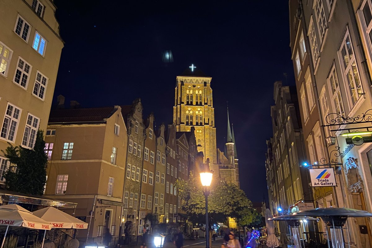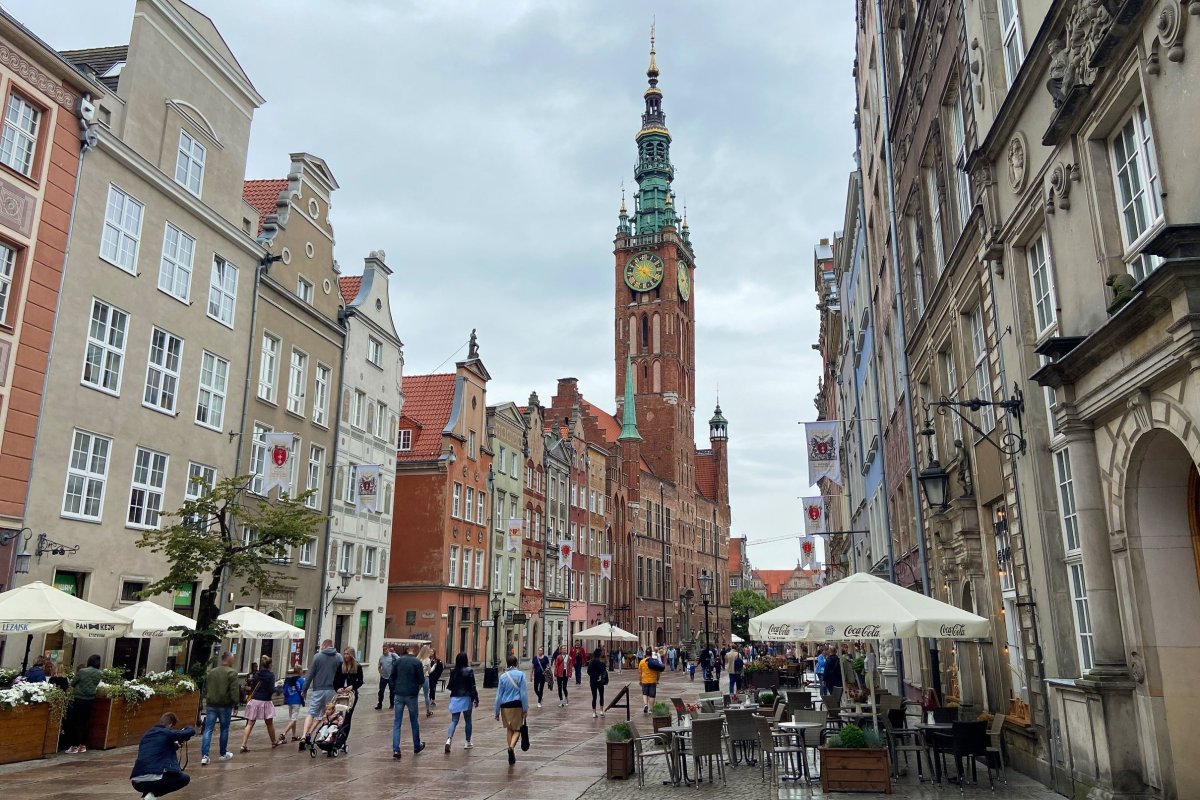 Jdeme od severu a začínáme na severu u Vysoké brány, za kterou následuje bývalá Katovna s vězeňskou věží. Zde dříve bylo zároveň muzeum jantaru, které ale bylo nedávno přesunuto do jiné části města. Poté už procházíme Zlatou branou na hlavní pěší třídu. Ulice Długa (nebo po našem Dlouhá), je opravdu dlouhá pěší zóna, která je pomyslným turistickým centrem. Procházíme širokou zónou plnou krásných hanzovních domů a také se spoustou restaurací a obchodů. Zastavujeme se u radnice, kde je možné vystoupat na věž, jen se musíme vrátit v jiný čas, ráno je ještě zavřeno.