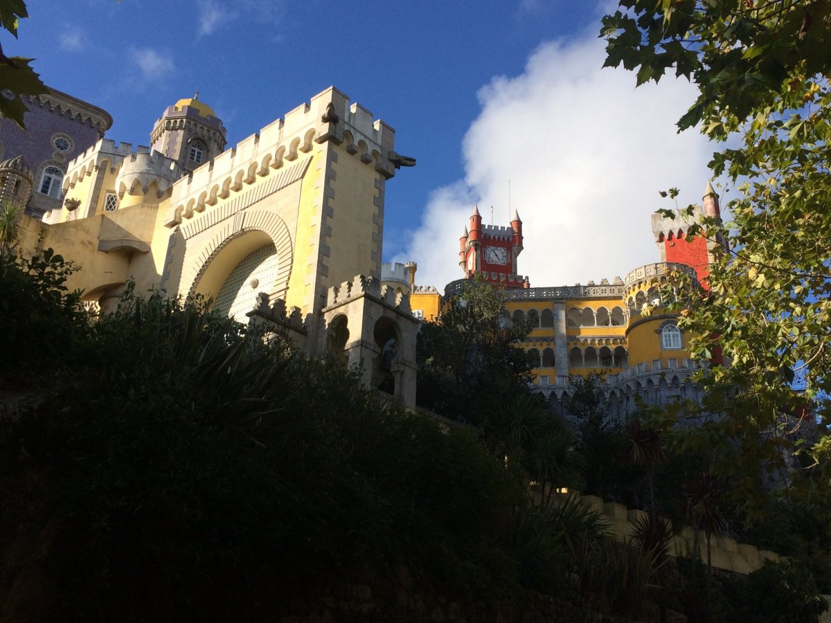 Byli jsme tedy v Sintře. Krása. Až na tu dopravu... Celý město je úchylnej systém jednosměrek. Na 100 metrů vzdálený parkoviště je to 10 kiláků kolem celýho města. Tak třeba kruhák: 5 výjezdů, z čehož 4 jednosměrky proti a pátá je v našem směru. Totální blázinec. Prakticky nikde v Portugalsku nejsou vidět policajti. Tady jsem je potkal 10x... Cesta k hradu a Palacio da Pena je pro auta uzavřená. Smí tam jedině místní tuktukáři - za 5€ na osobu tam a totéž zpátky. Bezva vymyšlený!