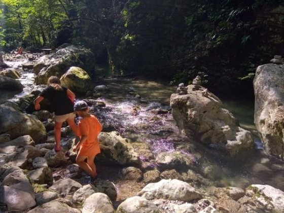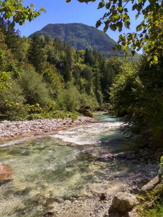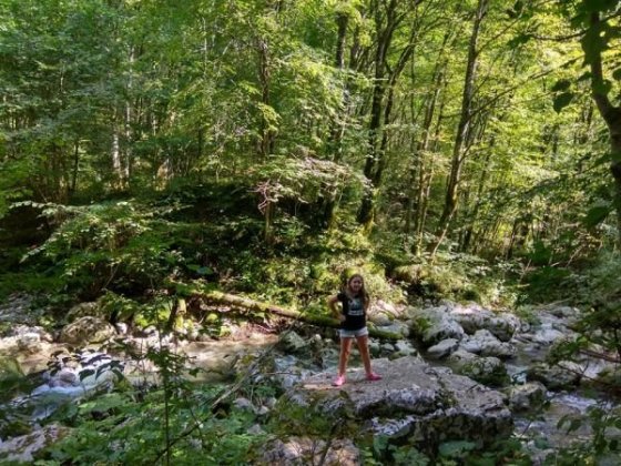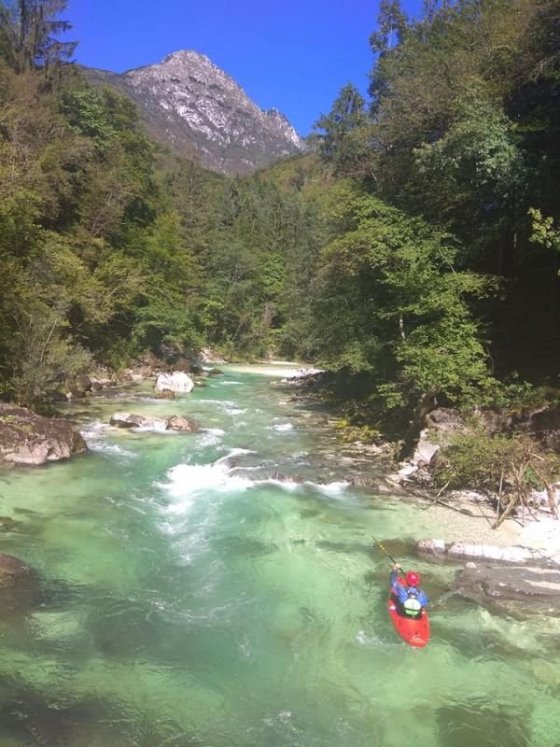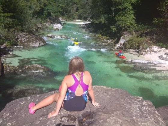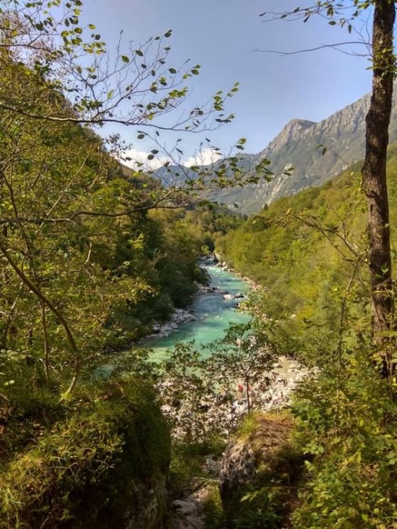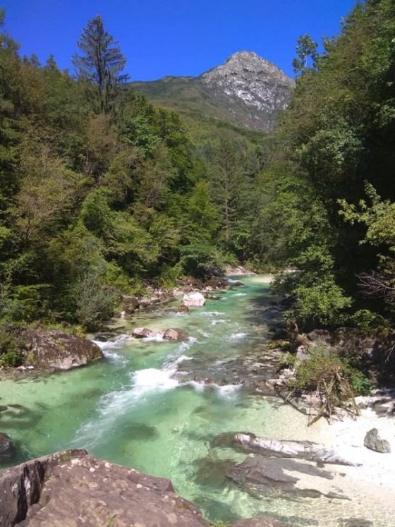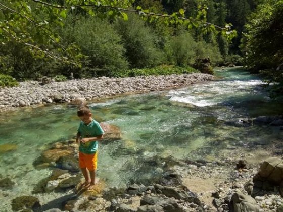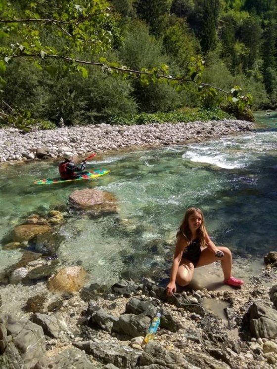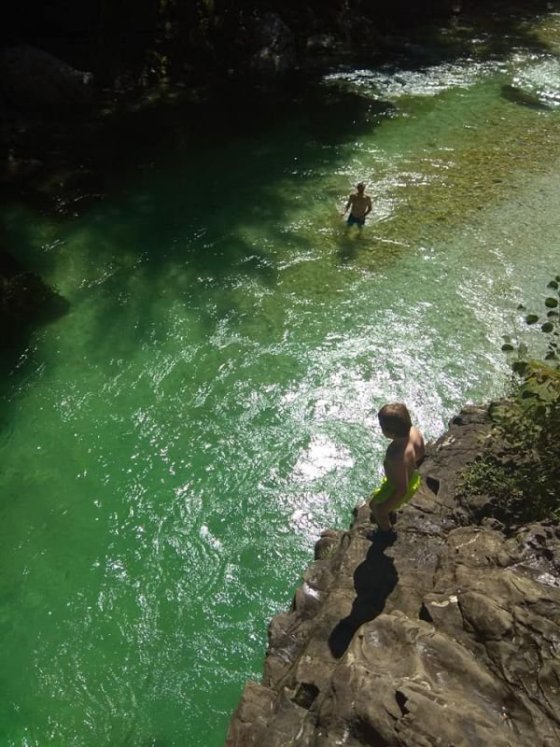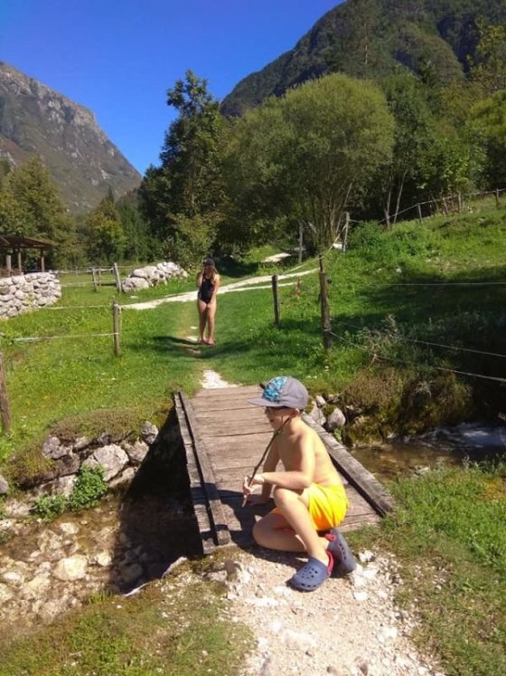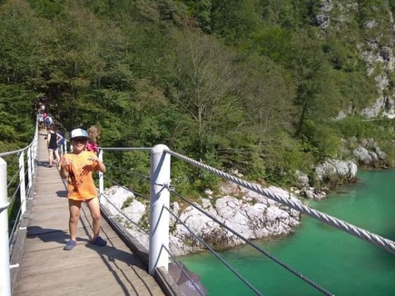 Na webu Alpicentra je několik tipů na kratší procházky po okolí, volíme tříhodinovou trasu Lávky přes Soču - http://www.alpicenter.cz/index.p...lavky-soca . Jde o pohodovou cestu pro celou rodinu s nádhernými výhledy na hory a řeku. Sluníčko pěkně paří a tak ledové osvěžení v Soče přijde vhod. Markétka sbírá odvahu a do řeky skočí ze skály. Brrrr, mně stačí smočit nohy po kolena. :-)