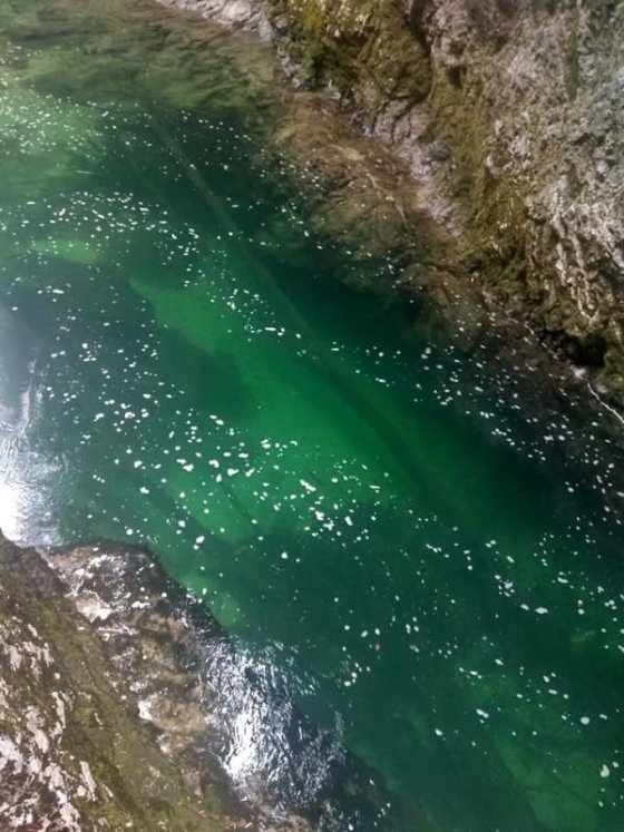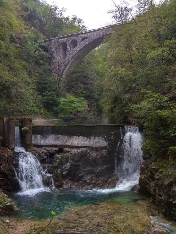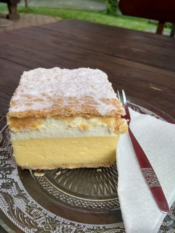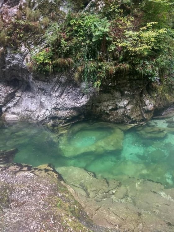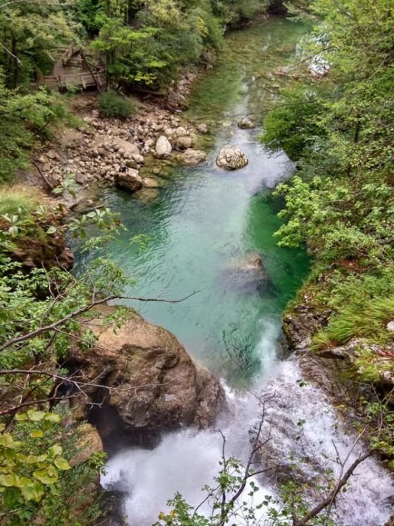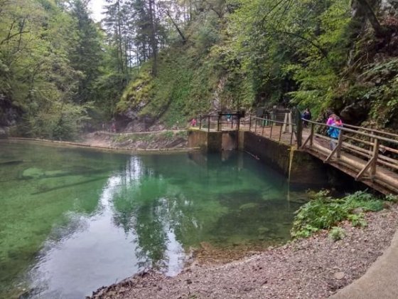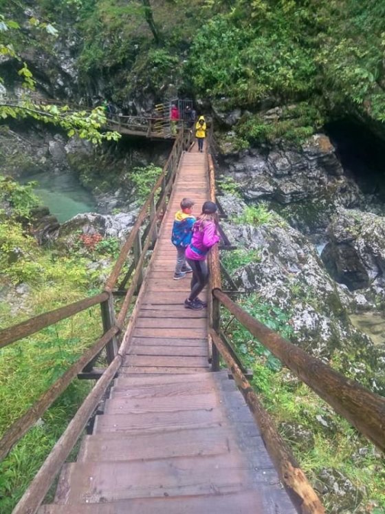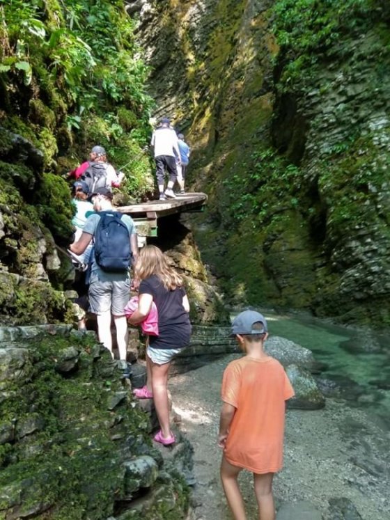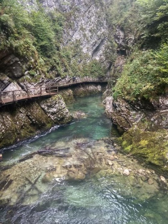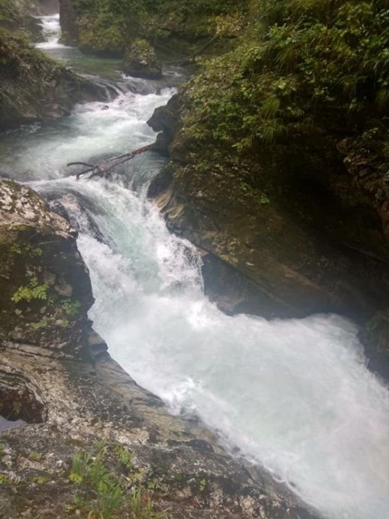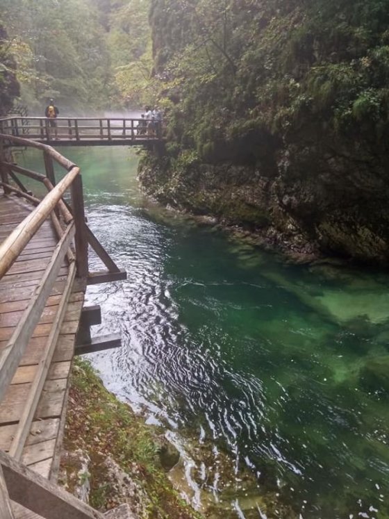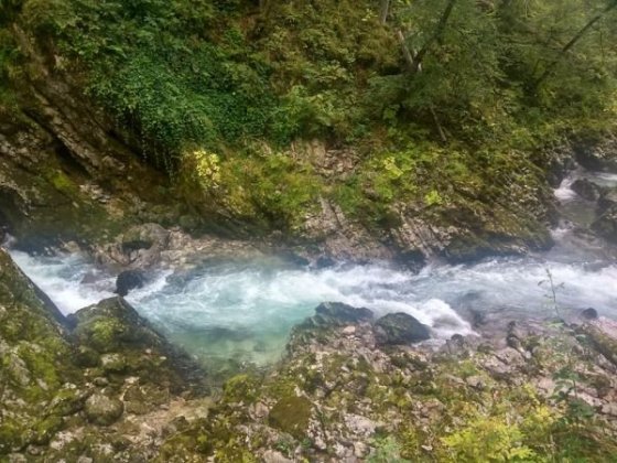 Další den bylo dost pod mrakem, ale poměrně teplo a bez deště, vyrážíme tedy na celodenní pěší výlet k soutěskám Vintgar. Vzhledem k nejistému počasí tu bylo minimum lidí, byl to moc pěkný výlet. Cestou zpět jsme zastavili v restauraci Jurček, vedle krásného kostelíku sv. Katariny, ochutnat místní specialitu - sladkou kremšnitu a burger z pljeskavice.