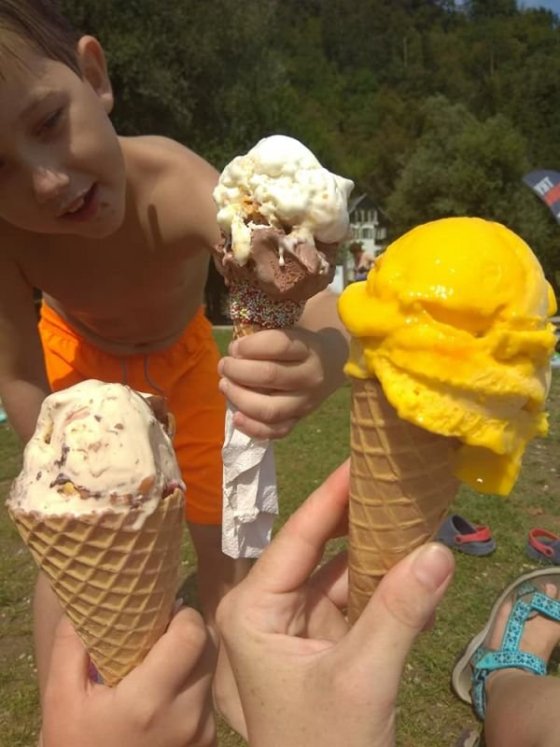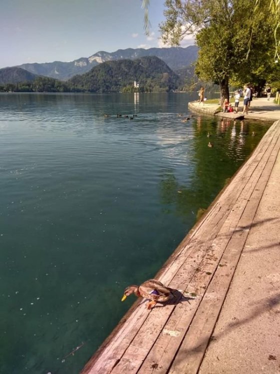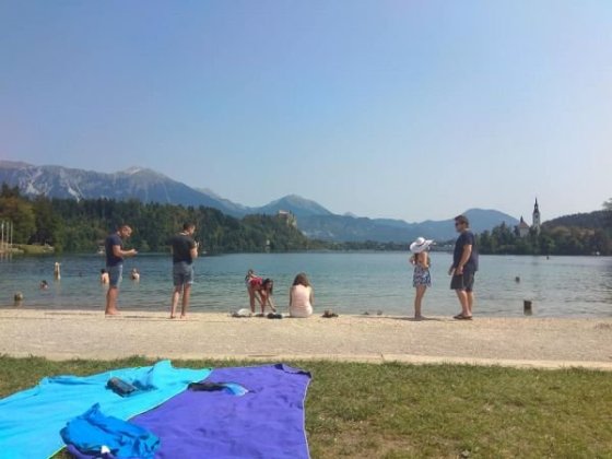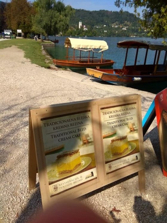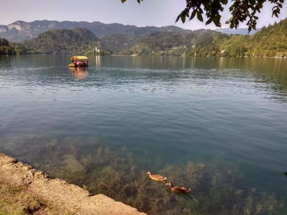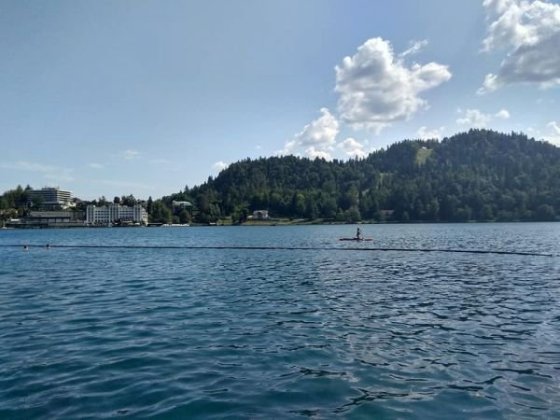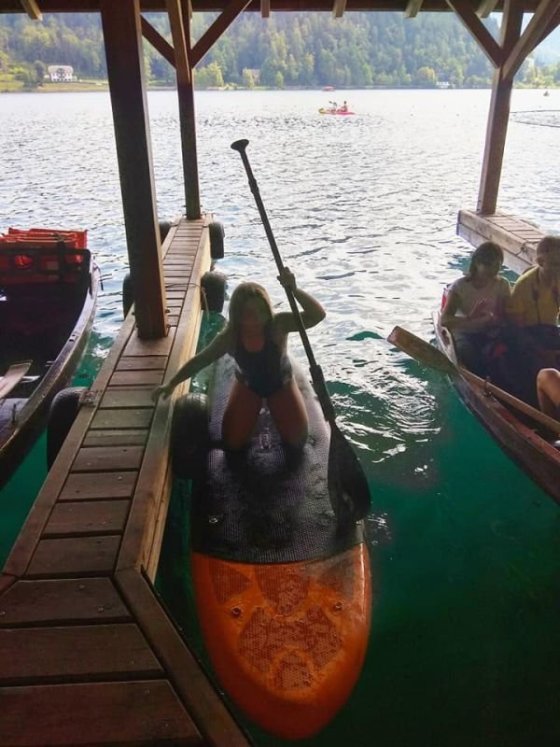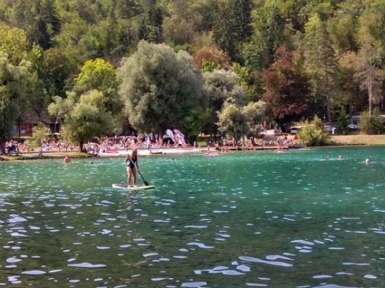 Ráno jsme se rozhodli využít posledních slunných letních dní a vyrazili na procházku okolo jezera Bled, najít vhodné místo ke koupání. Zjišťujeme, že moc možností zde není, buď na západním pobřeží v blízkosti kempu Bled (Velika Zaka) nebo na severním, v hradním přírodním koupališti. My pro dnešek zvolili první možnost. Dá se tu za poplatek nechat dovézt loďkou na známý, fotogenický ostrůvek uprostřed jezera a zpět, my zvolili místo loďky paddleboardy ( 10 EUR za hodinu). Také se tu pyšní nejlepší zmrzlinou na světě (Blejska sladoglednia). Kopeček stál něco kolem 3 EUR, ale zasytil nás namísto oběda. 😀