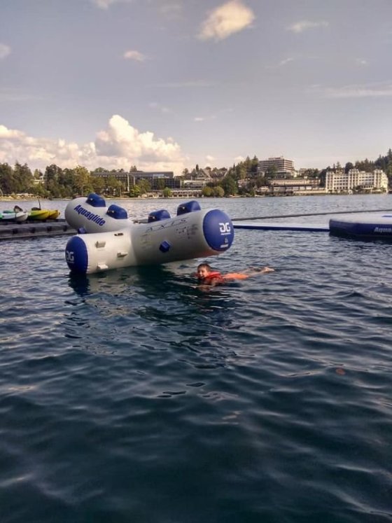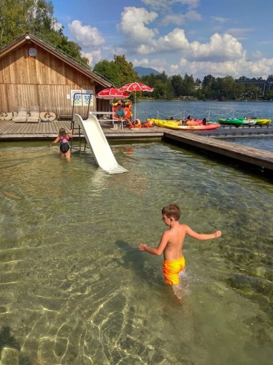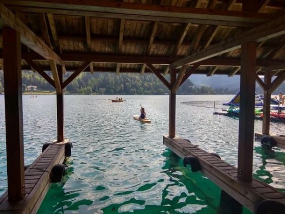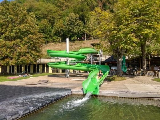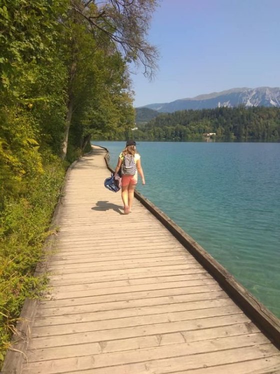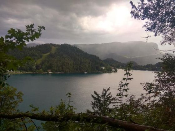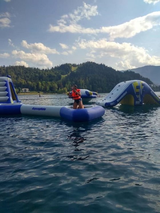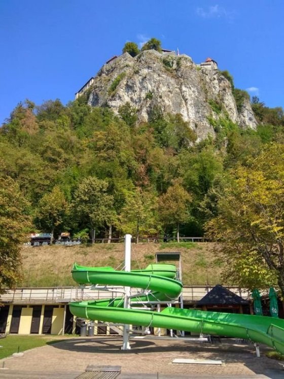 Další den sliboval zlom v počasí, k večeru se mělo zatáhnout a po zbytek pobytu pršet. Cíl byl tedy jasný - hradní koupaliště Bled na severním břehu. Markétka si znovu půjčila paddleboard, vyřádili jsme se na tobogánu a dalších vodních atrakcích a uživali poslední paprsky sluníčka, obklopeni horami a výhledem na jedno z nejfotografovanějších míst Evropy. Po koupání jsme ještě vyšlápli nahoru na hrad, tam už nás ale chytil slejvák a utíkali jsme zpět domů.