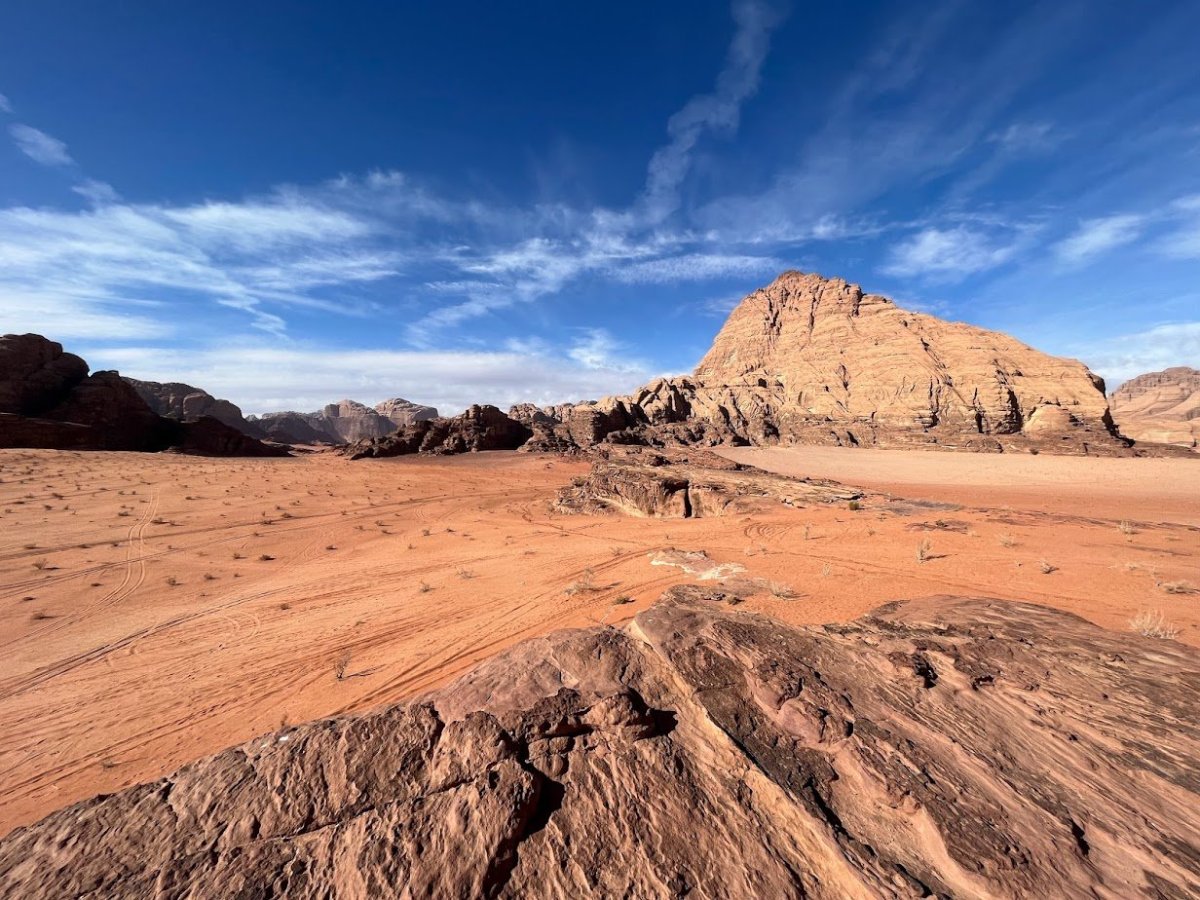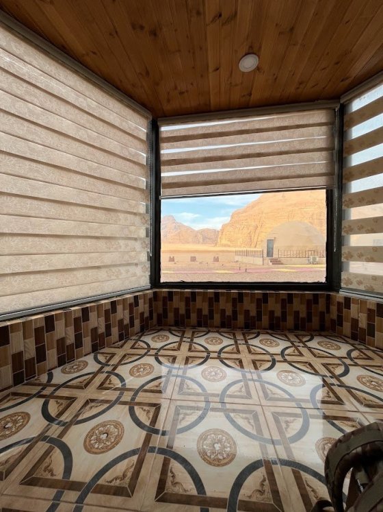Zamluvili jsme si Jamal kemp. Tento kemp jsem vybrali z důvodu, že jsme se domluvili na přijatelné ceně 45 JOD/ osoba za 4h jeep tour, snídani, večeři a ubytování s vlastními sociálkami. Po zaparkování auta na smluveném místě, nás vyzvedl místní řidič, který nás do našeho ubytování v poušti dovezl. Zpočátku jsme měla trošku strach, protože auto nevypadalo úplně v nejlepších letech na to, aby přejíždělo pískové pláně. Nakonec všechno probíhalo hladce.