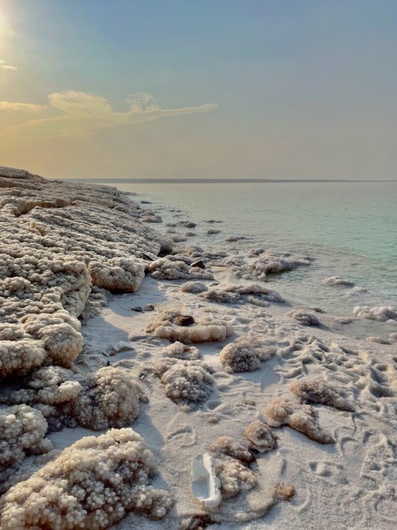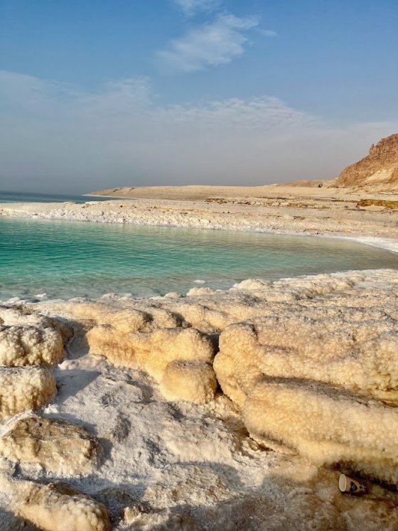 My si na rady ostatních zadali do navigace toto místo,, viz. mapa. Když jsme na něj však dojeli, byl tam sice fajn výhled, ale bylo nám jasné, že cesta dolů k moři by nám zabrala víc, než jsme chtěli + nebyla tam žádná značená cesta a přes ty "bahnité" pláně se vám tam opravdu nechce někde uvíznout jen kvůli tomu, abyste mohli říct, že jste se koupali v mrtvém moři. Tak jsme to vzdali, a rozhodli jsme se vyjet o kousek dál a objevit něco po cestě. A vyplatilo se popojet. Asi po dvou kilometrech uvidíte u cesty stáneček s parkovištěm a sprchou. Bingo. Společně s dalšími lidmi jsme sešli k vodě, kde jsme ale byli skoro sami. Nechyběl samozřejmě pán, jež nabízí bahno za pérfektníí cenu. A pán co nabízí sprchu. Tu jsme teda neodmítli. Voda má salinitu přes 33%, tudíž je člověk na oblíznutí úplně jak hodně přesolená mňamka. Nemilé. Jelikož jsme hloupí a naivní a neumíme smlouvat, tak jsme za jedno kafe společně se sprchou nechali 9 JOD, což je za mě opravdu hodně přepálené...no nic, musíme se naučit být trošku drzí a smlouvaví.