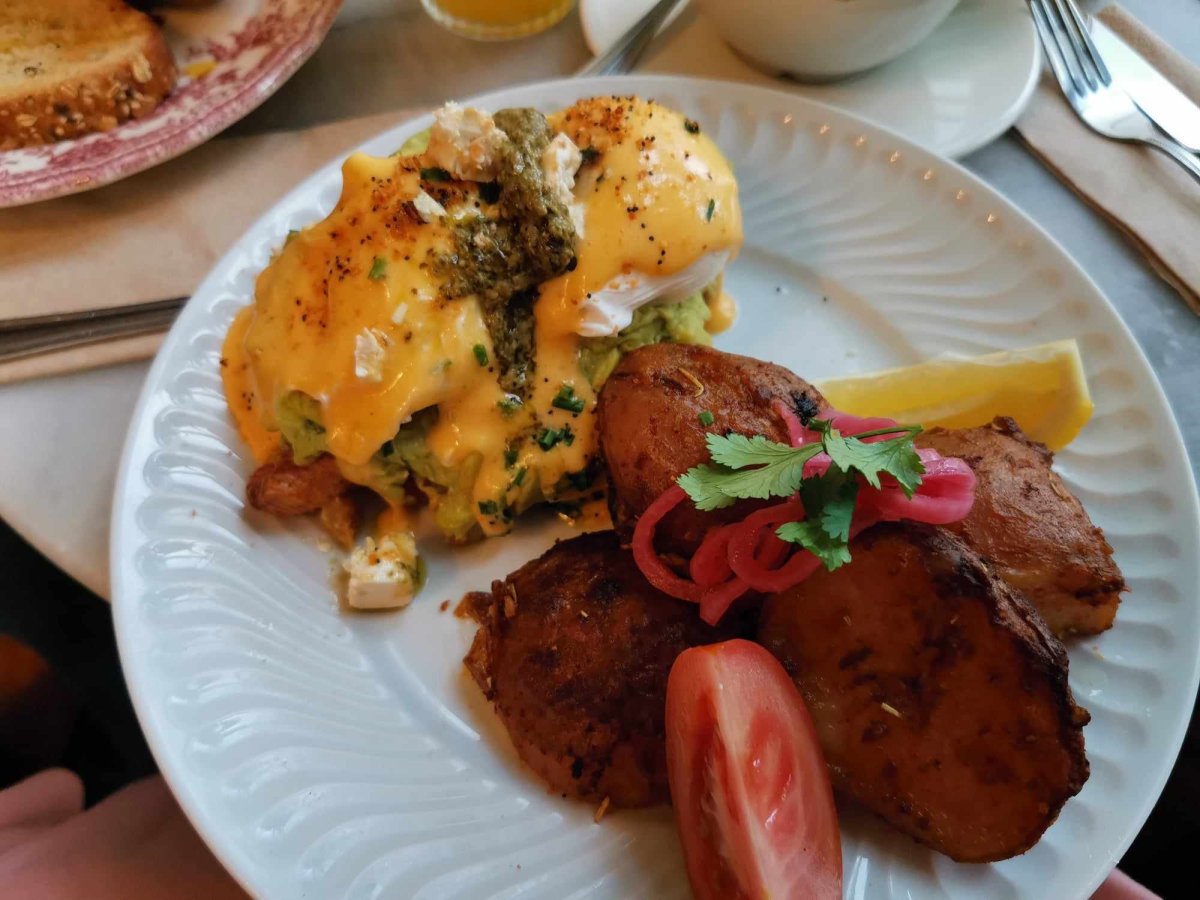 Vejce benedikt s avokádem a feta sýrem v Breakfast Lovers, trochu netradičně vám je tady naservírují s pečeným bramborem.