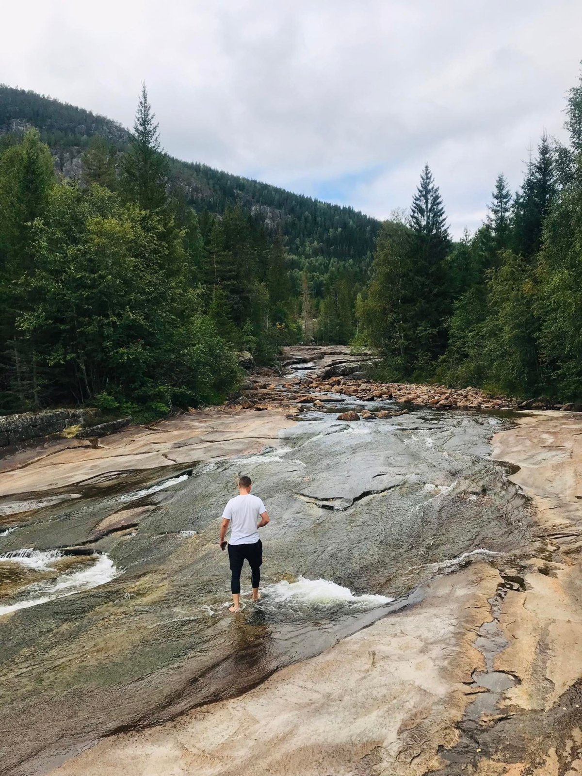 Cesta dolů je trochu obtížná. Jelikož vede většina cesty lesem, kde je díky potůčkům hodně vláhy, tak to docela klouže a tak jdeme opatrně. I tak mi párkrát podjelo kopýtko. Navíc ty potůčky jsou fajn. Cestou nahoru i dolů si v nich čepujeme vodu do lahví. Vlastně většinu naší dovolené pijeme jen vodu z potůčků a vodopádů, které potkáme téměř vždy na výšlapu. Voda je tu průzračně čistá a lahodná. Dole nás vyzvedne Kačka a odveze nás zpět do městečka, kde si někteří jdou dát něco k jídlu a my si s Julčou snad jako jediný dáváme opět smaženici. Dělal jí Ondra, který absolutně neuznává žádné koření. Takže je bez chuti. Naštěstí Kačka je zásobená a my si dáváme naši poslední smaženici v Norsku. Mohlo by jich být víc. Ale nikdo už to nechce jíst, jsme totálně přehoubovaný.