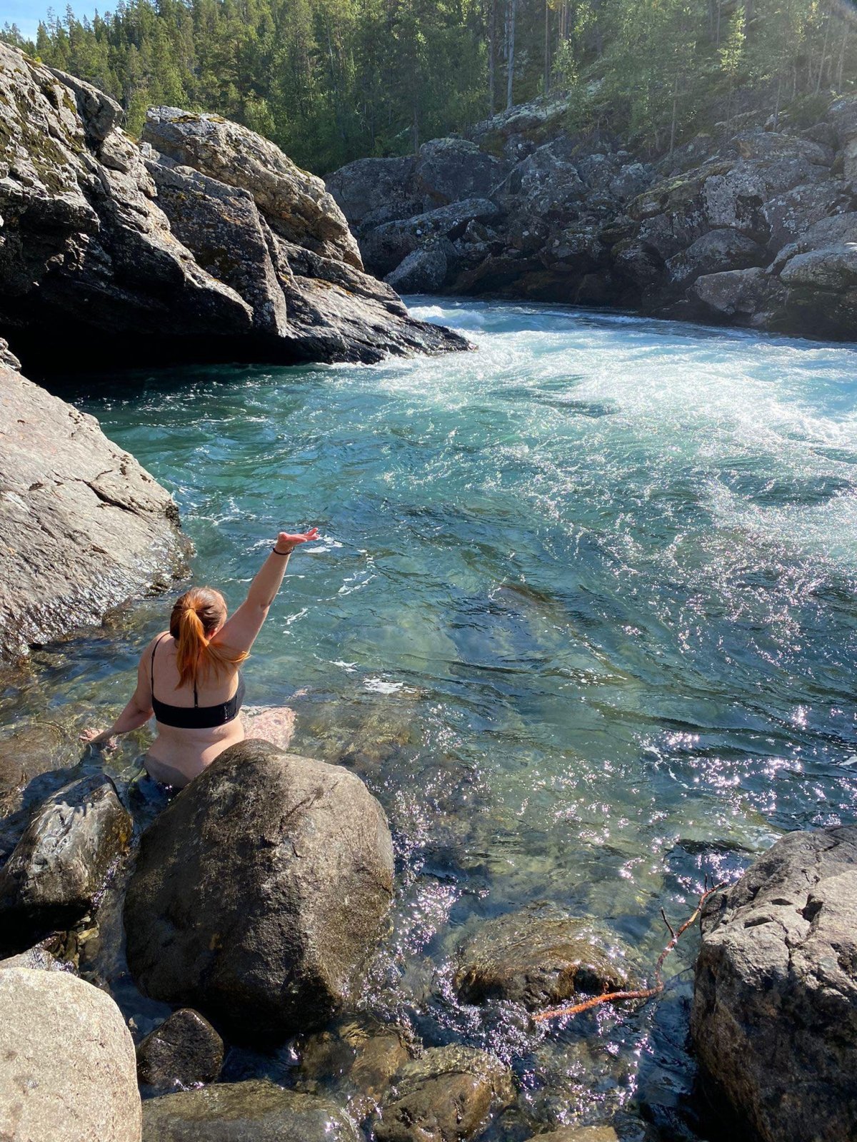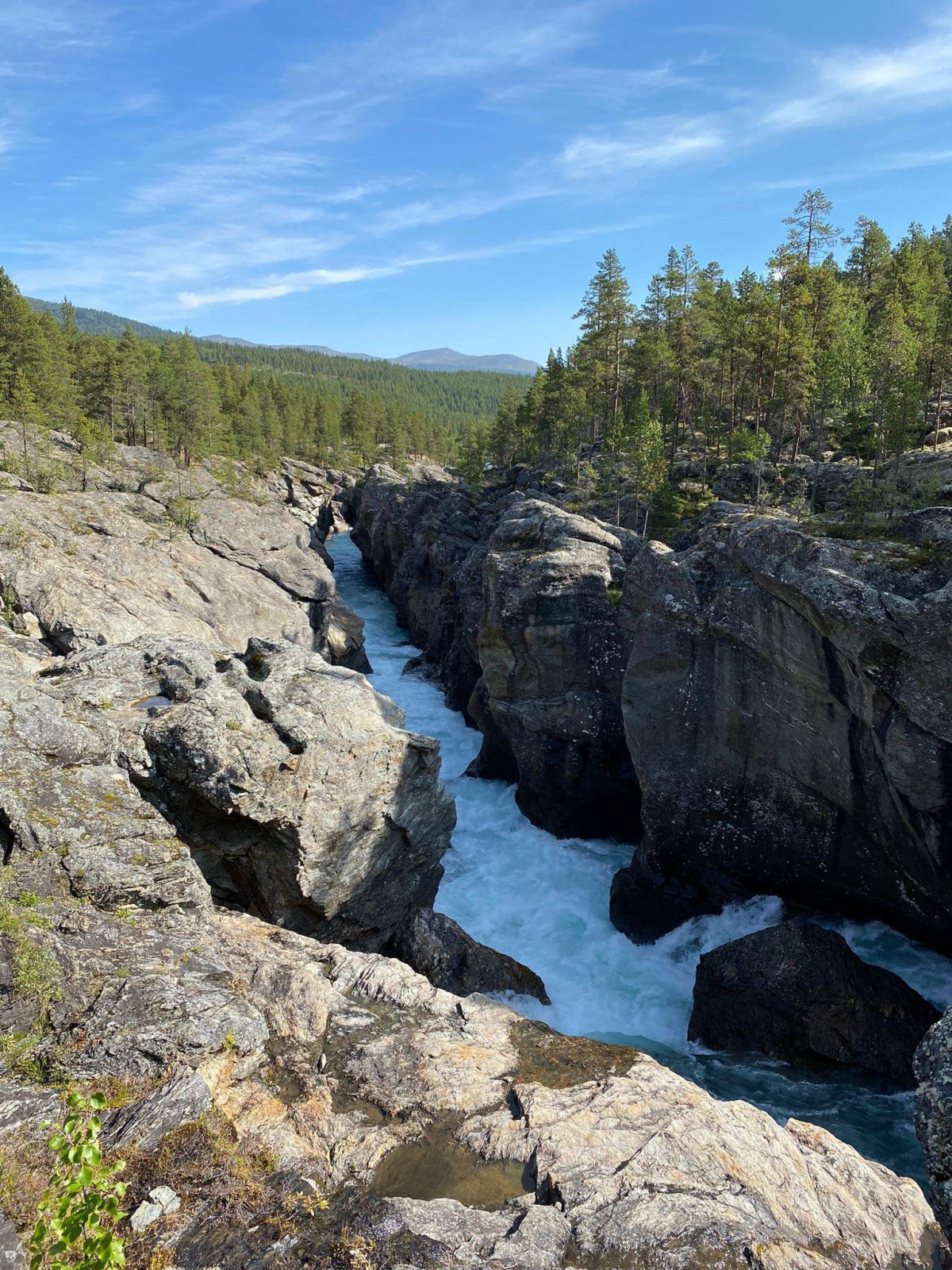 Balíme věci, stany a vše co tu máme, abychom po nás nenechali žádnou stopu a skoro v čase oběda teprve vyrážíme do kaňonu. Lucka nám tu vypráví hrozně pěknou legendu, která se s tím kaňonem pojí. Hrozně moc bych si jí chtěla zapamatovat a napsat jí tu, ale mám v hlavě plno jiných nesmyslných volovin a tak si bohužel tuhle krásnou legendu nepamatuju. Kaňon je tu teda fakt krásnej. Kolem kaňonu je spousta stromů, je krásný počasí, možná až horko. Začínám fakt litovat toho, že jsem si sem nevzala kraťasy a víc letního oblečení. Je ještě pořád srpen. Ale já jela do upršenýho Norska. Soustředila jsem se spíš na teplé oblečení, na co nejvíc nepromokavého a tak. Dneska je tu ale vyloženě letní den. A tak za svitu slunce poskakujeme po okolních skalách, které obepínají ten krásnej kaňon, fotíme se na každém rohu a moc si to užíváme.