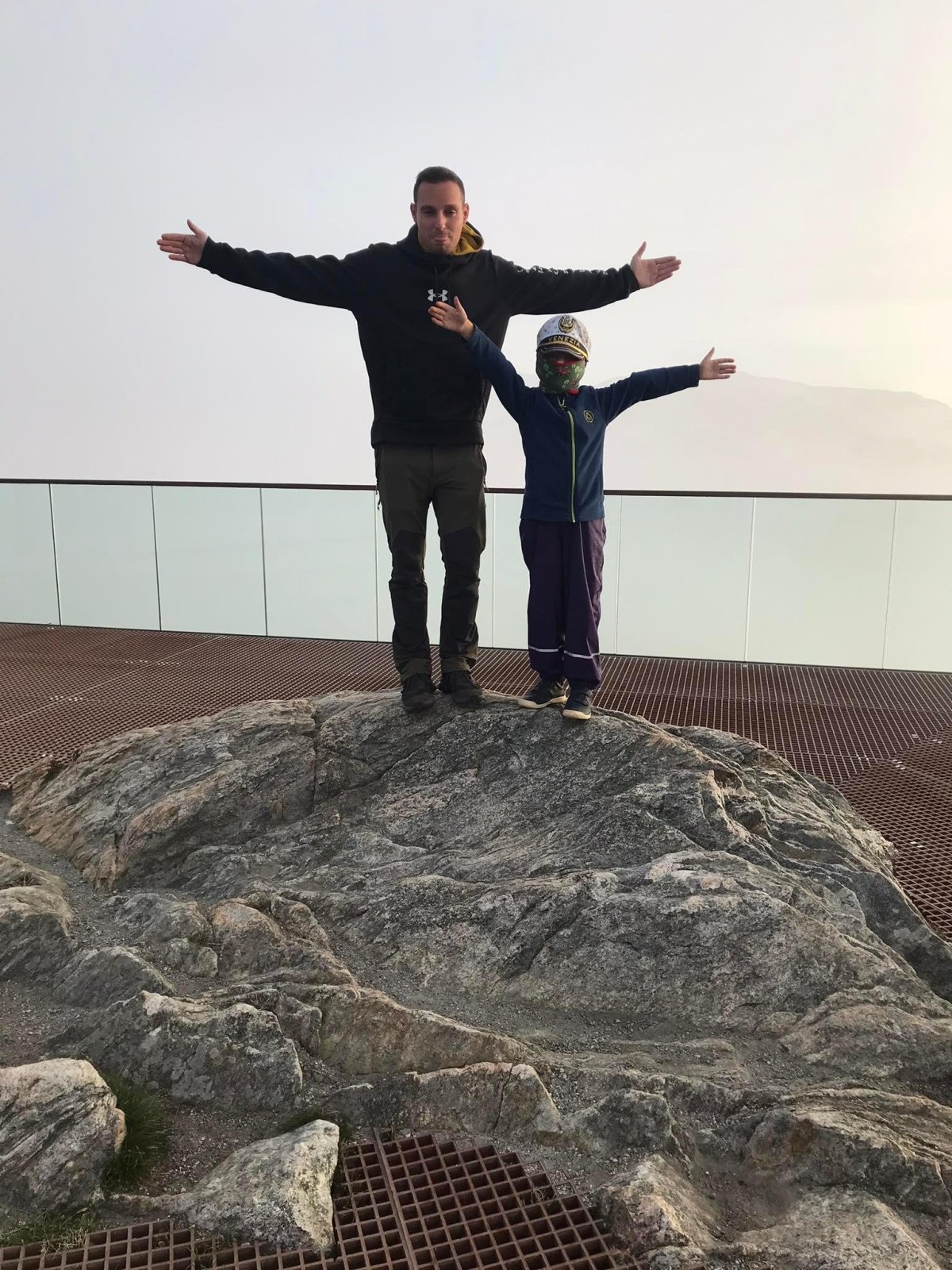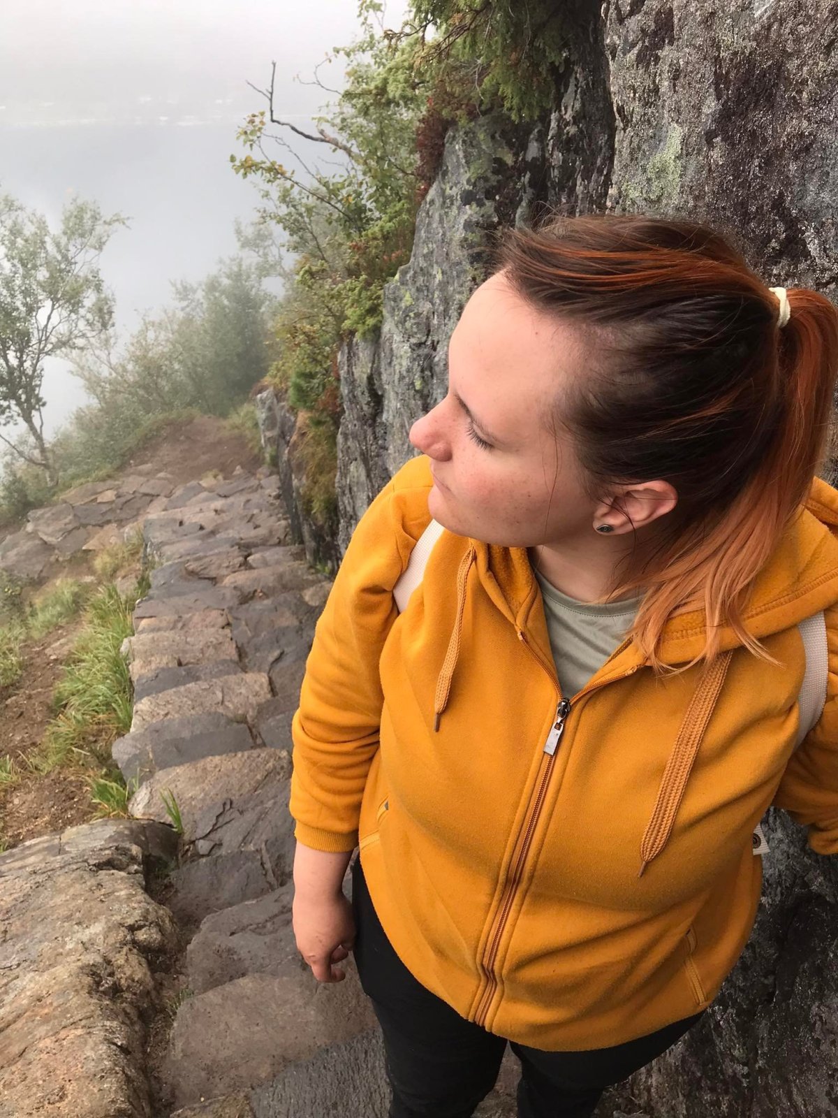 Ráno se bohužel předpověď naplnila a počasí je poprvé fakt na draka. V noci bylo díky mrakům teplíčko. Ráno bychom ale chtěli sluníčko. Bohužel máme smůlu a vrcholky hor jsou v mracích. Vyrážíme tedy do městečka Andalsnes, poblíž kterého jsme dnes přenocovali a vyrážíme na kopec. Tomáš mi opět půjčil hůlky a je to pecka, začátek kopce vypadá na příjemnou procházku a víme, že oproti prvnímu treku tohle bude jednodušší. Takže i když výhledy nebudou takový jaký jsme všichni doufali, jsme s Julčou odhodlané to tentokrát dát až nahoru. Čeká nás cesta něco přes 2 kilometry nahoru na vrchol. To se zdá jako pohodička, co se dá zvládnout za dvě hoďky. Ha! Chyba lávky! Vyrazily jsme se ségrou na kopec jako první. Ostatní moc nespěchají. Stejně je všem jasný, že nás dřív nebo později doženou. První přiběhne Tom. Doslova a bez přehánění fakt v podstatě přiběhl. My si dáváme co chvilku pauzu a on to běží? Sakra jsme hrozný lemry :D. Chvilku z úcty k nám jde s námi pomalu, ale je mi jasný, že ho zdržujeme, chvilku si povídáme a Tomáš běží dál. Postupně nás takhle předběhne celá banda. Ostatní teda neběží. Jdou více méně jen o něco rychleji jak my. Jenže pro nás je to tempo maximální a furt si dáváme pauzičky. Ostatní ty pauzy dávat nemusí a spíš je to pro ně procházka, než výšlap. Zhruba po dvou, nebo třech hodinách přicházíme na vyhlídku Rampesterken. Bohužel jsme už ale v takové mlze, že o výhledu se tu nedá mluvit. Dle recenzí je tohle nejhezčí výhled v okolí a jeden z top výhledů celého Norska. No my vidíme sotva na pár metrů. Což je nám líto, ale na tomhle kopci si zároveň uvědomujeme, že nás chození vlastně baví a užíváme si to, což je teda v mém případě obrovská změna. Jen škoda, že ostatní celkem zdržujeme. Další hodinu se drápeme na úplný vrchol. Poslední část jdeme do brutálního kopce, povětšinou po kamenných schodech. Každý samozřejmě jinak vysoký a cesta je pro nás extrémně náročná. Občas jsou ty schody po kolena, občas mi jsou spíš do pasu :D. Víme, že dolů tohle určitě jít nechceme. Kvůli mlze je to kluzké a srázy jsou tu takové, že nevidíme kolikrát ani kde končí.