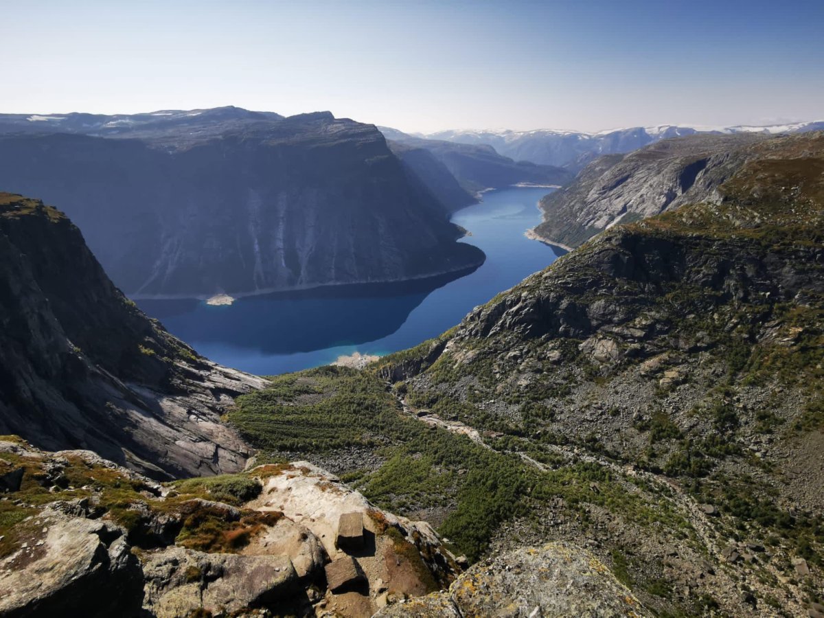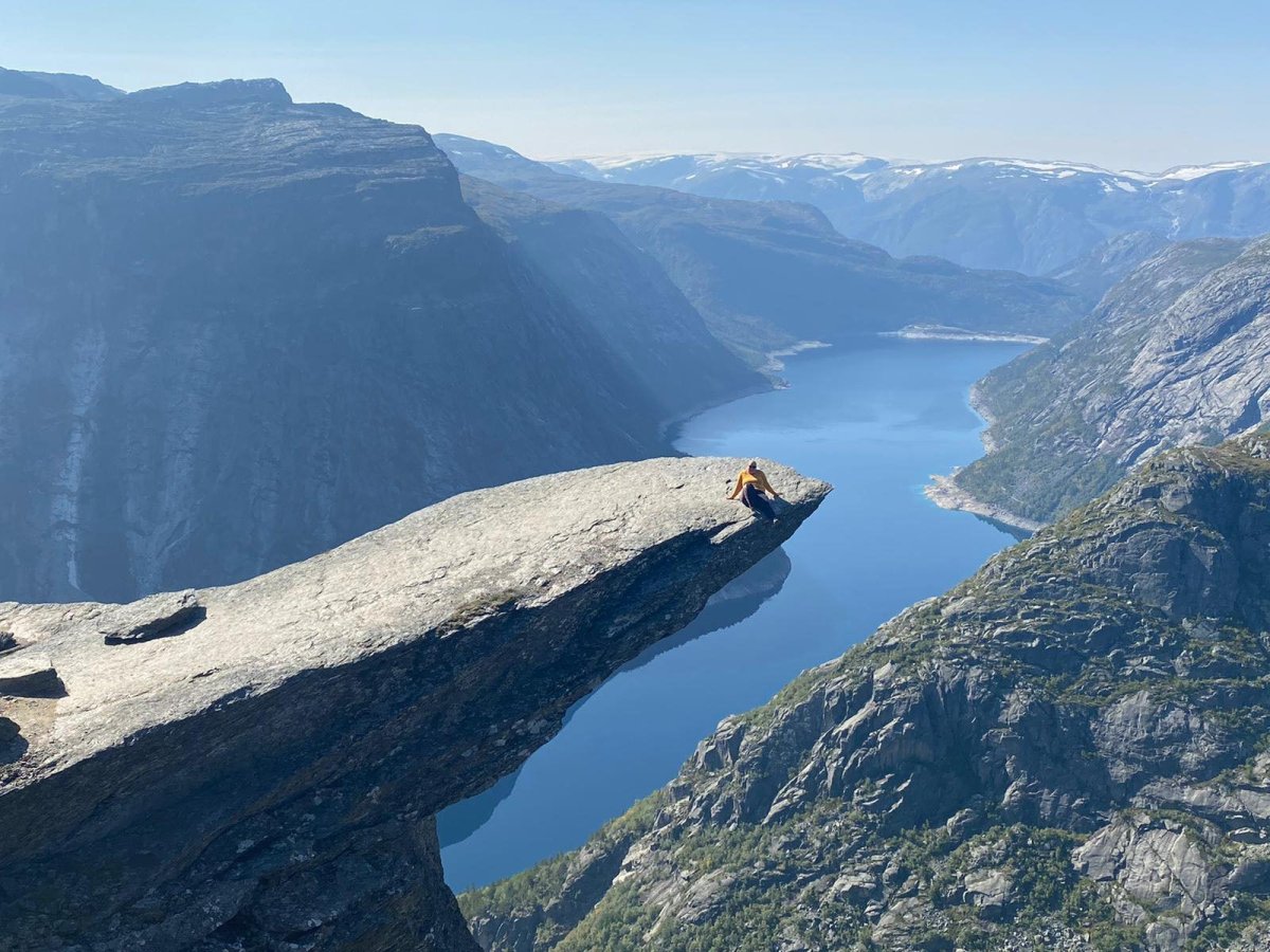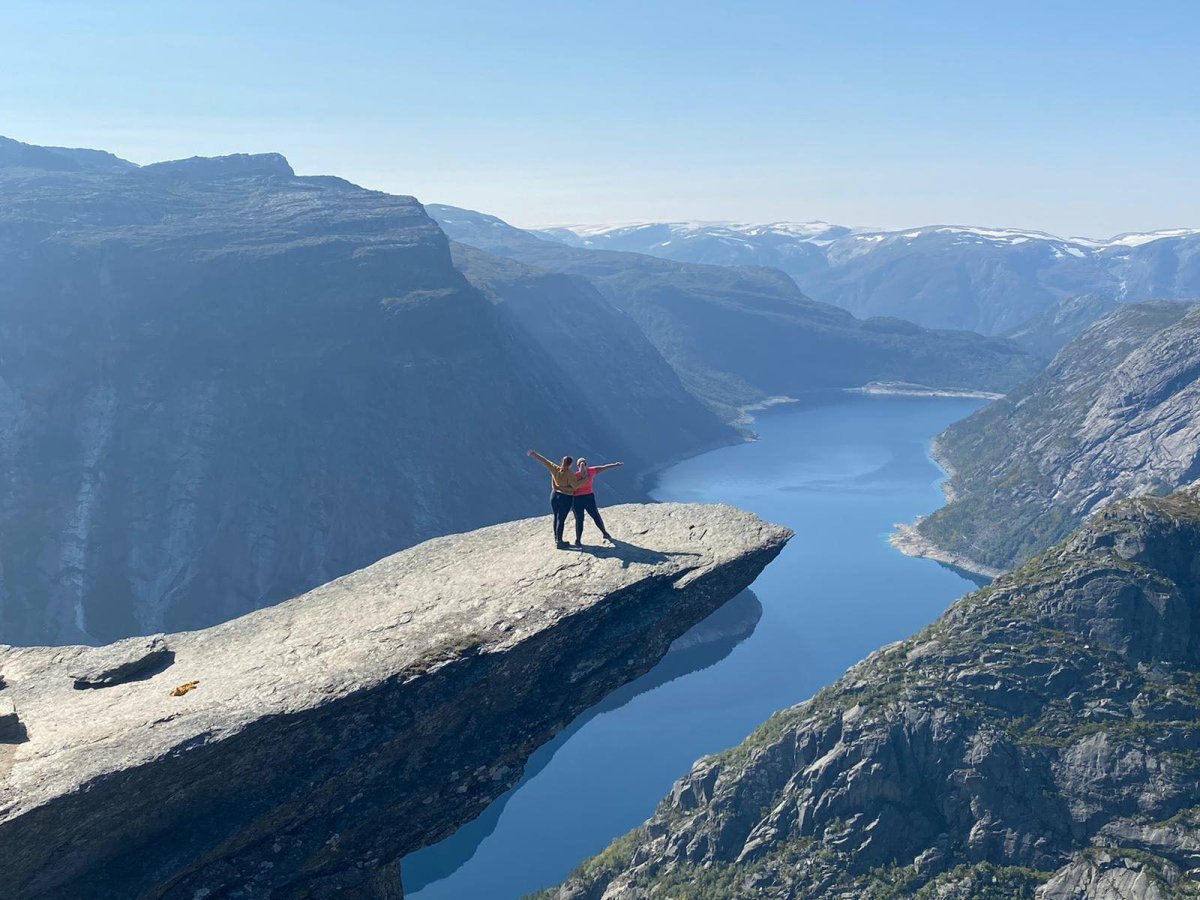 Je 6:30 ráno a fakt se mi strašně nechce z postele. Ale moc se těším na to, co dneska uvidíme :). Museli jsme kvůli tomu upravit plán cesty. Původně jsme dnes měli přespat kousek od Bergenu a dnešní den strávit tam. Ale předpověď počasí na dnešek hlásí perfektní počasí a zítra má být už ošklivo. Takže Bergen necháváme na nějakou jinou dovolenou v budoucnu a vyrážíme na Trolltungu. Jsou zde 3 parkoviště. To nejblíž vrcholu je plné už od brzkého rána a my tak zůstáváme na tom druhém. Odtud je možné jít rovnou pěšky, nebo těch nejvíc nepříjemných 400 výškových metrů ujet busem. Já ani Julča neváháme a jedeme busem. Stejně budeme i tak poslední nahoře :D. Asi 5 lidí od nás to jde pěšky. Ostatní jedou s námi busem. Ani ten mimochodem nejde zaplatit hotově.