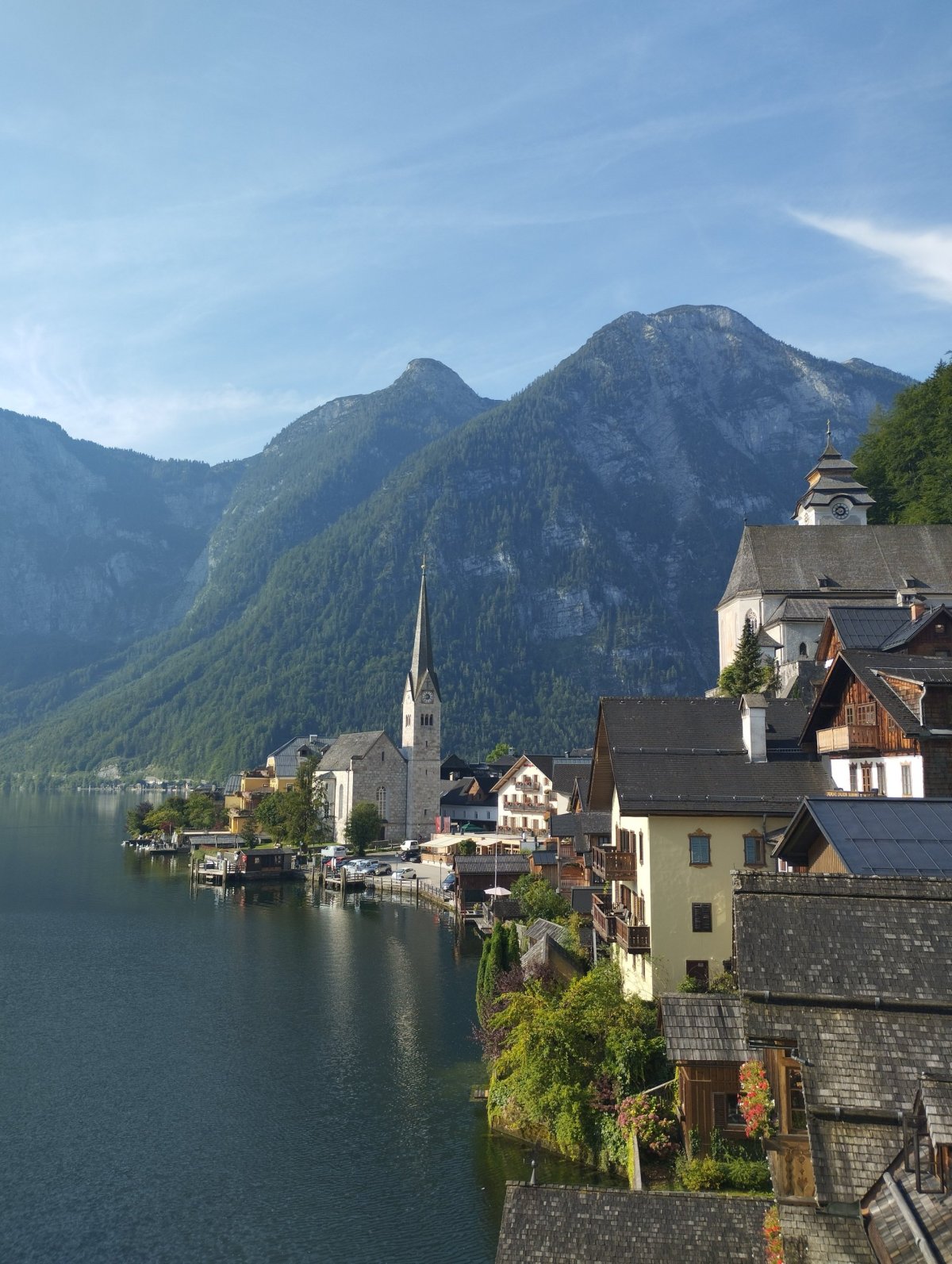 Krásné městečko Hallstatt nemohlo na našem seznamu prostě chybět navíc když jsme bydleli jen asi 10 km od něj. Nicméně jsem ze všech stran slyšel, že je extrémně turistické, takže jsme zvolili termín na návštěvu v pondělí brzo ráno, což se ukázalo být ten nejlepší nápad. Vyfotili jsem se na klasické vyhlídce, kde se shrocovalo větší množství lidí, ale našli jsme i místa, která jsme měli jen pro sebe. Odjížděli jsme okolo půl desáté a v tuto dobu už se městečko poměrně dost plnilo stejně jako přilehlá parkoviště. Odjíždíme asi 4 km před Hallstatt do místa zvaného Öffentliche Badefläche Gosaumühle (parkoviště s WC a travnatou pláží na břehu jezera). Nafukujeme paddleboardy a vyrážíme po vodě zpět směr Hallstatt, který si chceme prohlédnout i z vody. Toto jezero je poměrně hluboké, má od pohledu tmavší a studenější vodu, ale kvůli okolí má smysl sem rozhodně vyrazit. Všude kolem se zdvihají do výšky strmé skály a nedaleko od nás se vypíná i ledovec Dachstein (2995 metrů nad mořem). U Hallstattu si dáváme sváču na vodě, relaxujeme, kocháme se výhledy a po chvíli vyrážíme zpět k parkovišti.